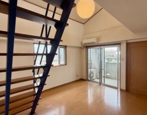 螺旋階段で2階に上がりますと、一番奥にございますのが広々としたLDK。