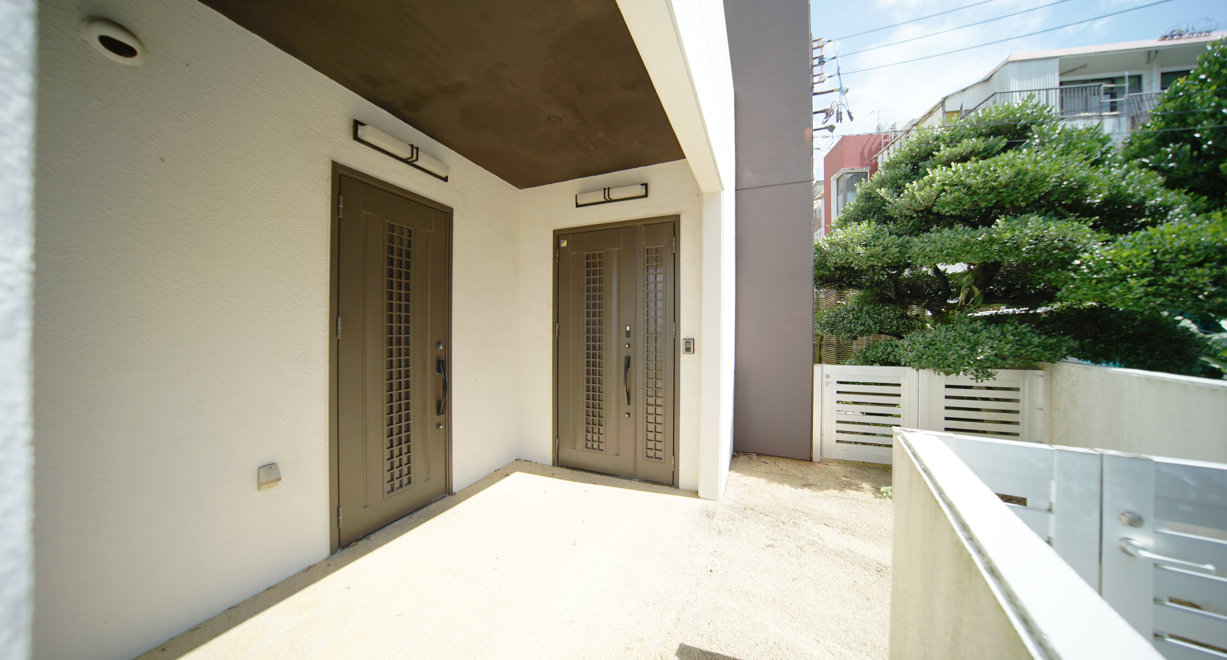 エントランスには玄関の扉が二つ。1階の独立した一世帯と、2,3階の世帯へと分かれます。