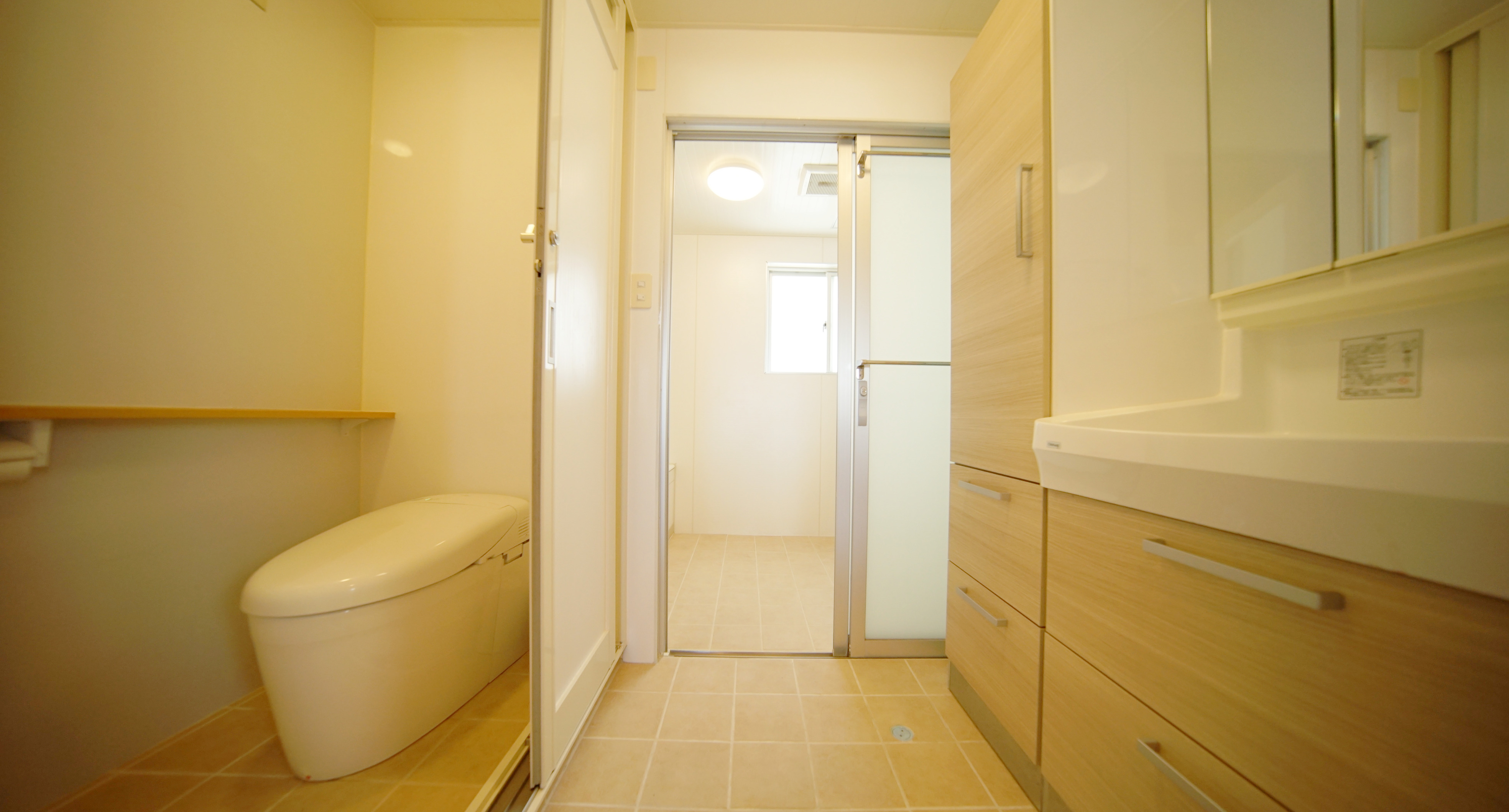 キッチン奥には、コンパクトながらこだわって作られたバス・トイレのスペース。