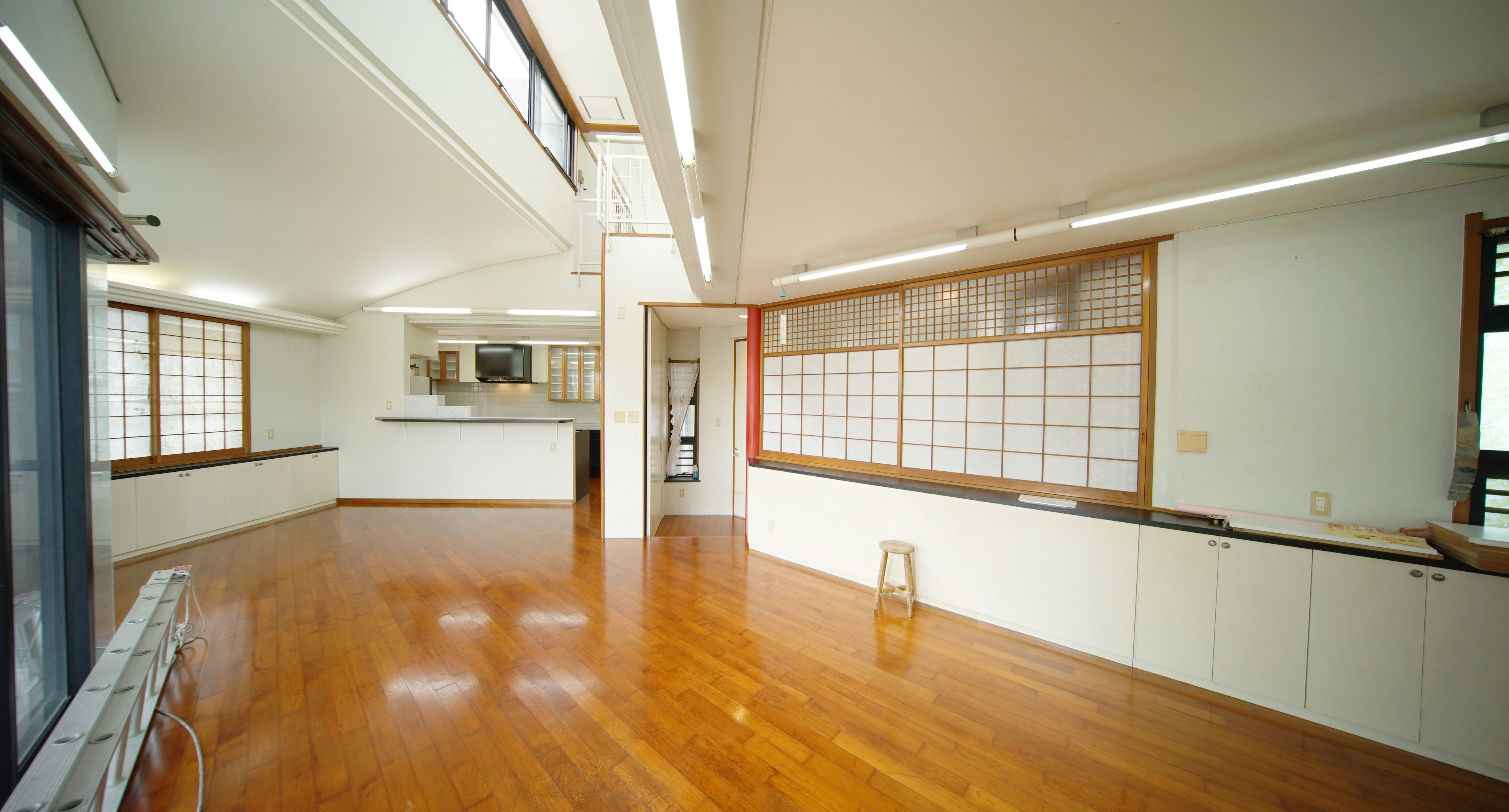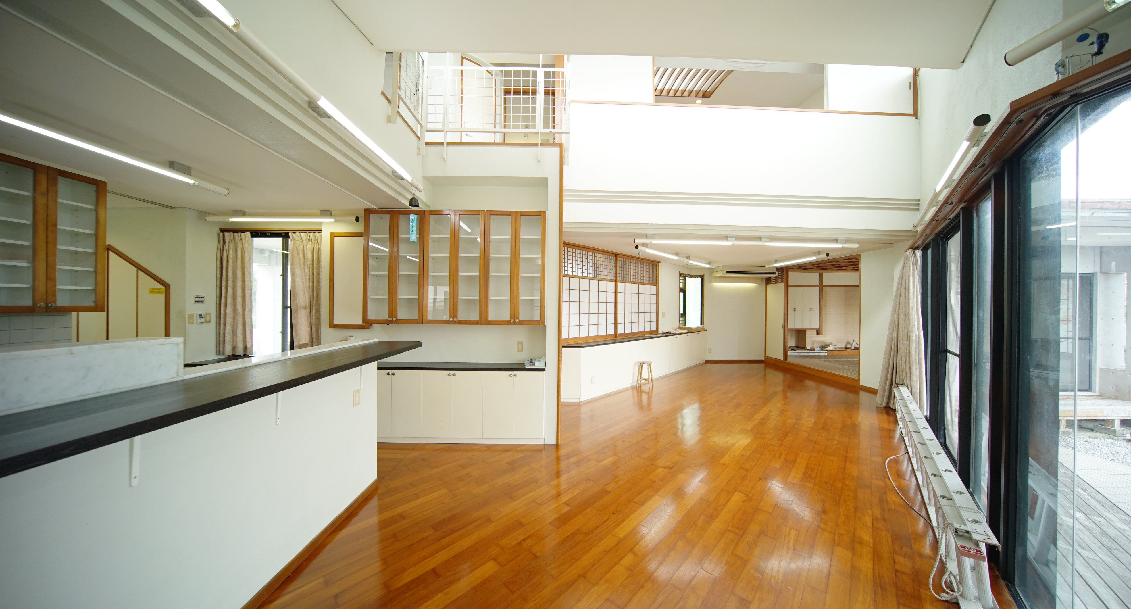 広々としたリビングは、建物内を斜めに貫き、その両脇に和室とキッチン・水回りを構えるユニークな間取り。