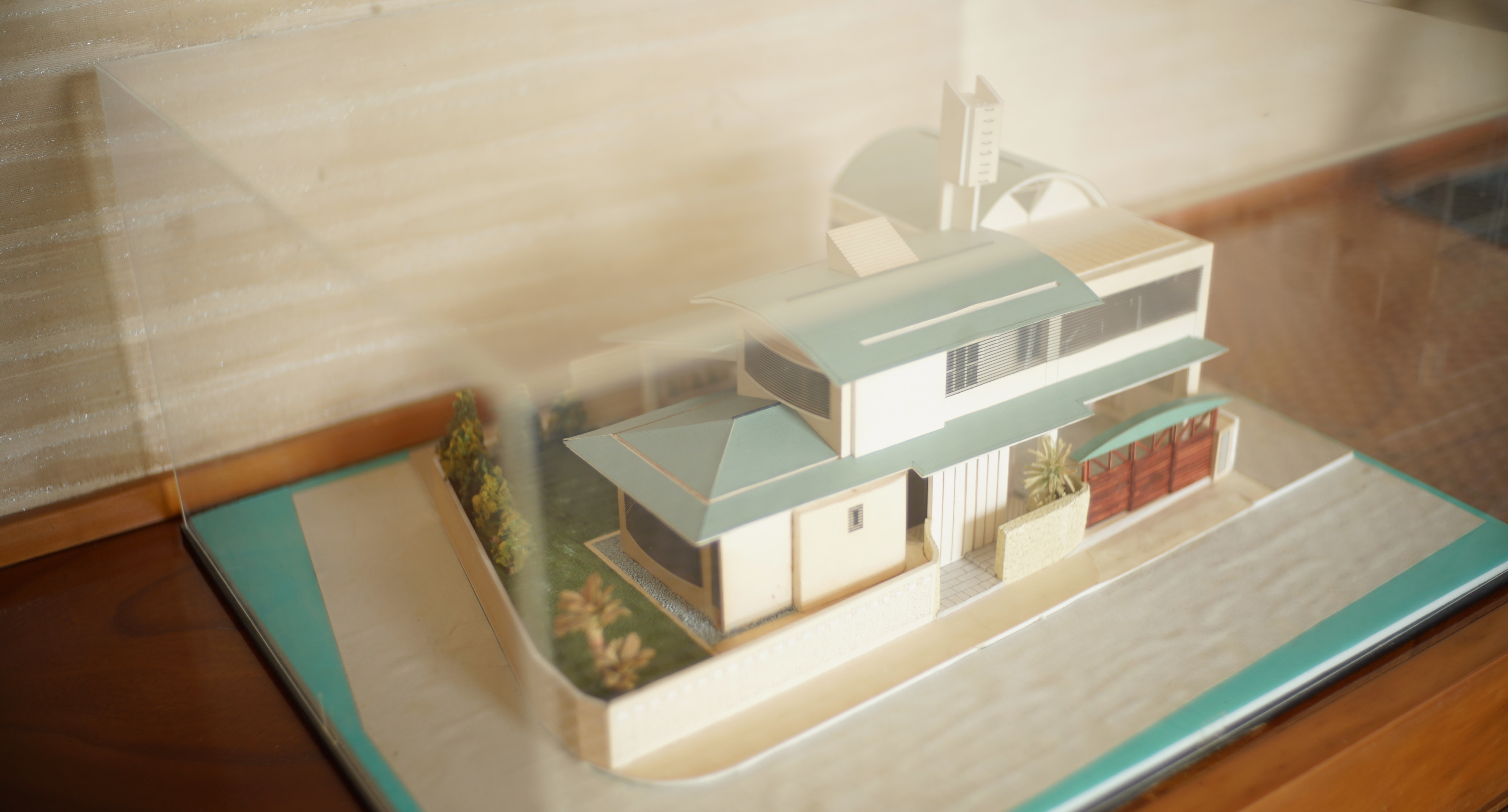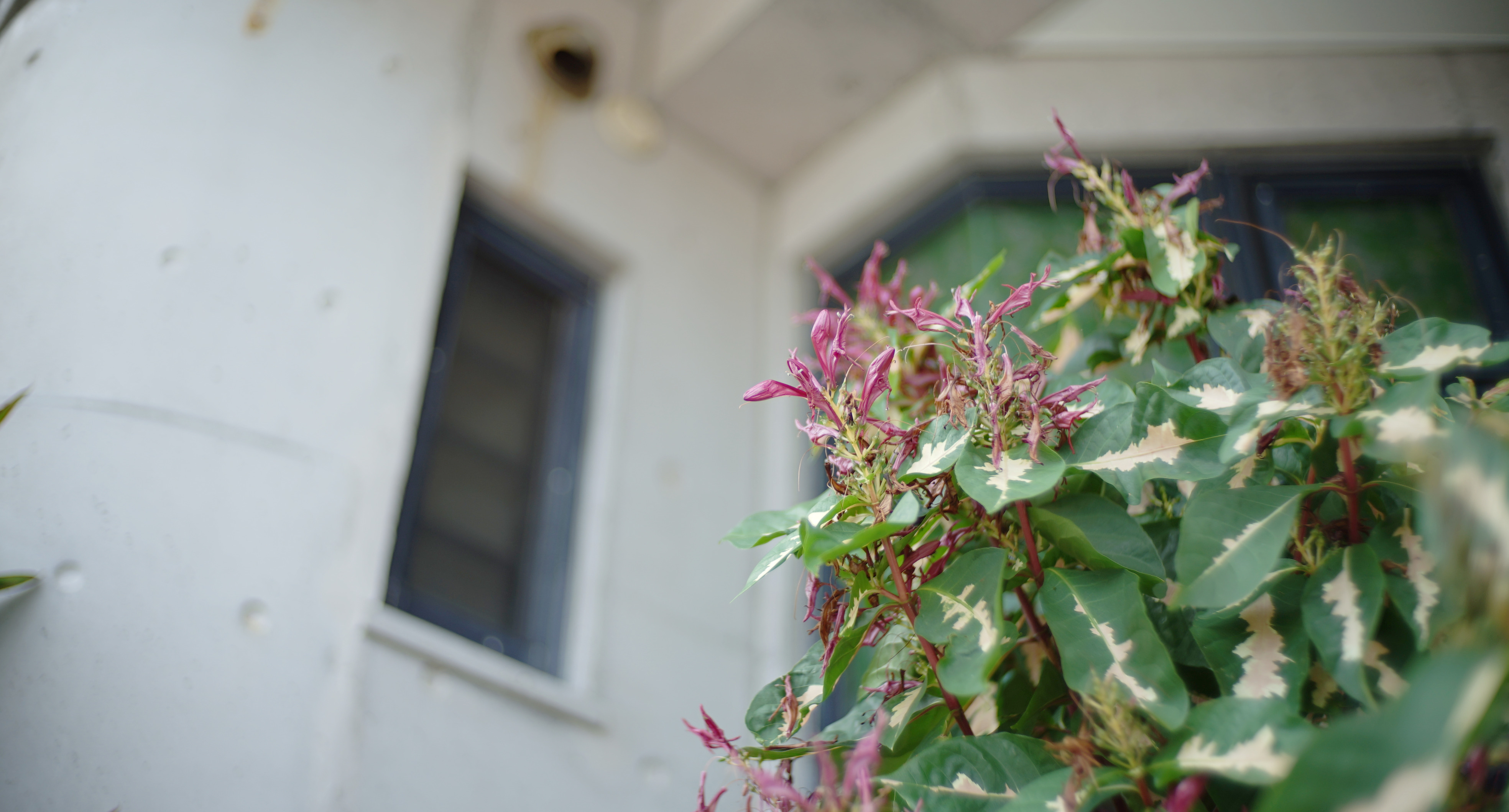 外観はコンクリート打ちっぱなしの外壁に、オレンジ色のレンガとアーチが特徴的な屋根。