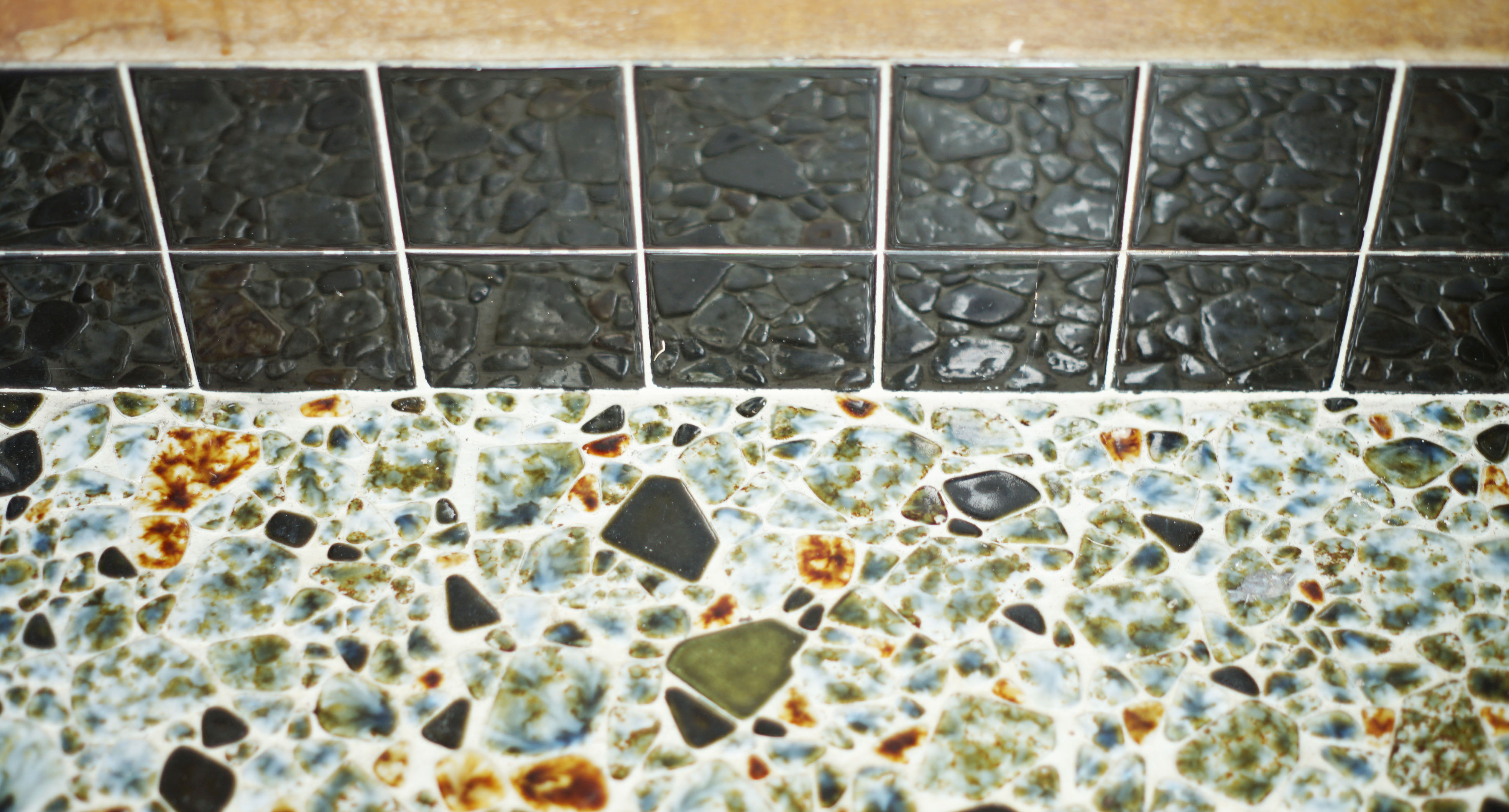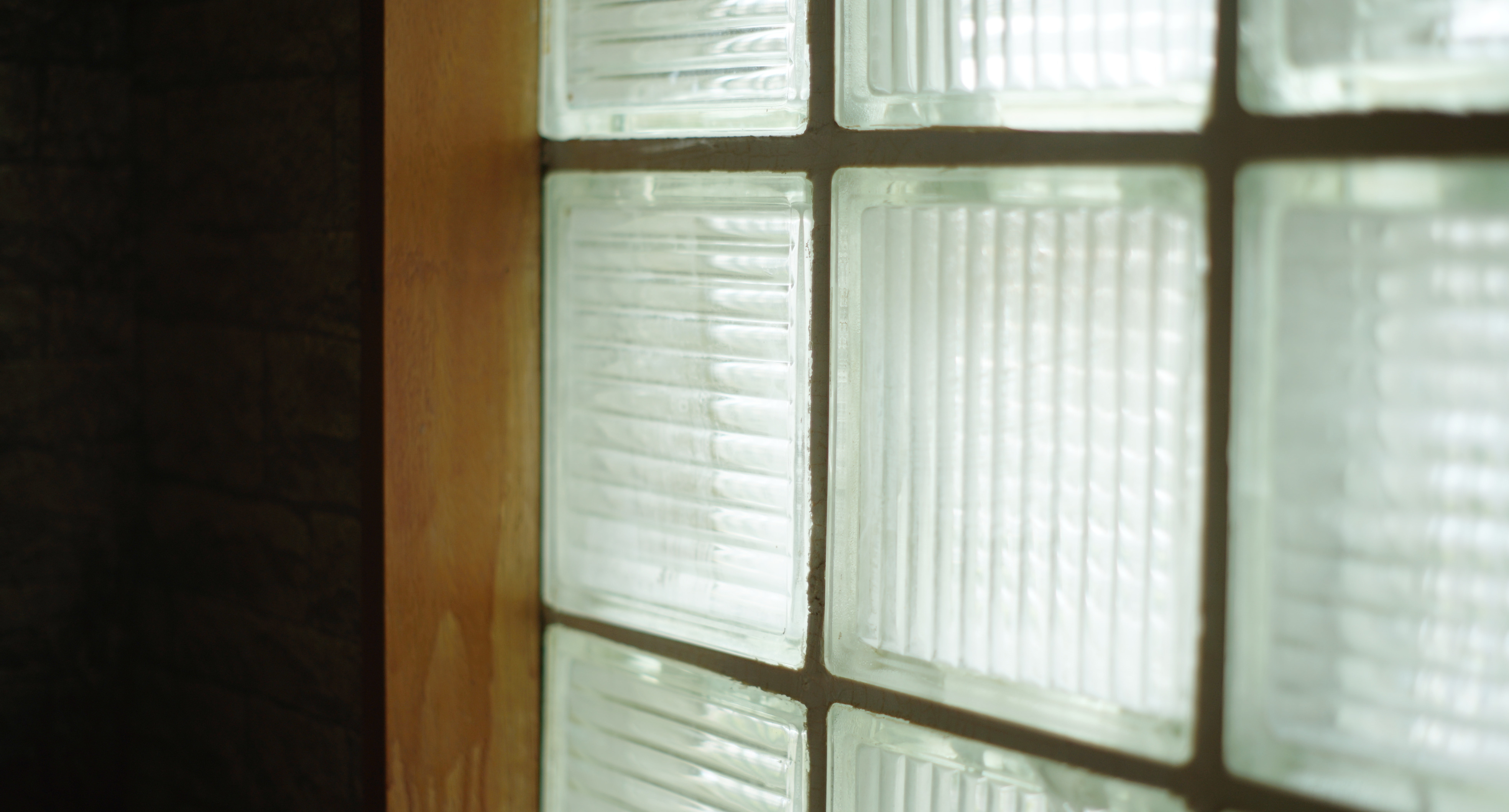 ガラスブロックのあしらわれた玄関ドアを開けると、昔ながらの玉石タイルがお出迎え。