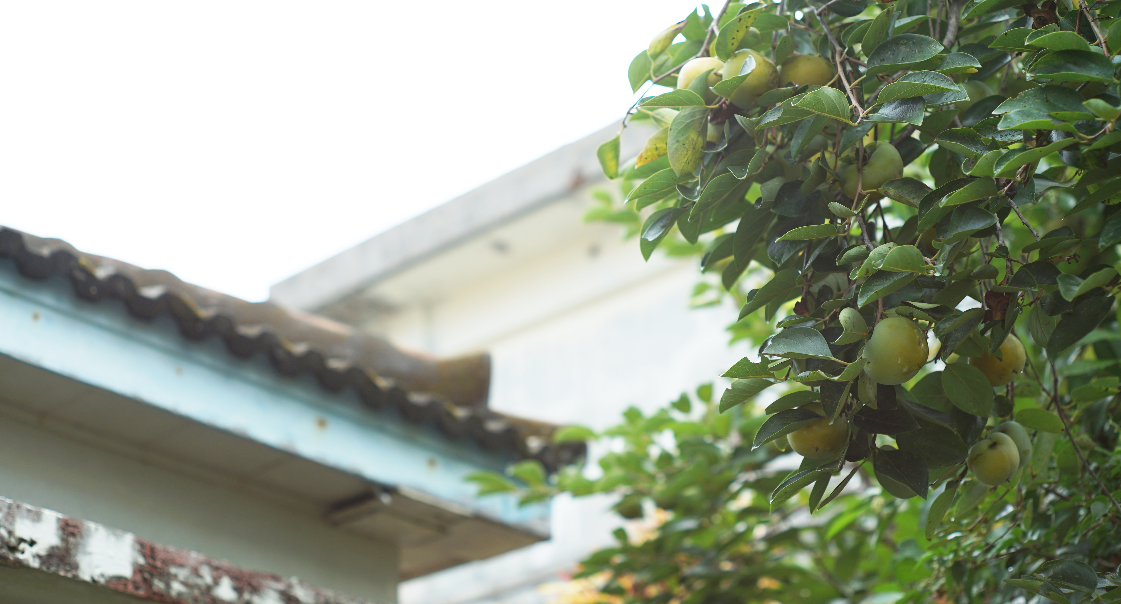 玄関横の木は、よーく見ると、…柿だよねこれ。柿の実が実っておりました。