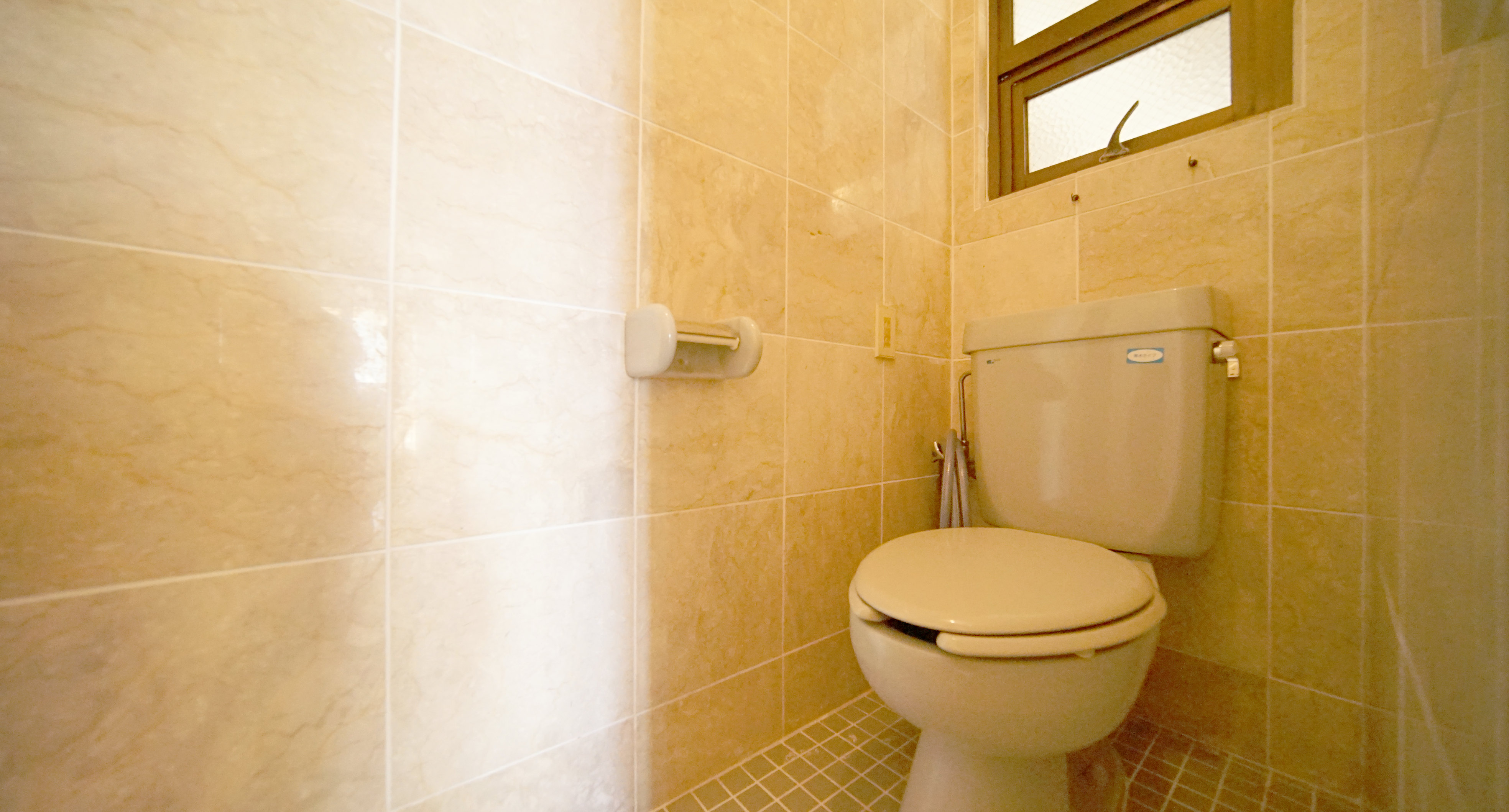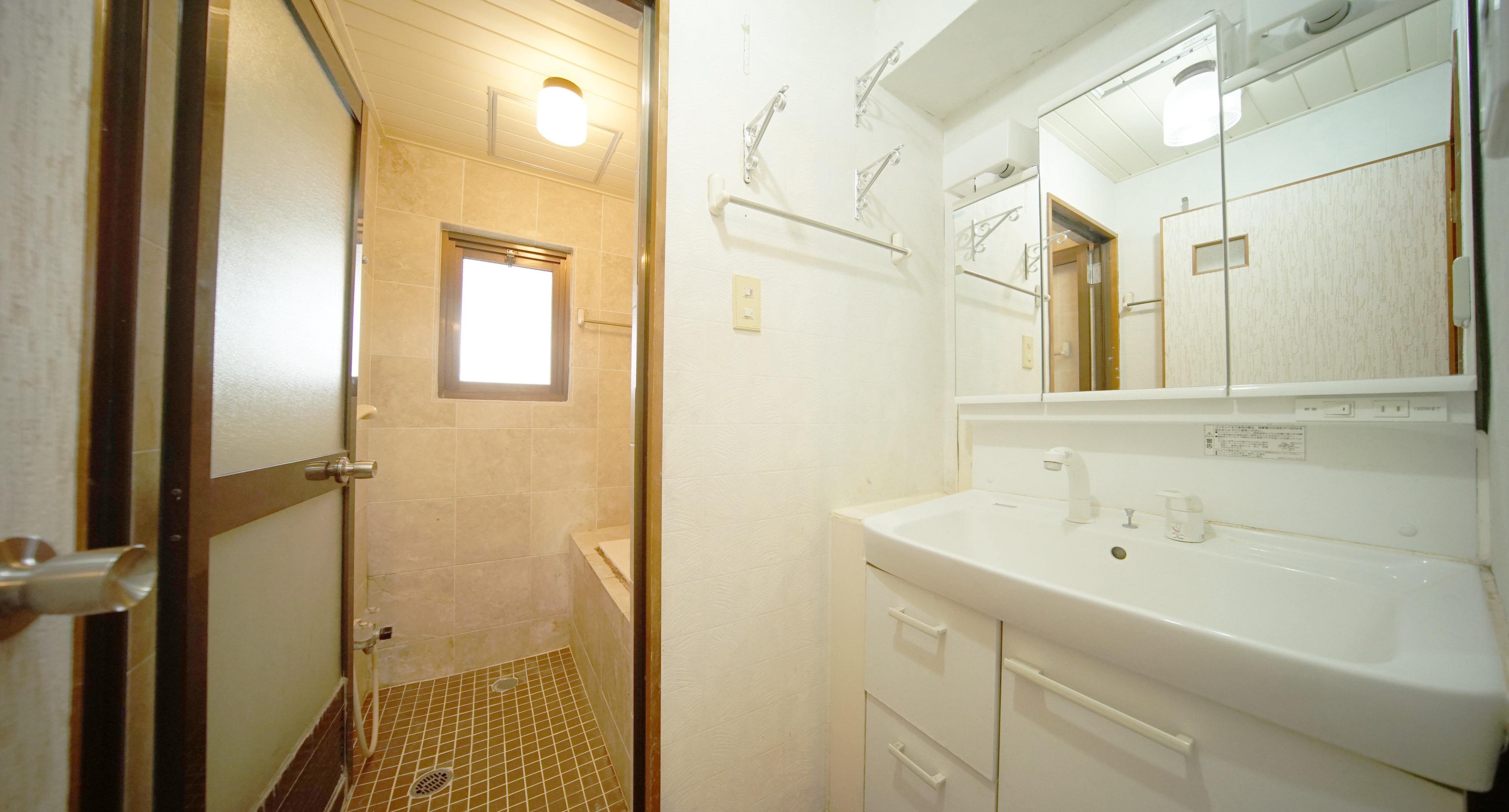 洗面台はホースタイプの蛇口のものにリフォームが施され、全体的に落ち着く色使いが特徴的な水回りとなっております。