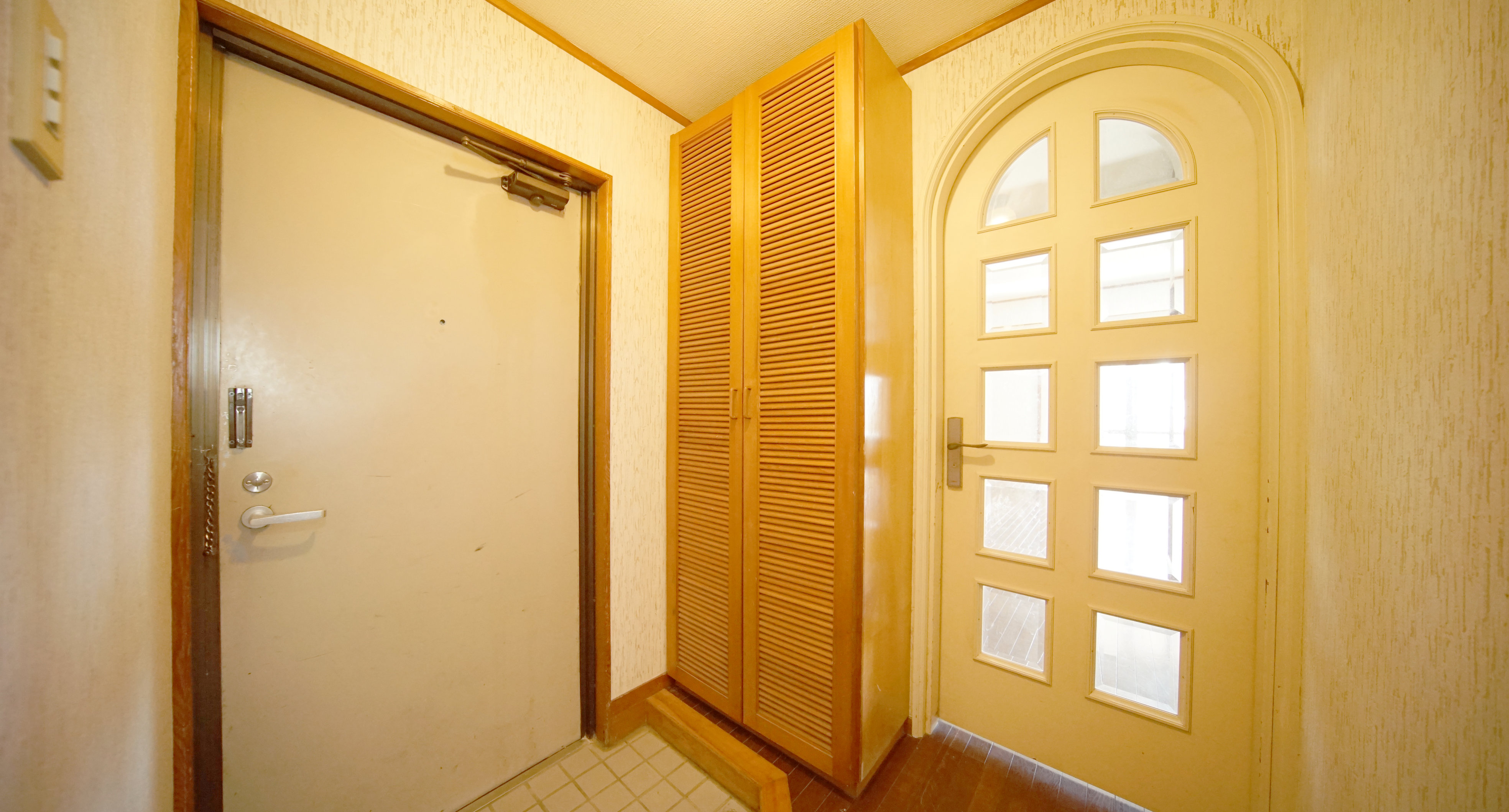 玄関を開けますと、まず目に飛び込んでくるのがアーチ型のリビングへとつながるドア。