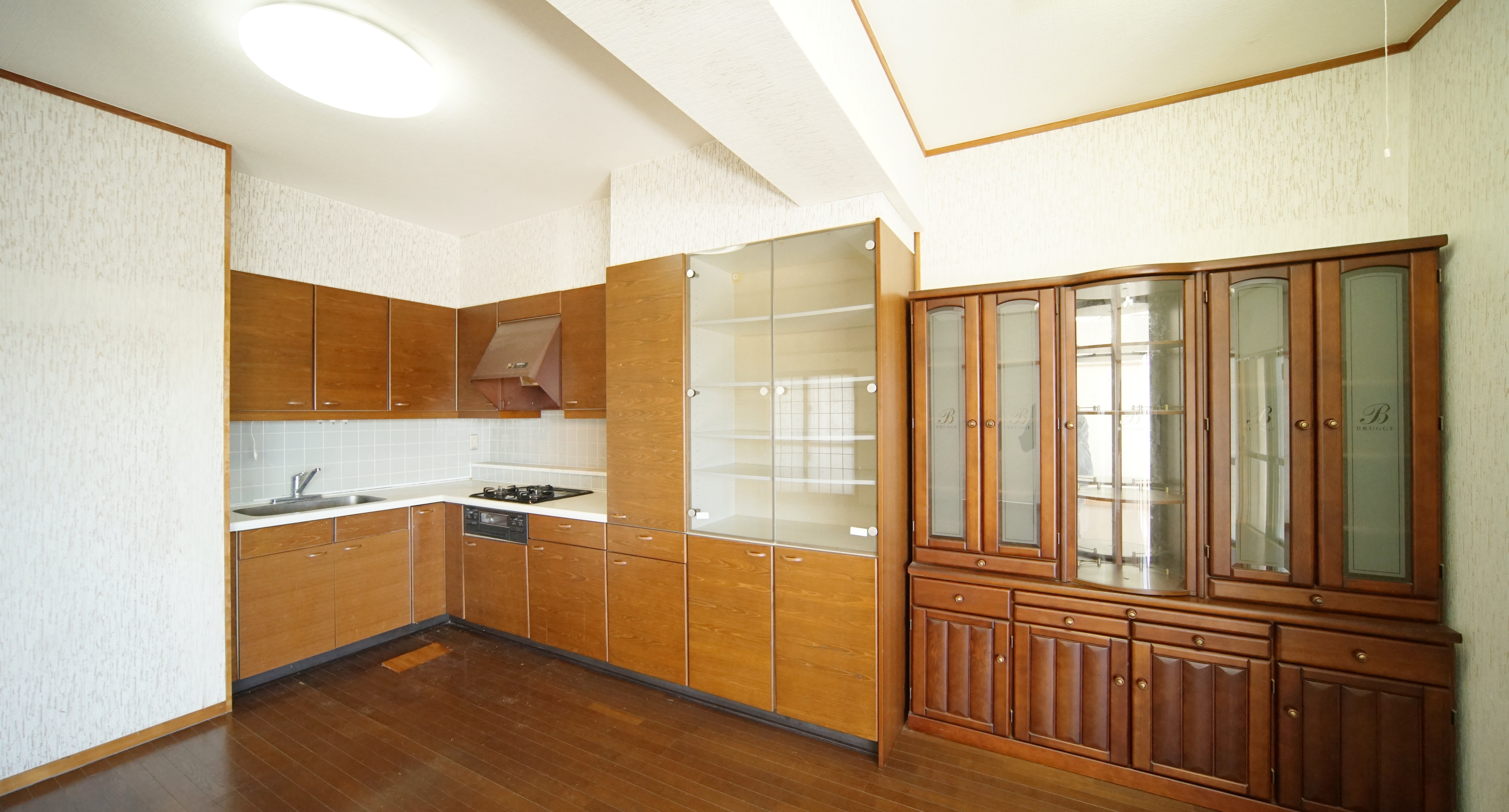 キッチンは木目のもので統一され、引き締まった雰囲気を演出します。