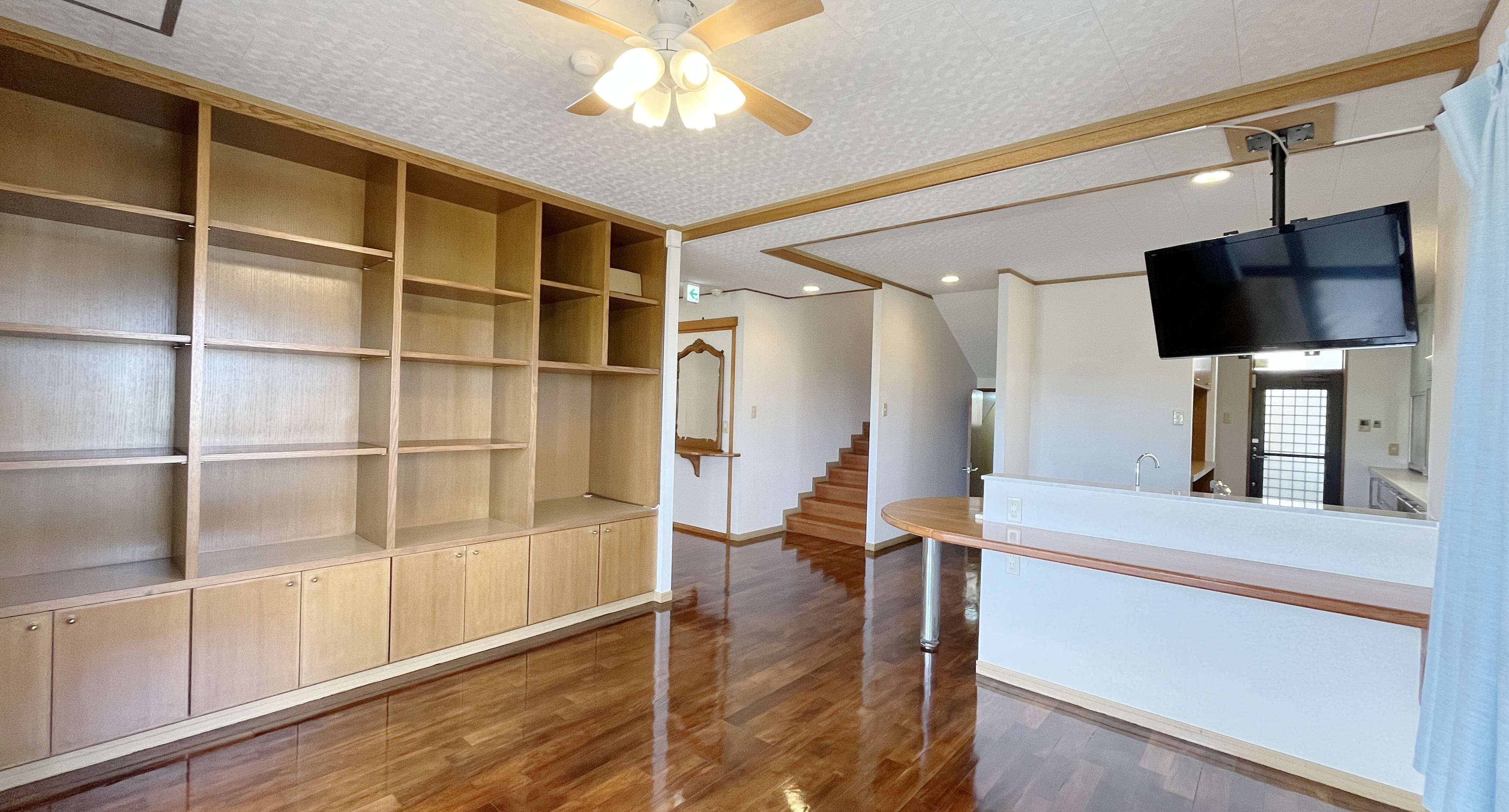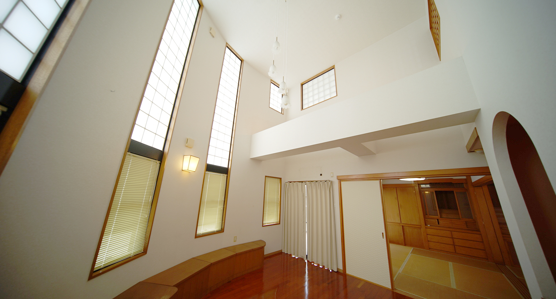 外観部分で目立っていた曲線。それを生かした、扇形のスペースに圧巻の吹抜けがございます。