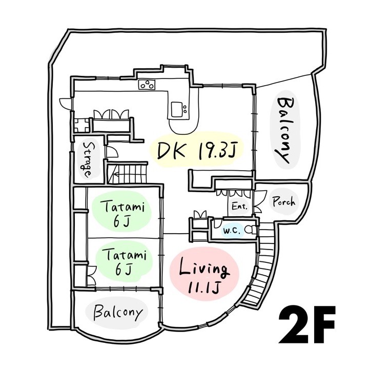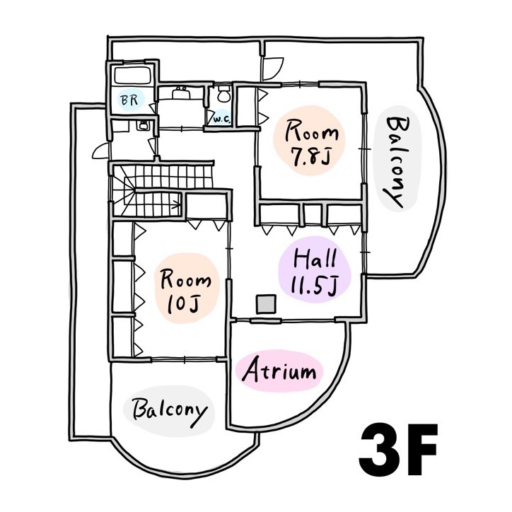 バルコニーも2,3階の各所にございますが、いずれも扇のように曲線を描いた形。