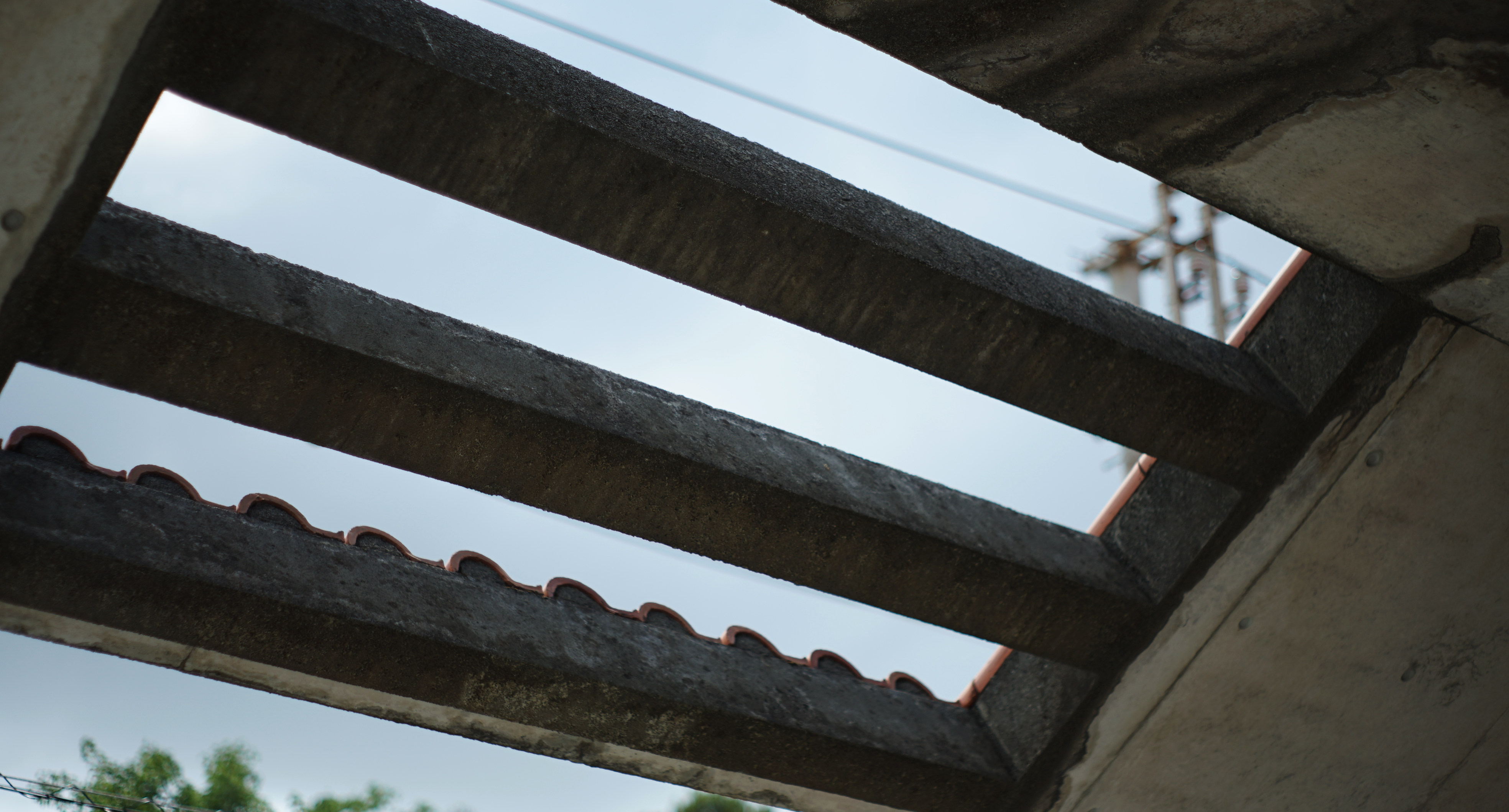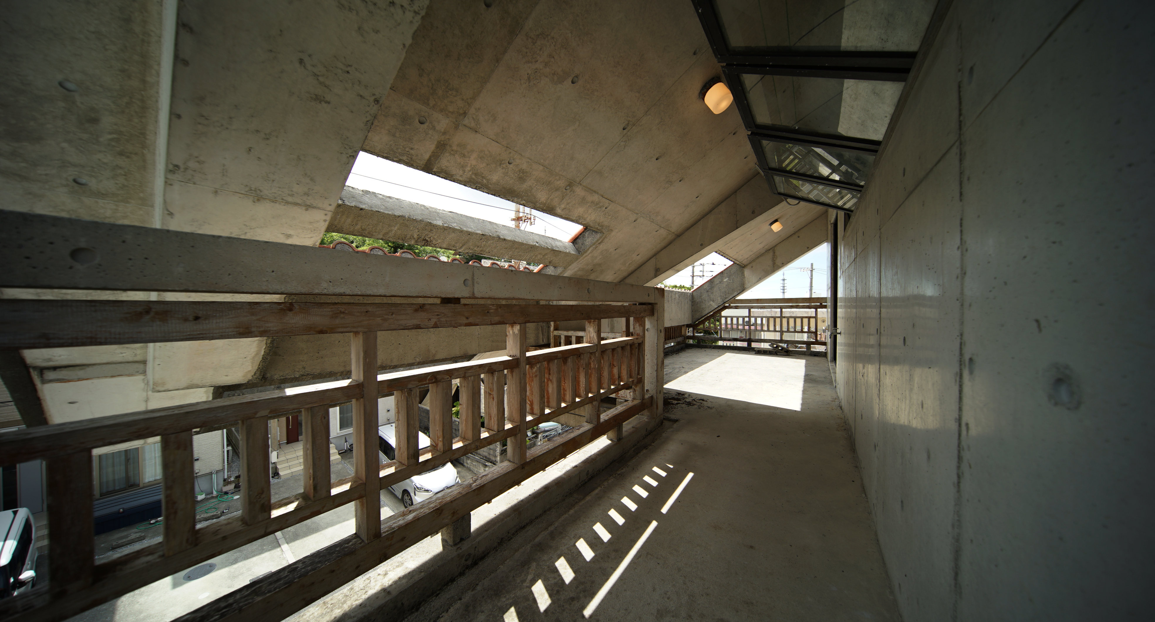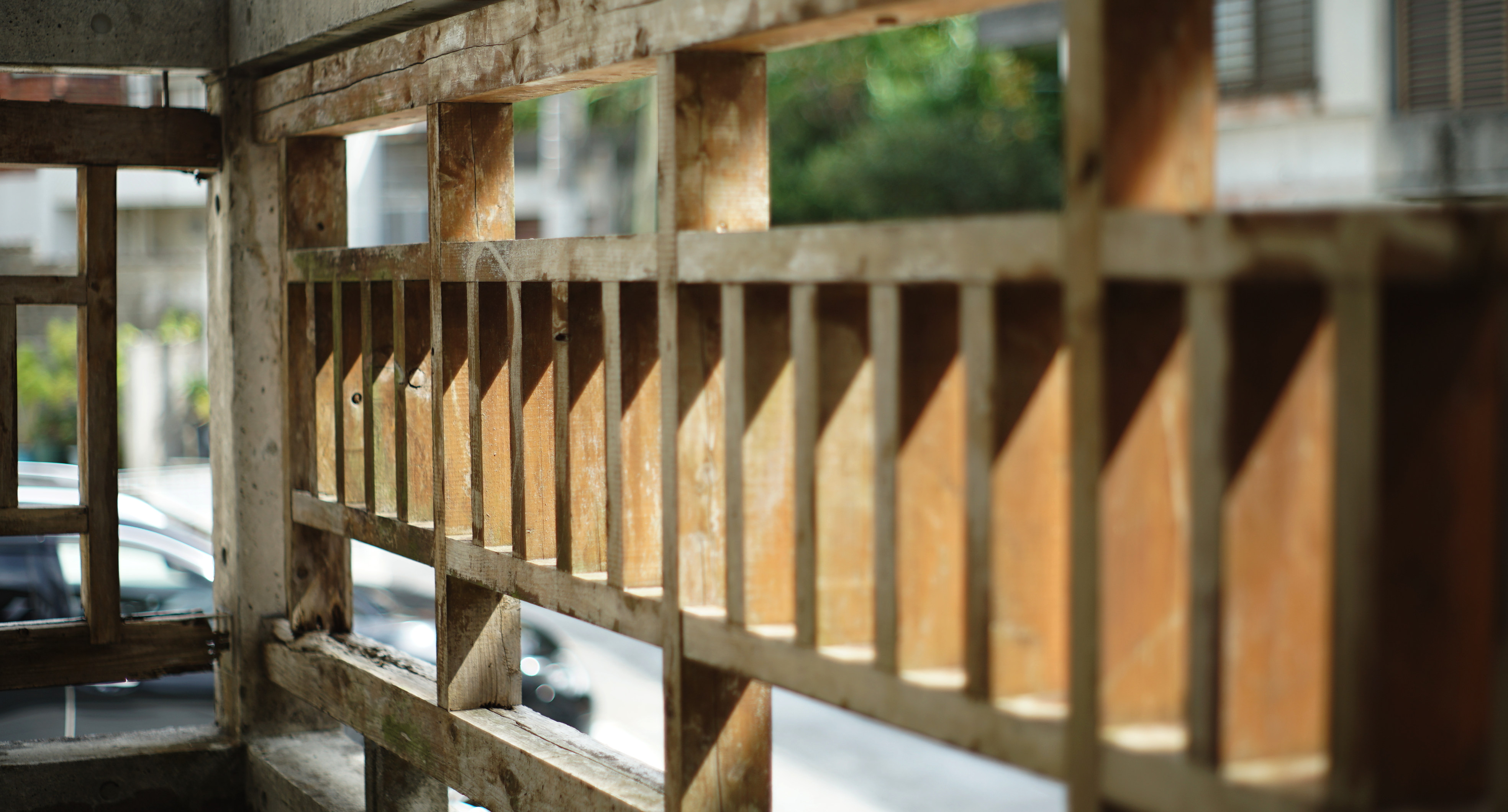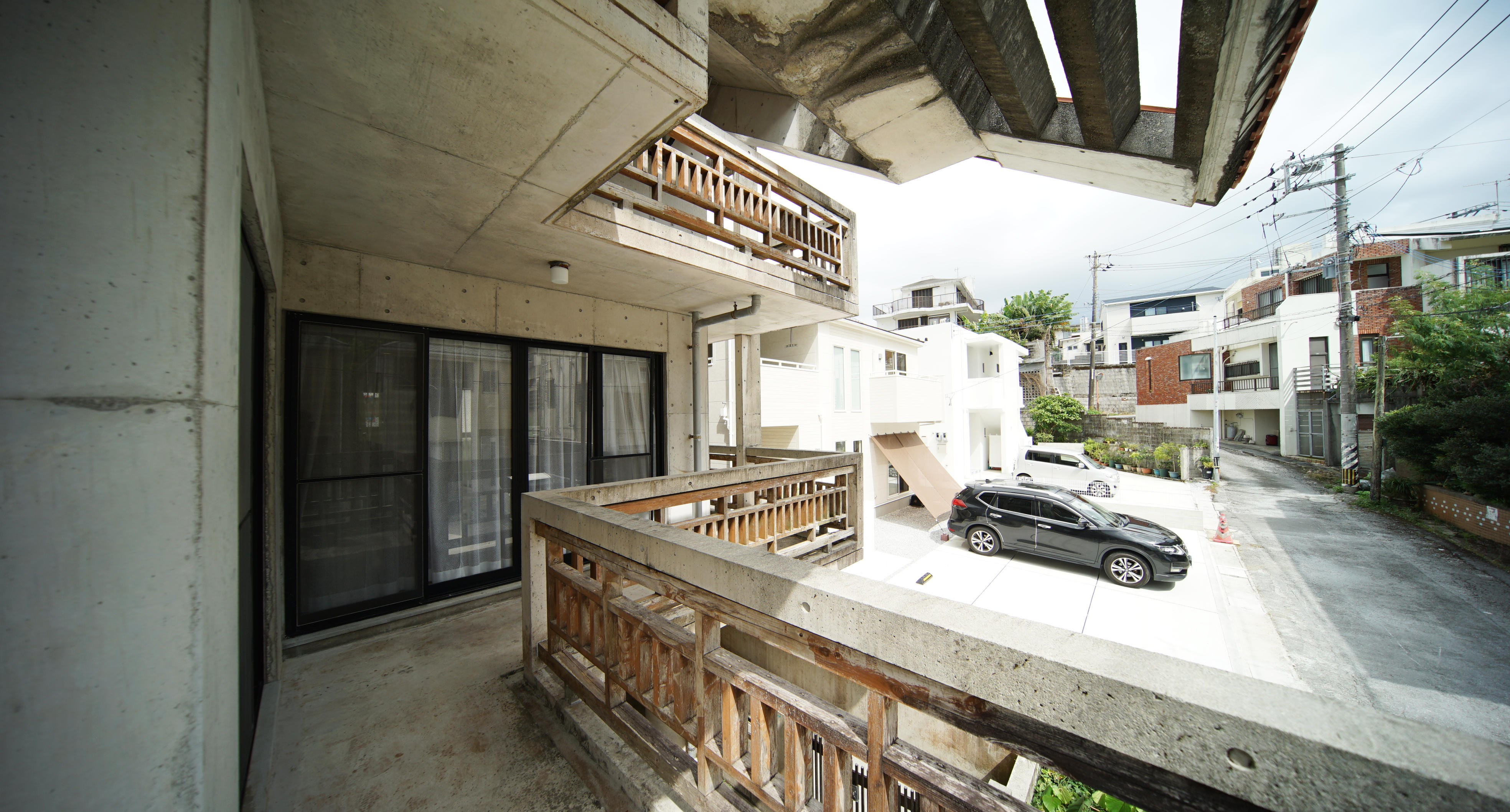 ベランダの柵はコンクリと花ブロックかと思いきや、木製の装飾が合わさったユニークな意匠。