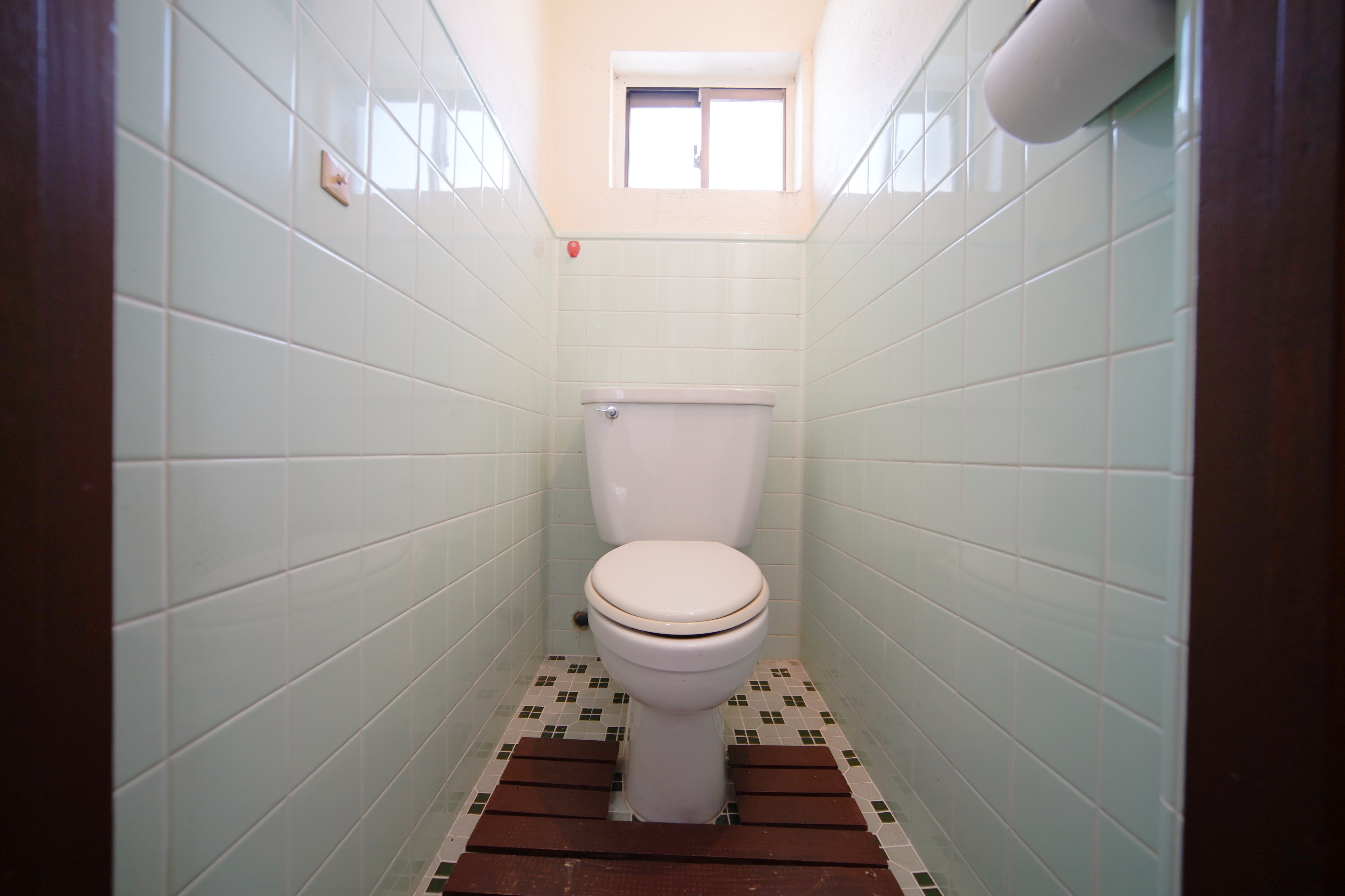 玄関ドアを開けますと、床には真っ黒タイプの丸石タイル。すぐ横にはお手洗い。なんと、洋式便器と小便器も完備。