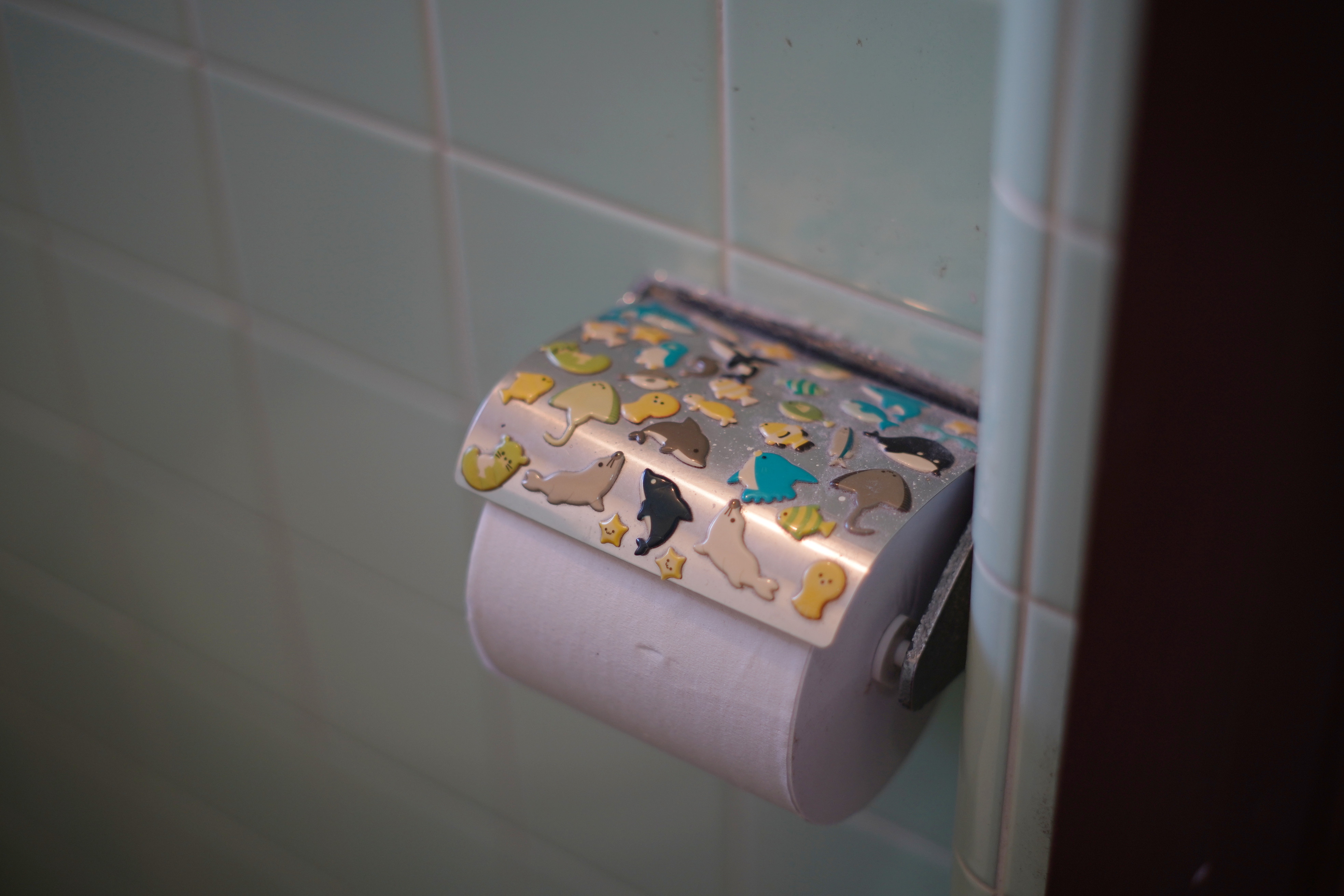 他にも、家のいたるところにステッカーが…。トイレットペーペーホルダーもすんごいデコられてました。