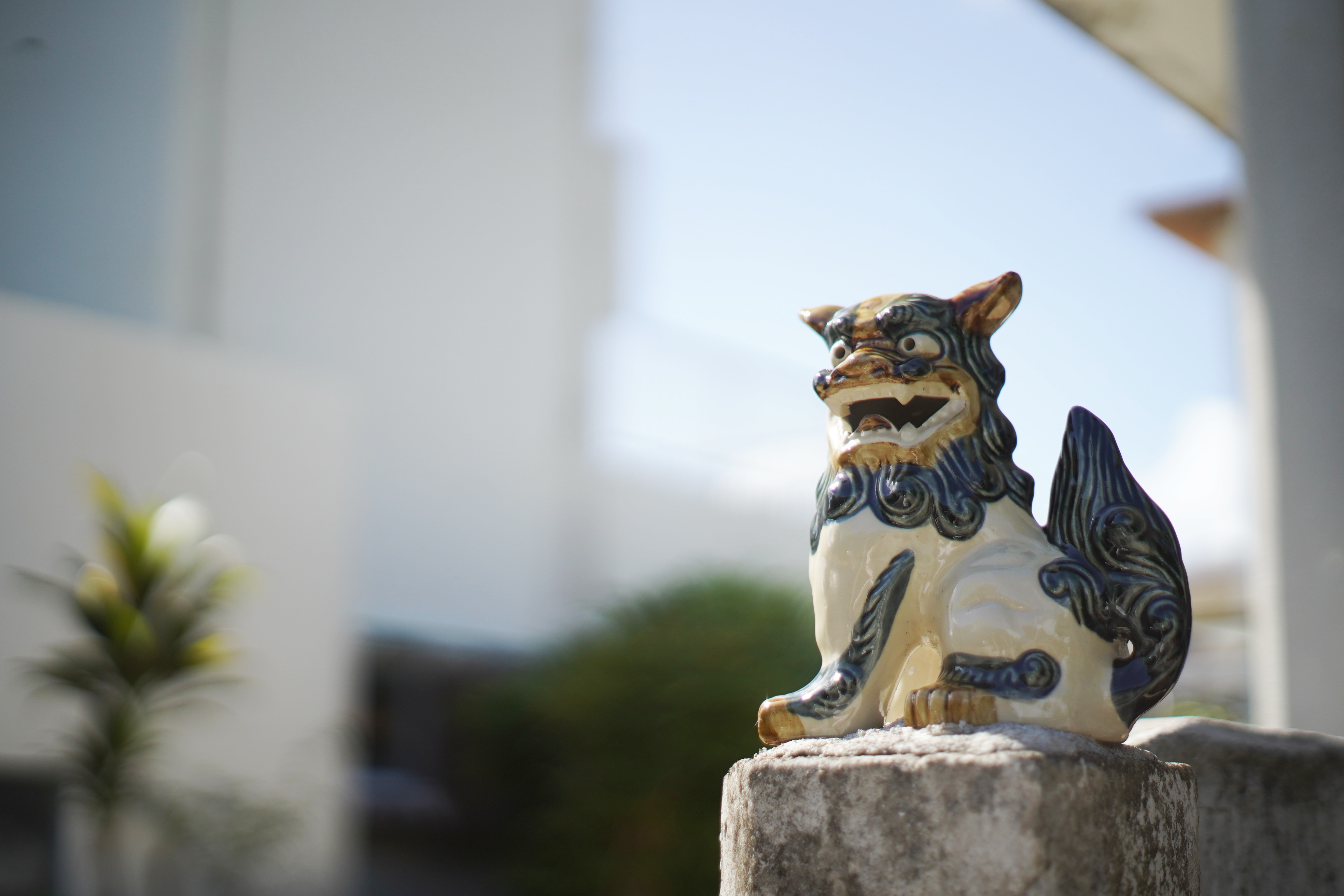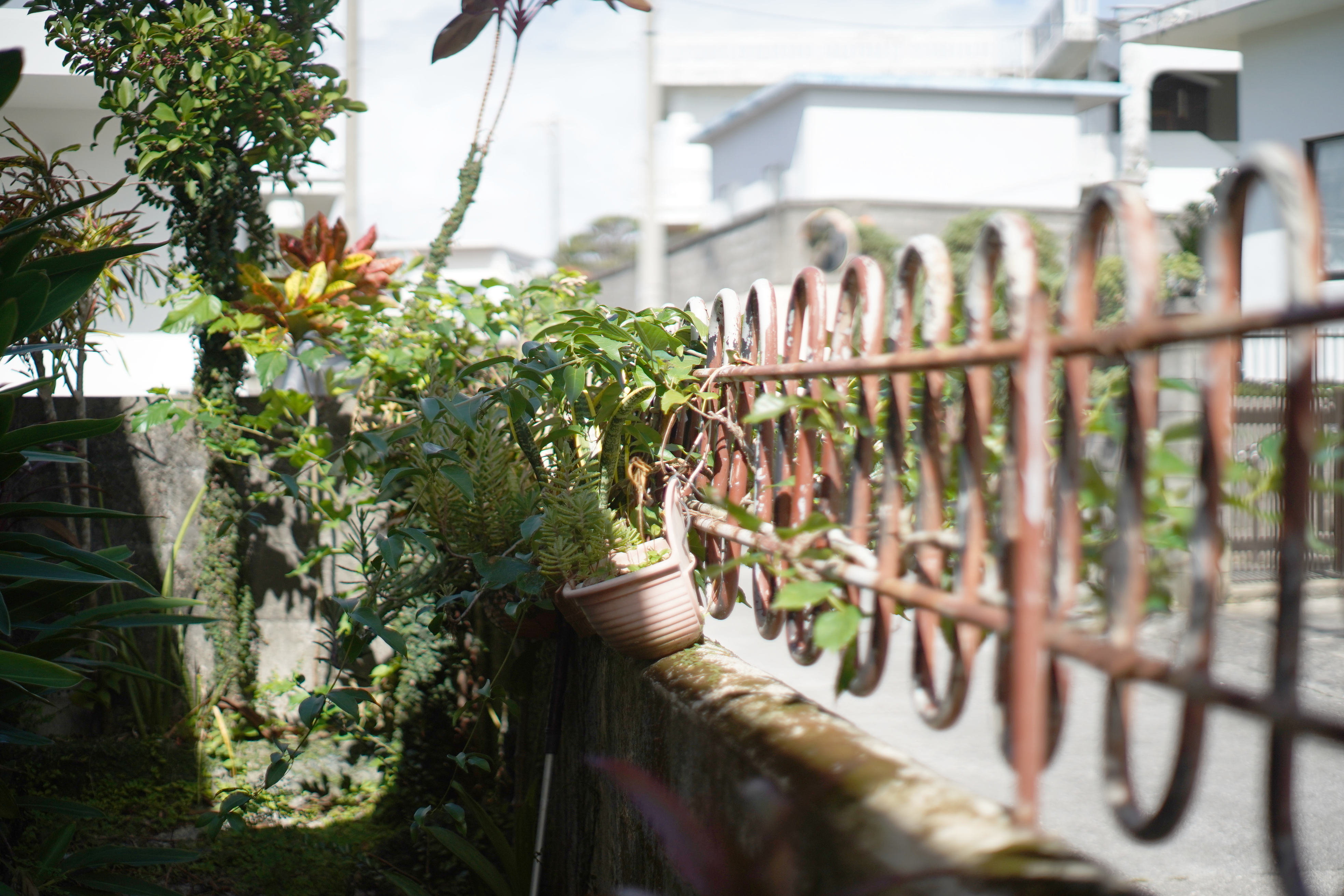 ブロック塀の上のウネウネの鉄柵、門の脇のシーサーも出迎えてくれます。