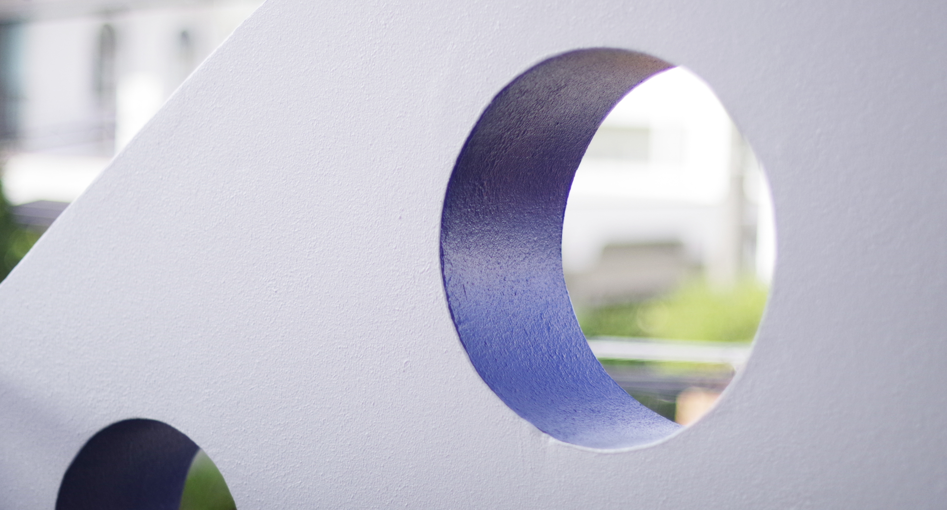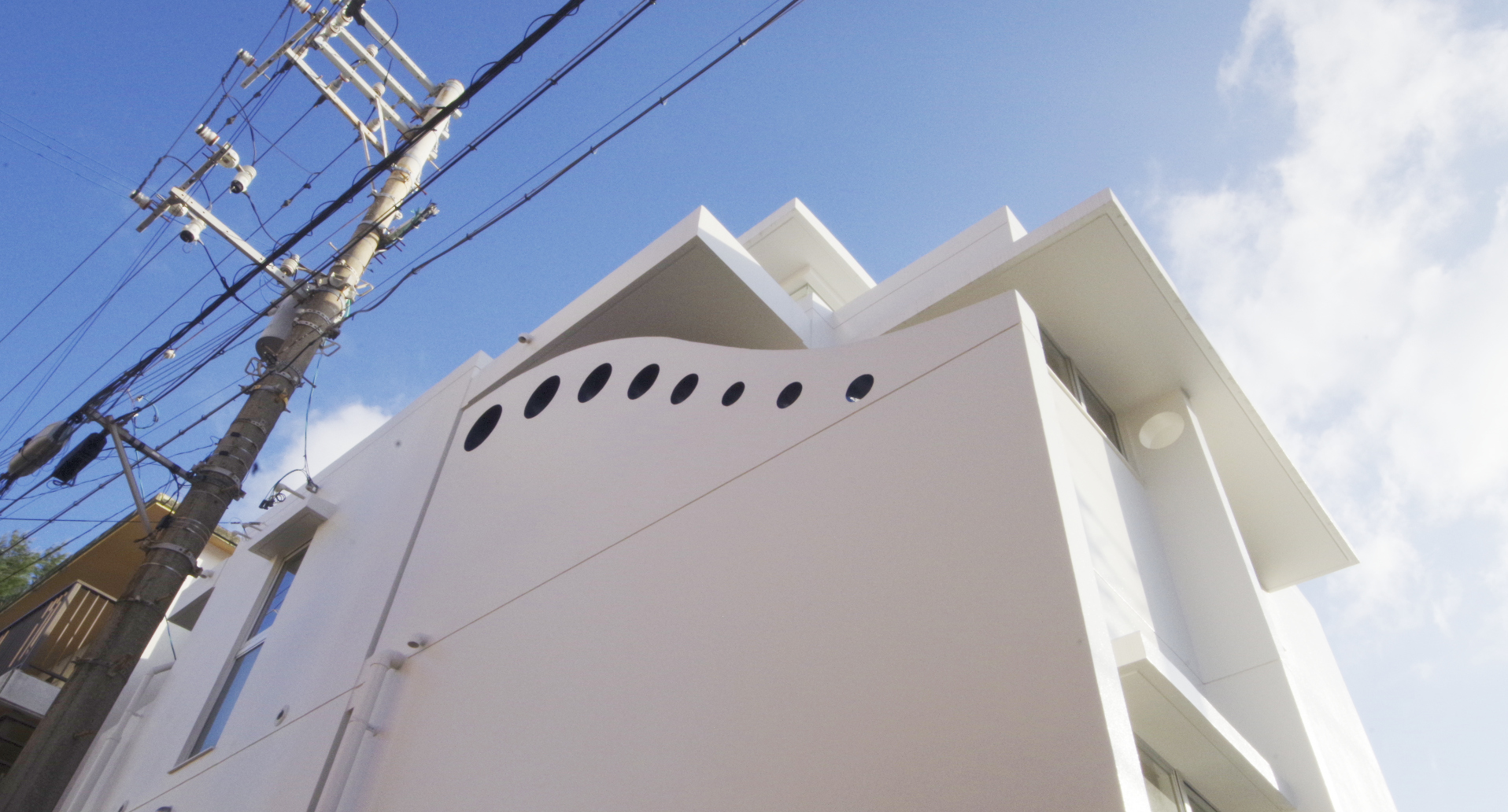 ベランダはコンパクトですが、外壁に丸いデザインが施されているため