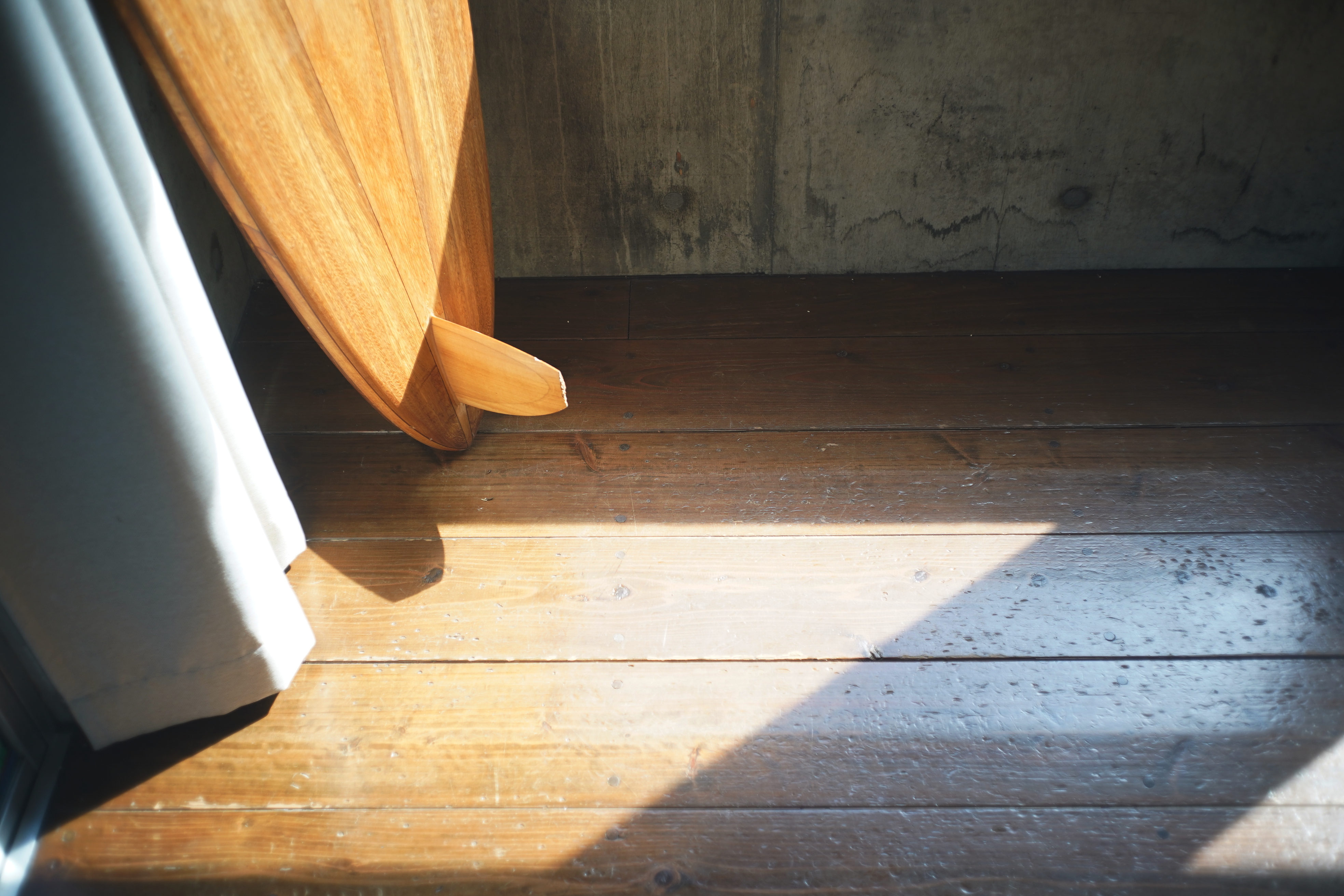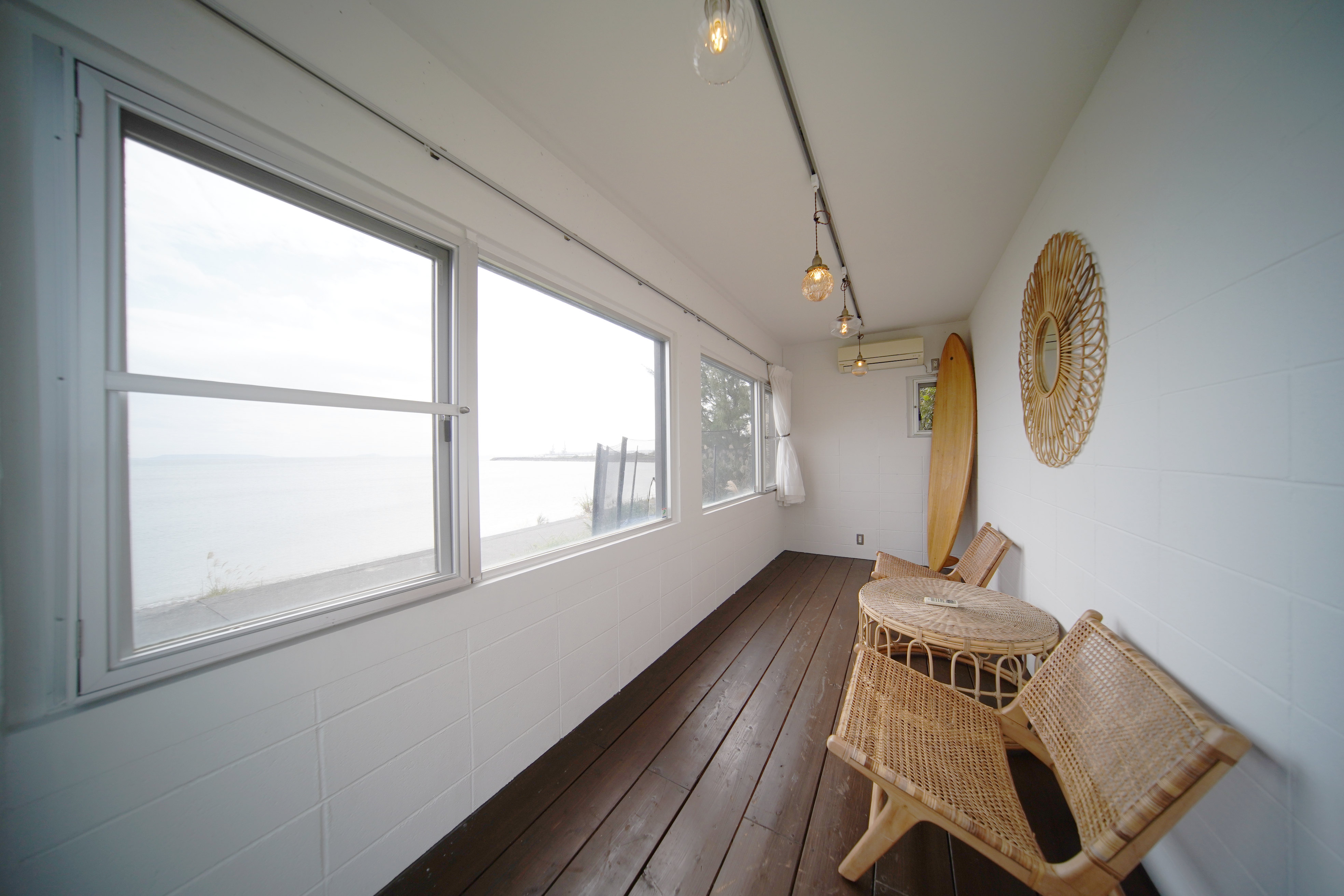 玄関を開けますと、まず目に飛び込んでくるのは窓ガラスから射しこむ日差しとその奥に見える青い海。
