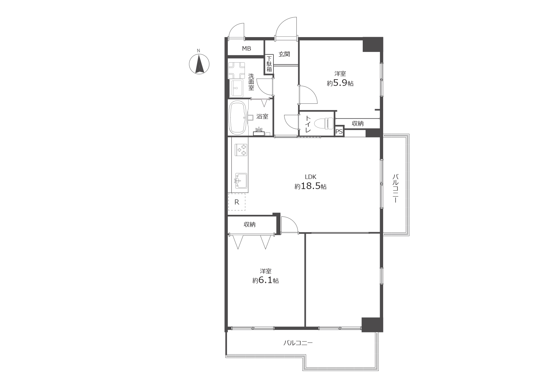 - ●間取り:2LDK(18.5J/6.1J/5.9J) 61.58㎡
