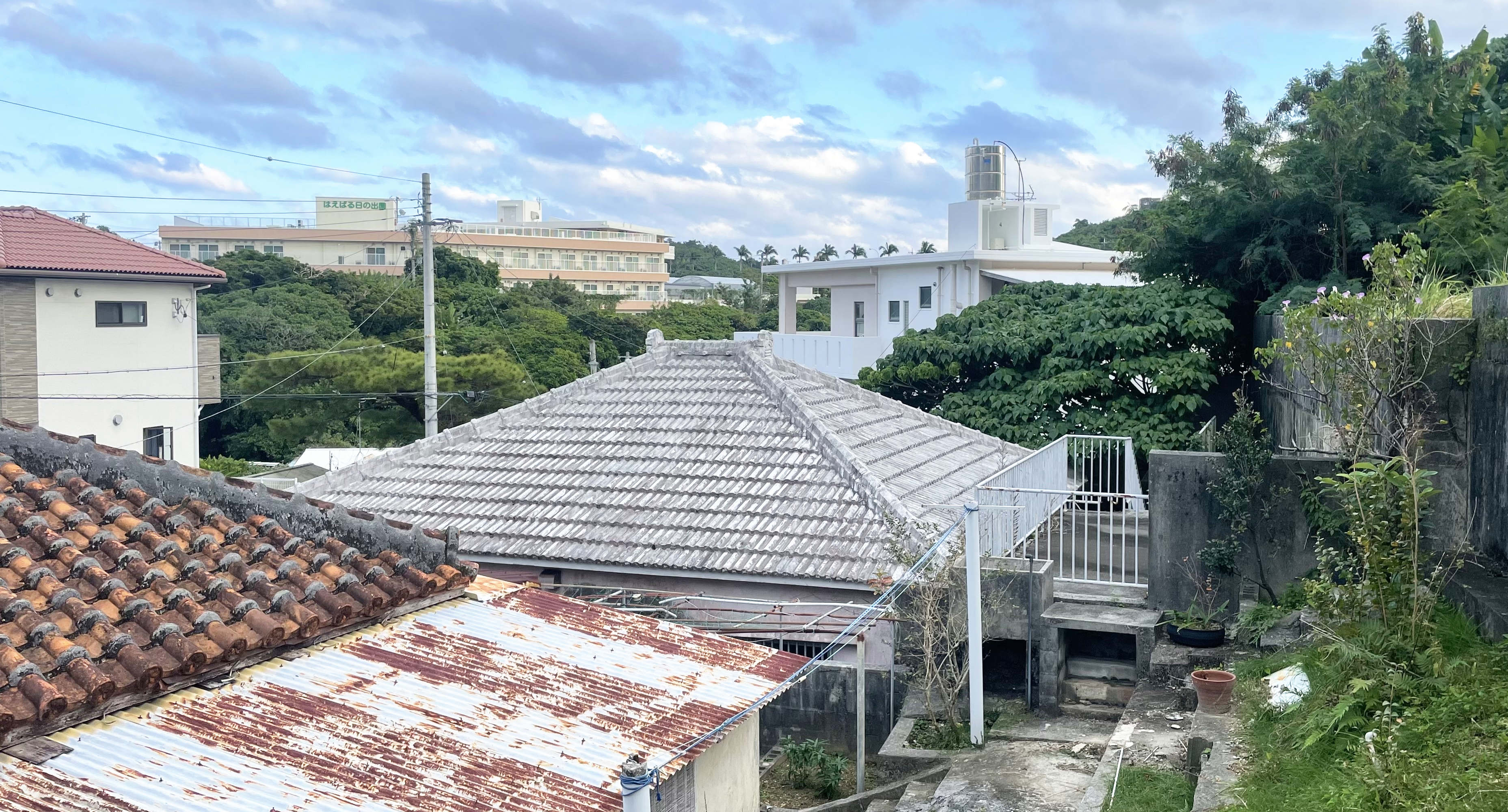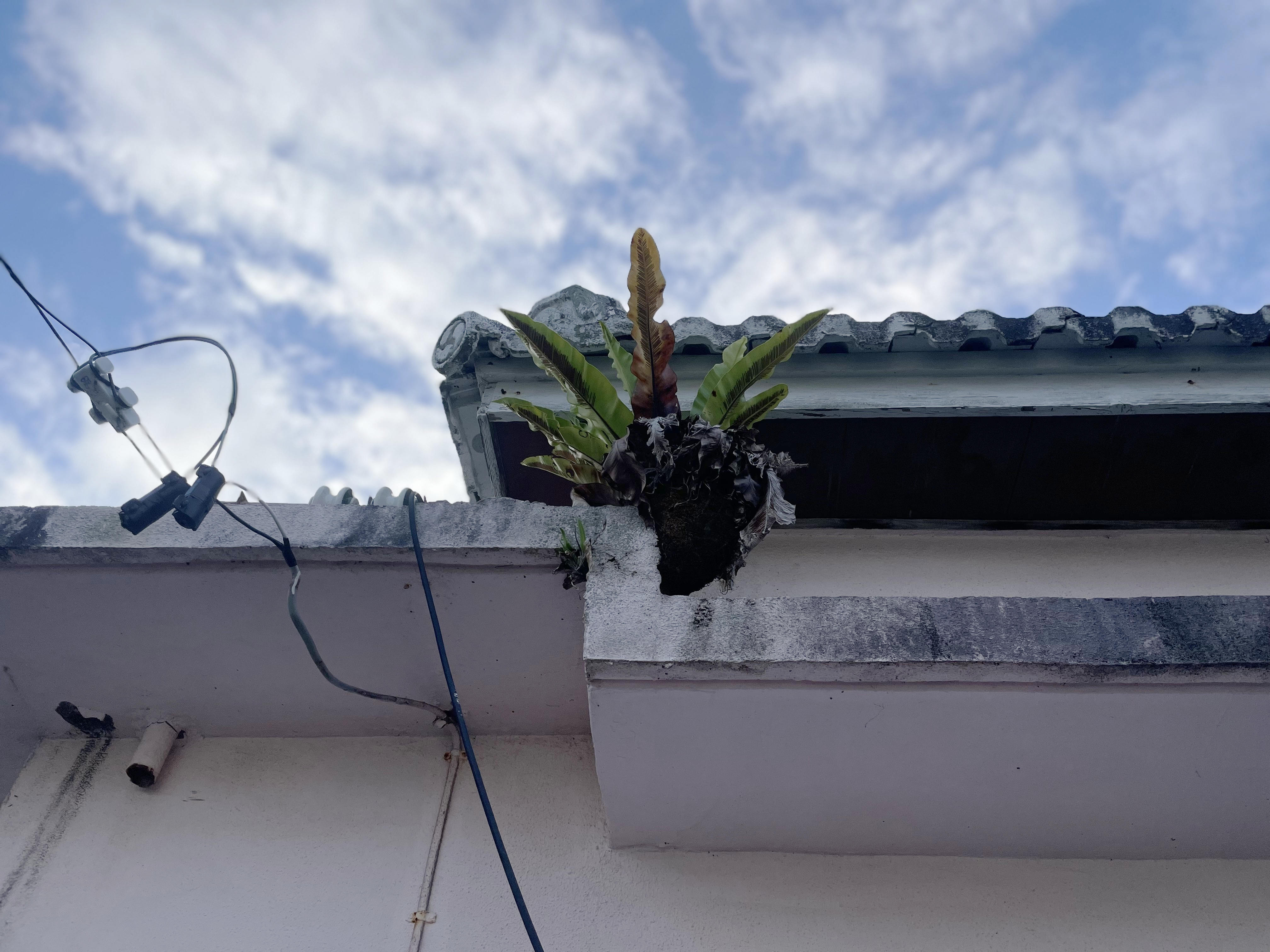 住宅街にある瓦屋根の平屋です。屋根にはシーサー、シダ植物がいます。