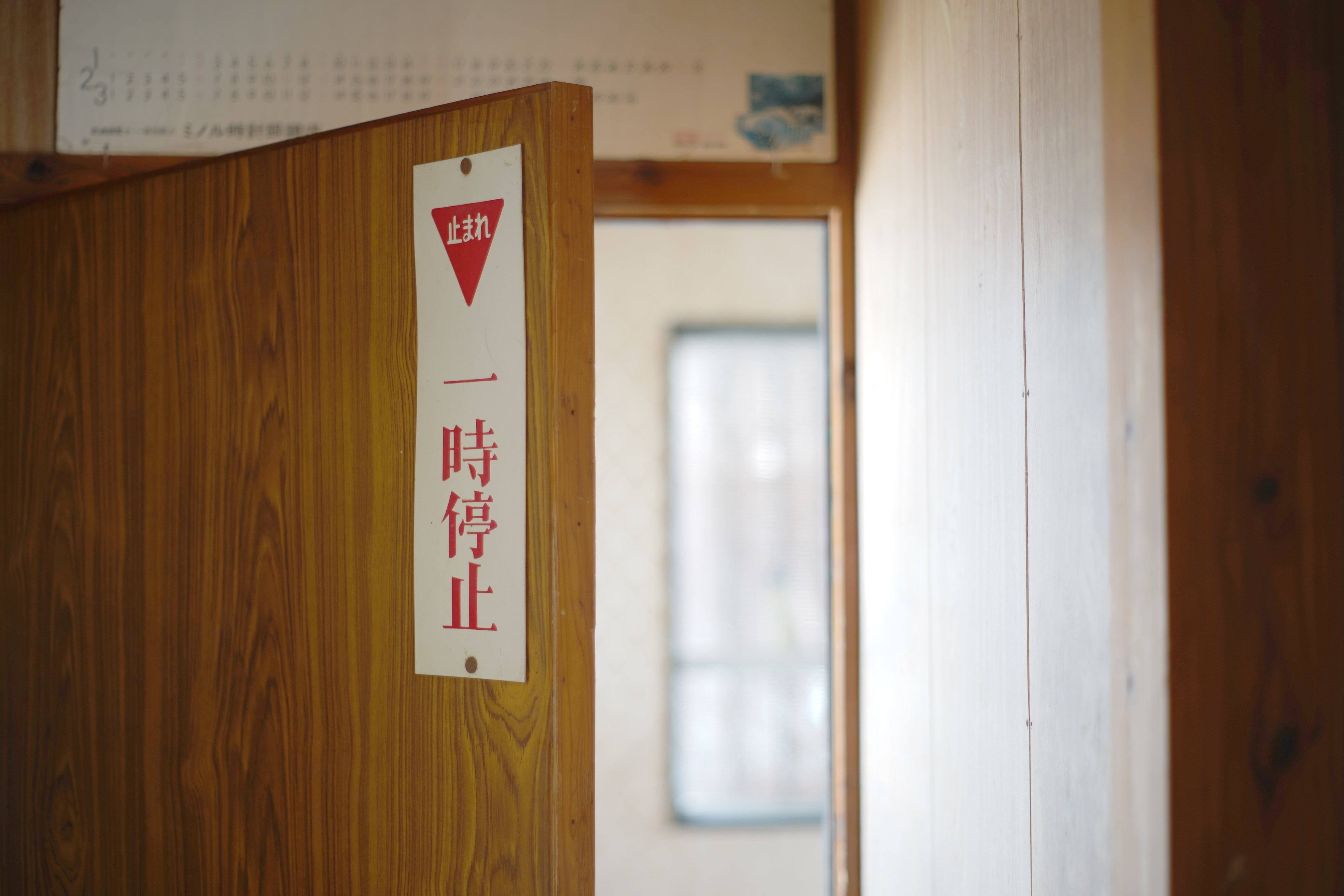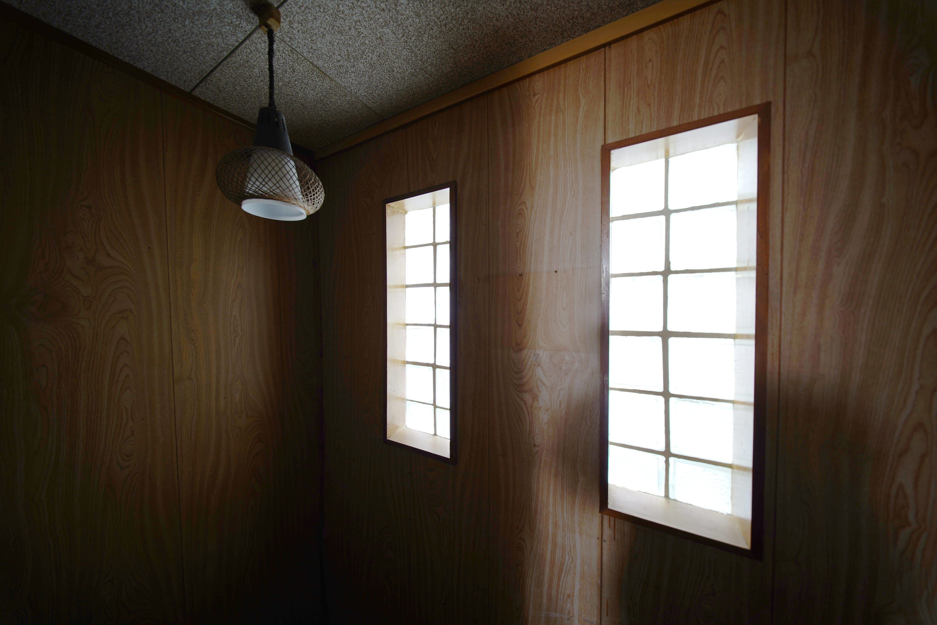 総柄の壁紙のもう一方の洋室は、ドアに一時停止のステッカーが…。過去に誰か突っ込んだのかな。