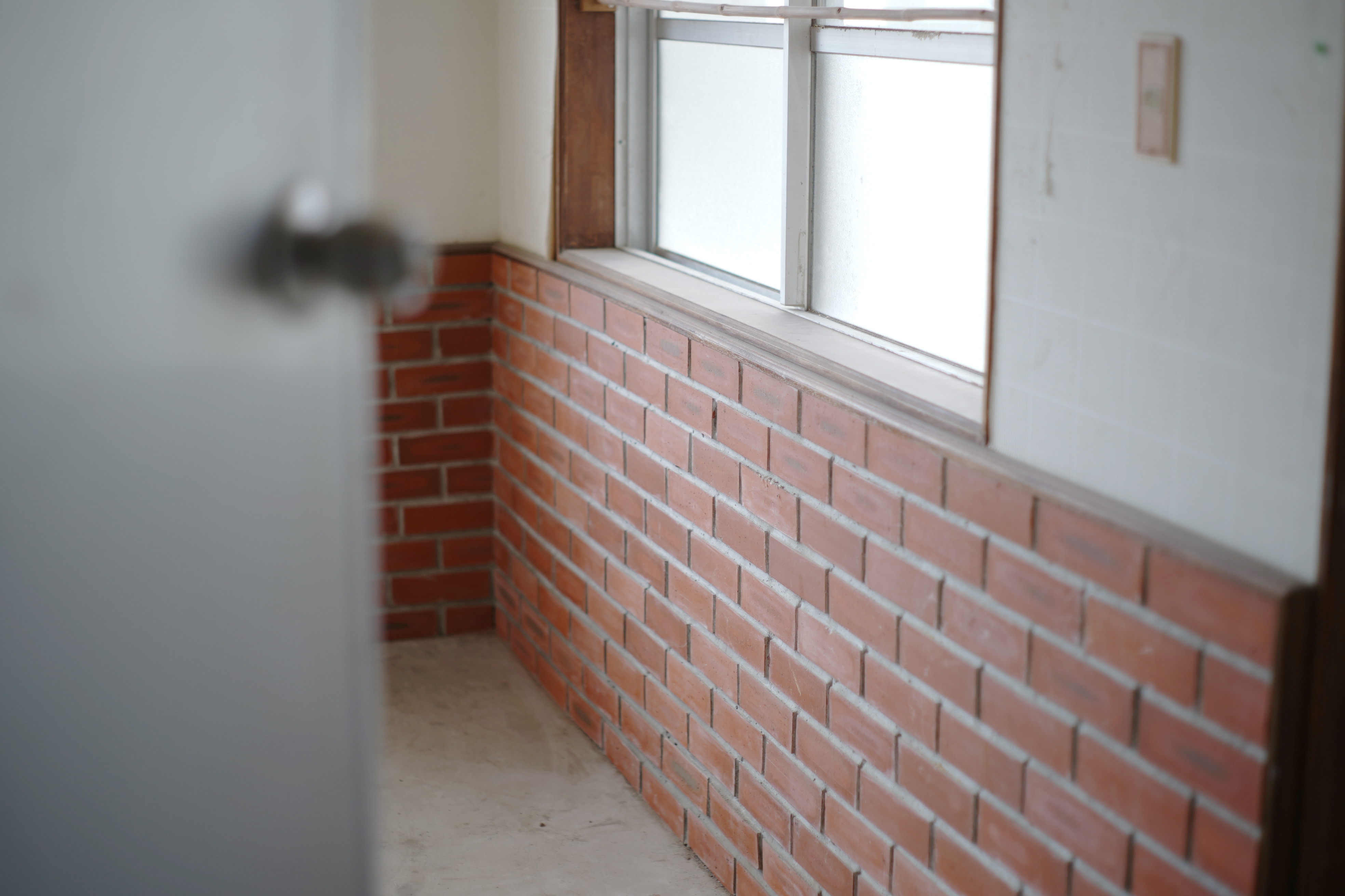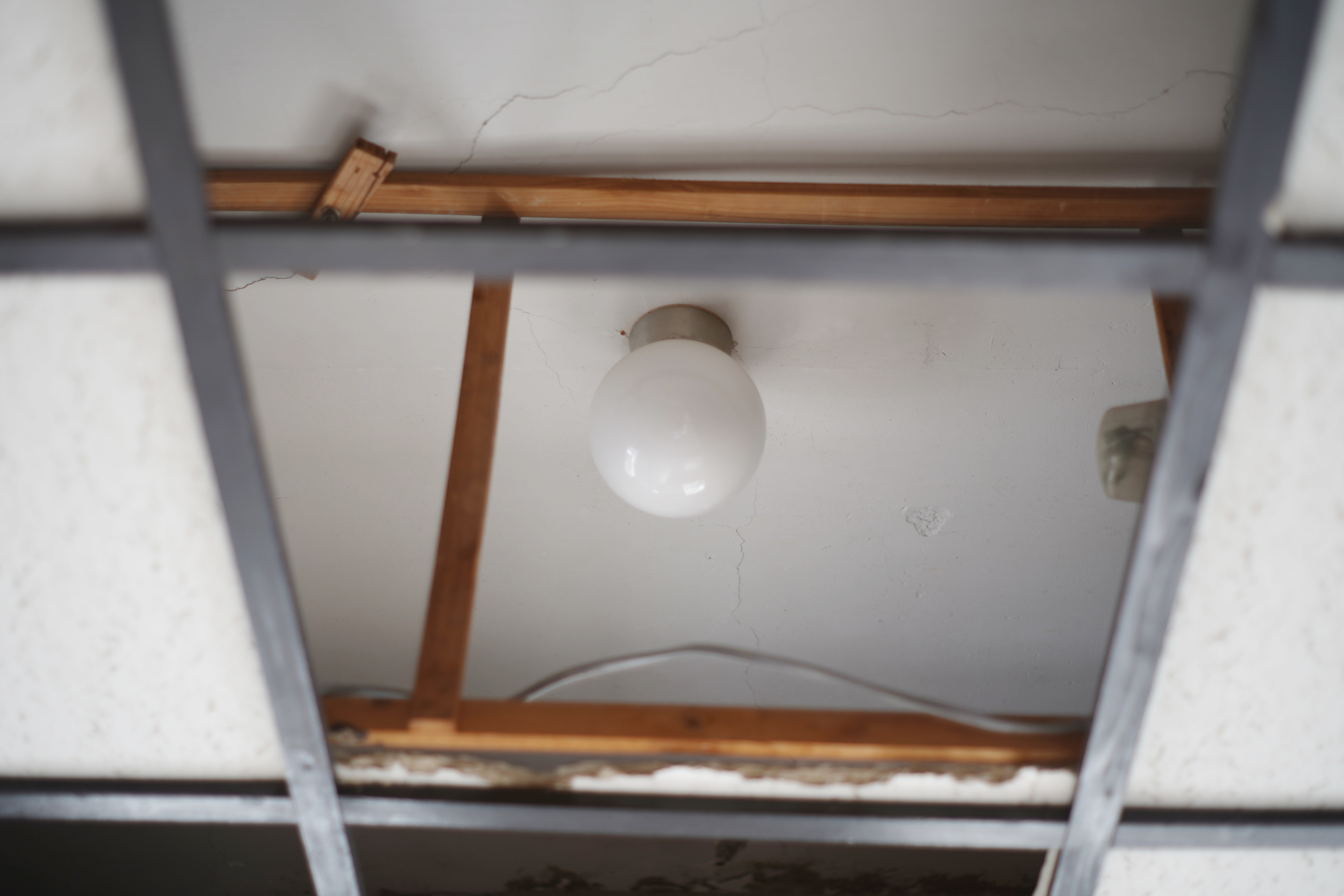 ブロックの壁と、レンガの壁と、天井板の上にある照明と、宙にぶら下がってるブレーカーと…。