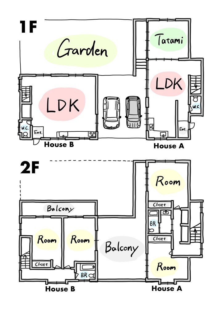 - ・間取り:5LLDDKK ( A棟:3LDK、B棟:2LDK )