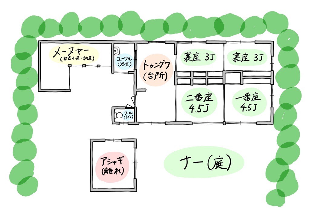 母屋は伝統的な一番座、二番座、裏座の間取り。