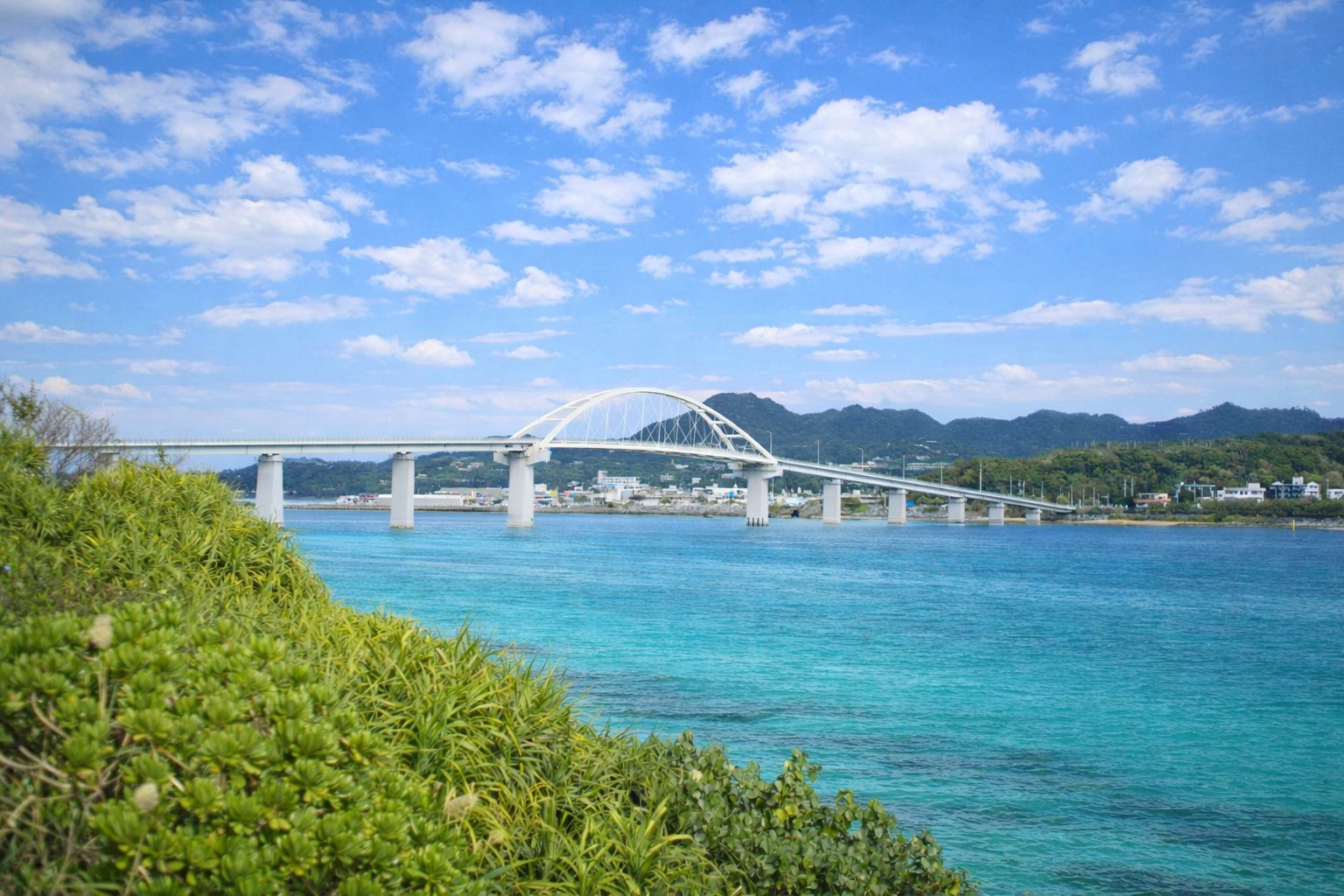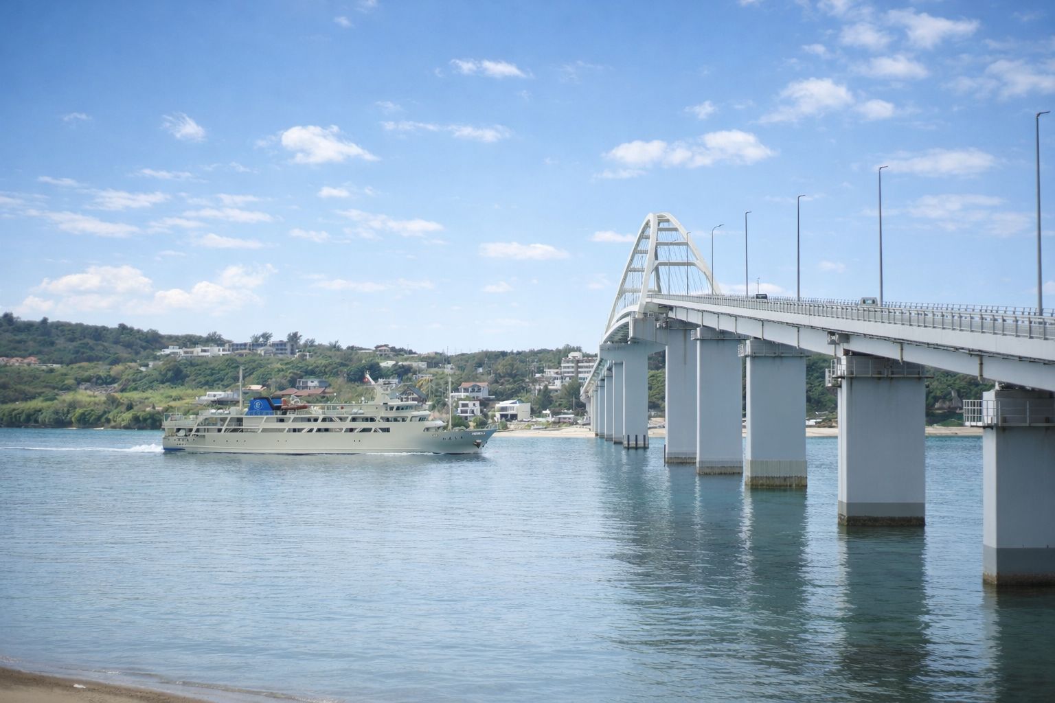 伊江島へ向かうフェリーを横目に、堂々としたアーチが特徴的な瀬底大橋を渡って、いざ上陸。