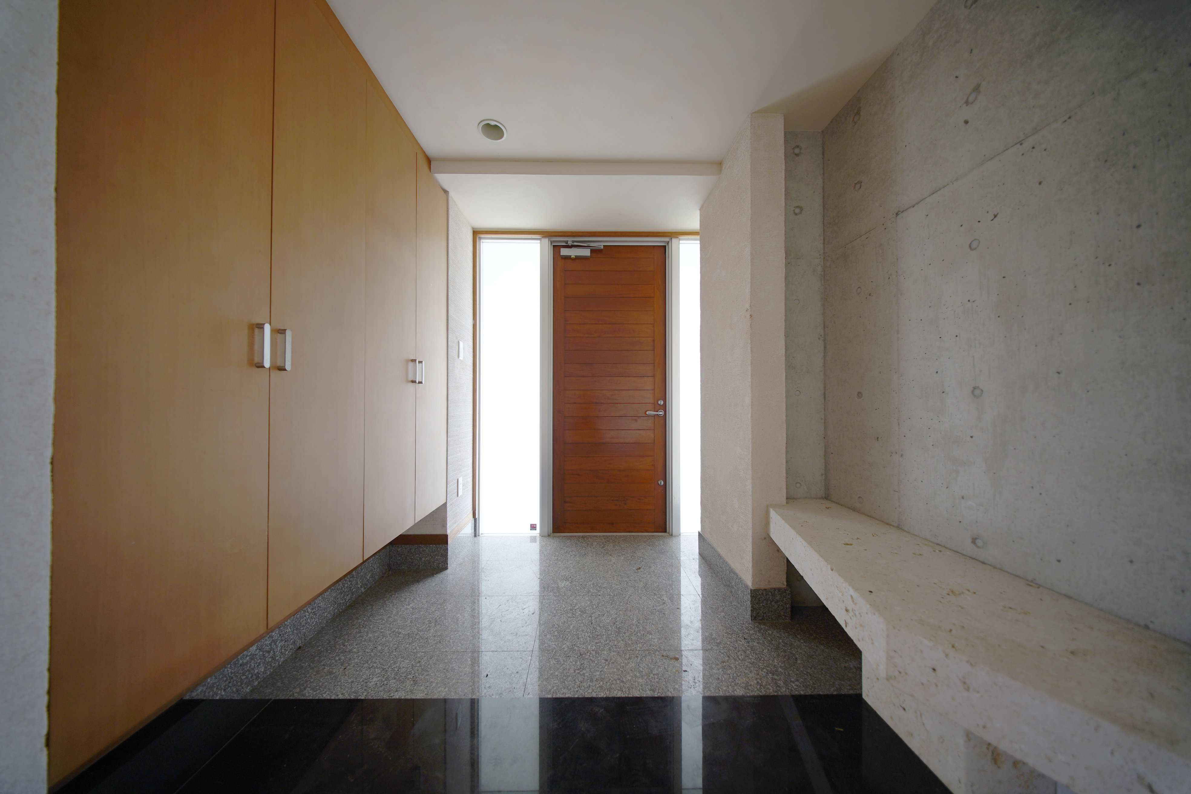エントランスには、木のドア類と、石造りの床と、琉球石灰岩のベンチ…。それぞれが美しく調和しております。