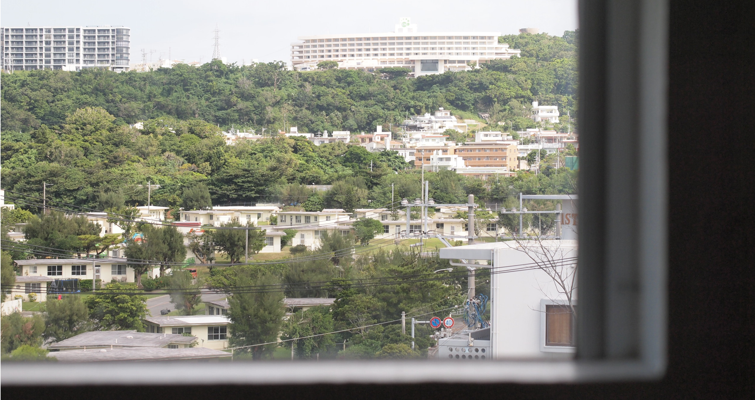 フローリングのフロアシートに窓からは米軍基地と北中城の緑が望め