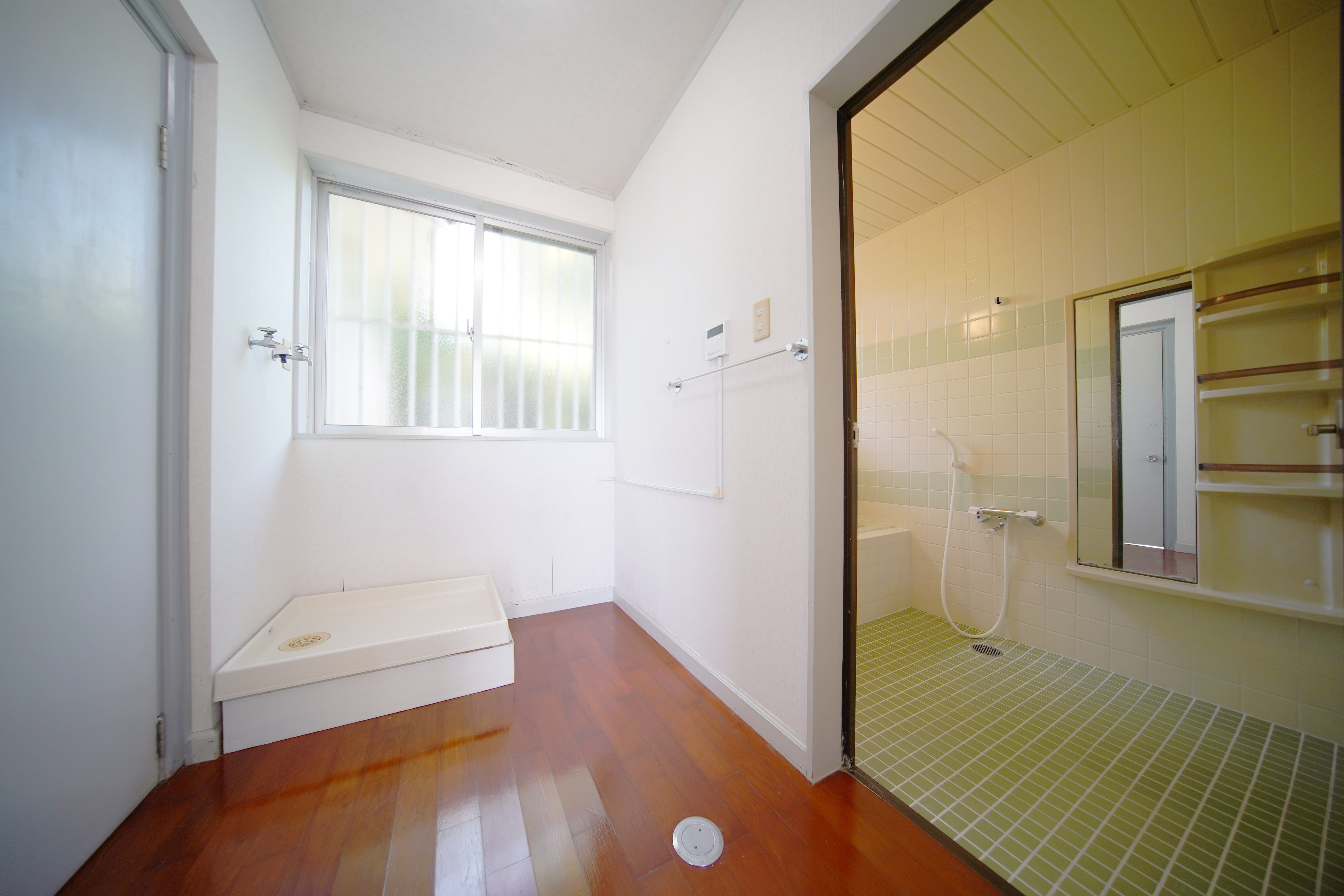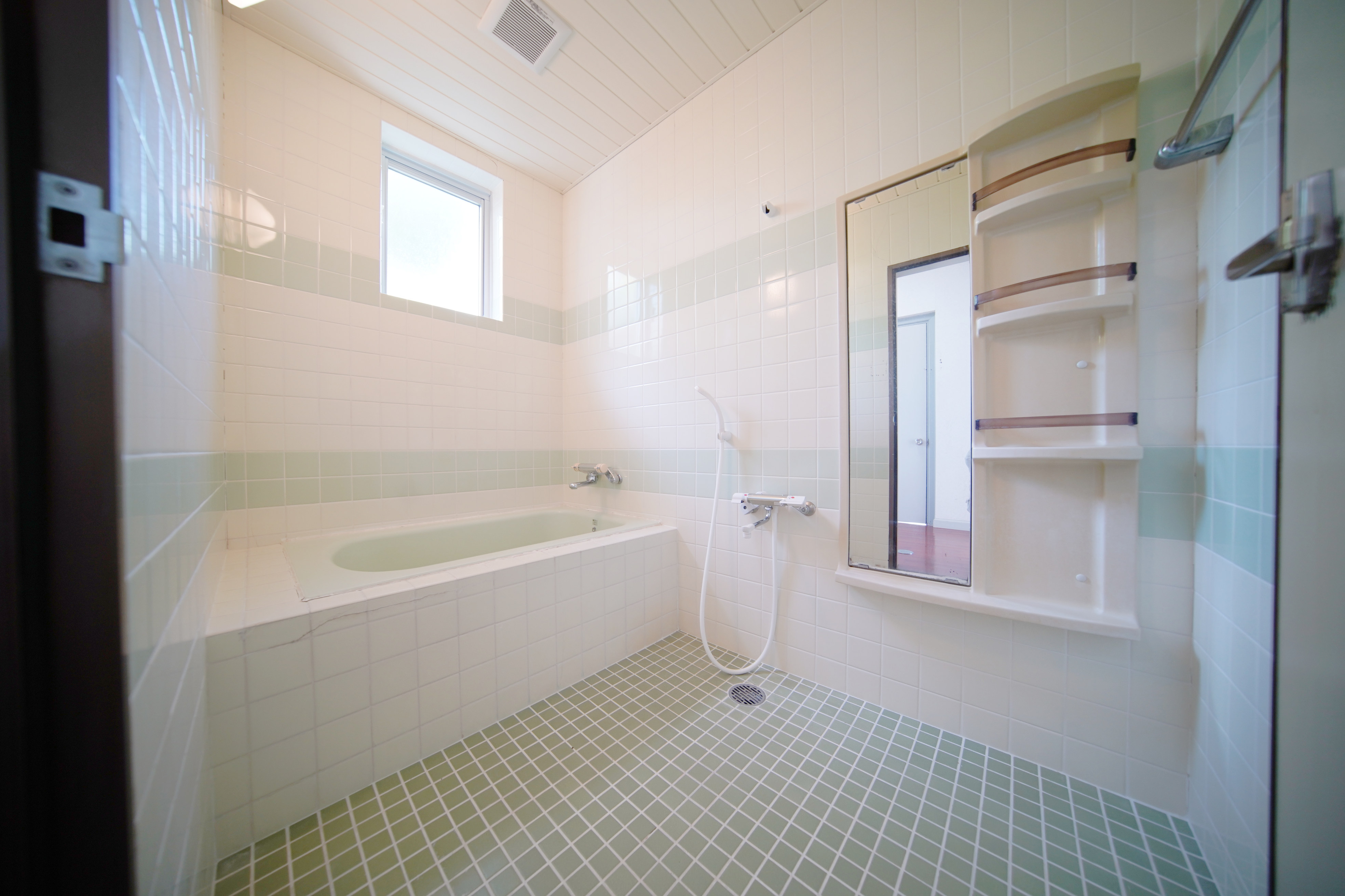 浴室には優しい緑で統一されたタイルに包まれた浴槽も完備。脱衣スペースには洗濯機のパンもございます。