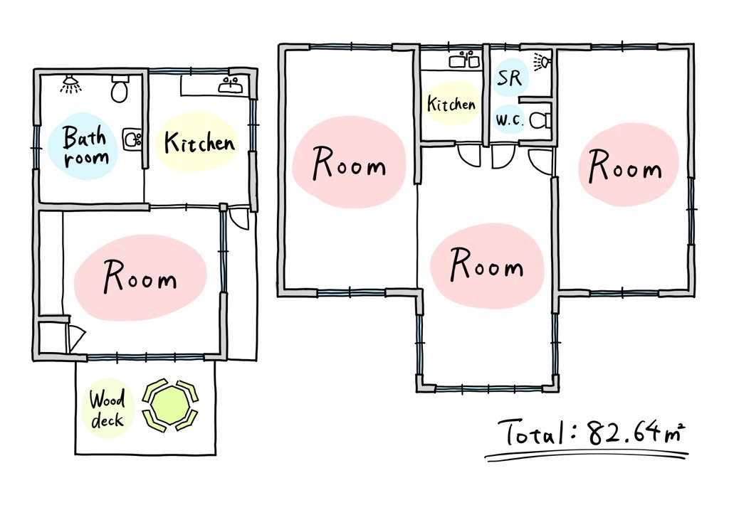 - 間取り:母屋3K + 離れ1K (合計 82.64m²)