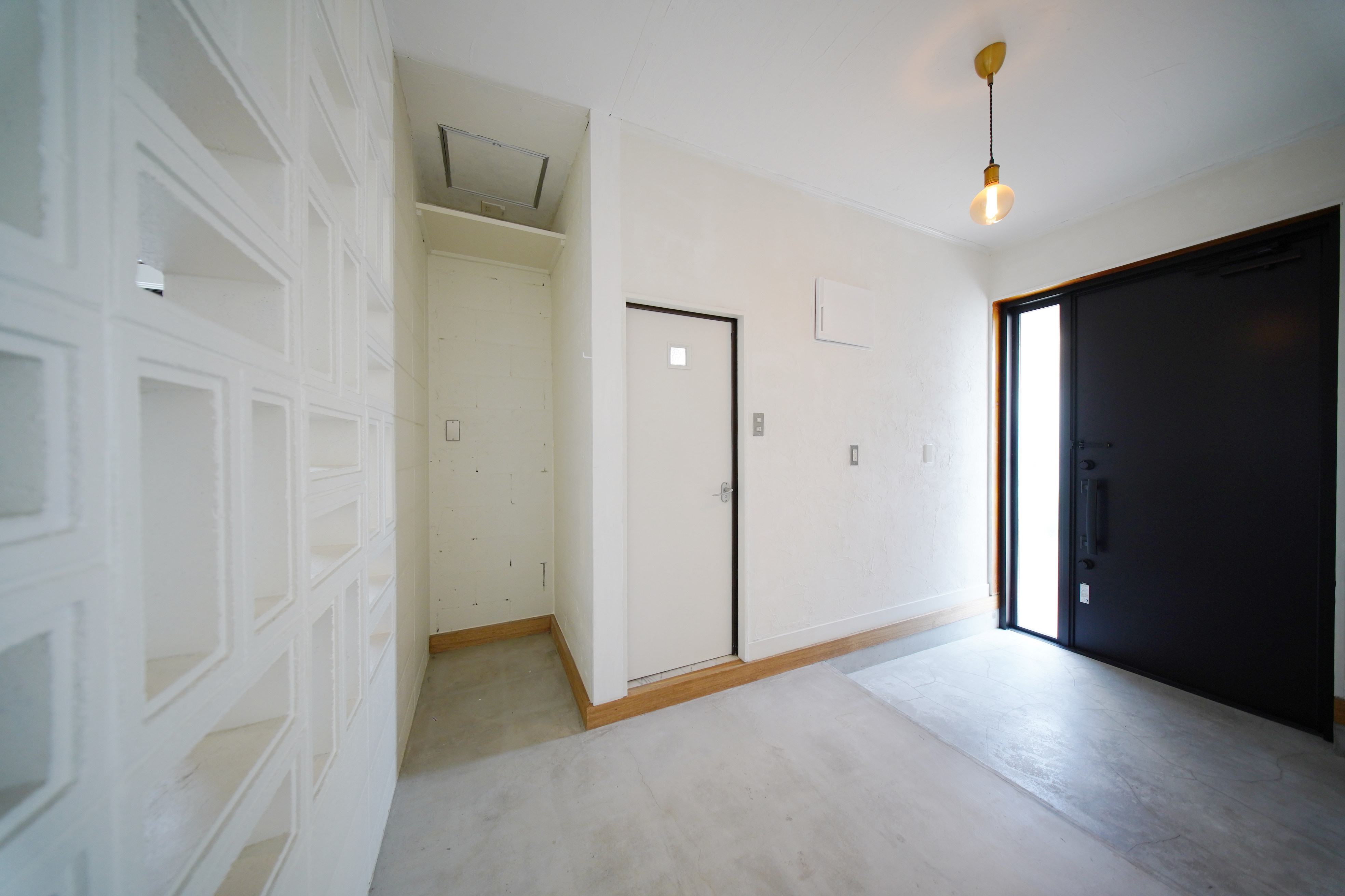 ドアを開けるとまず目に飛び込んでくるのは、広々とした玄関土間の奥に佇む真っ白な花ブロック。