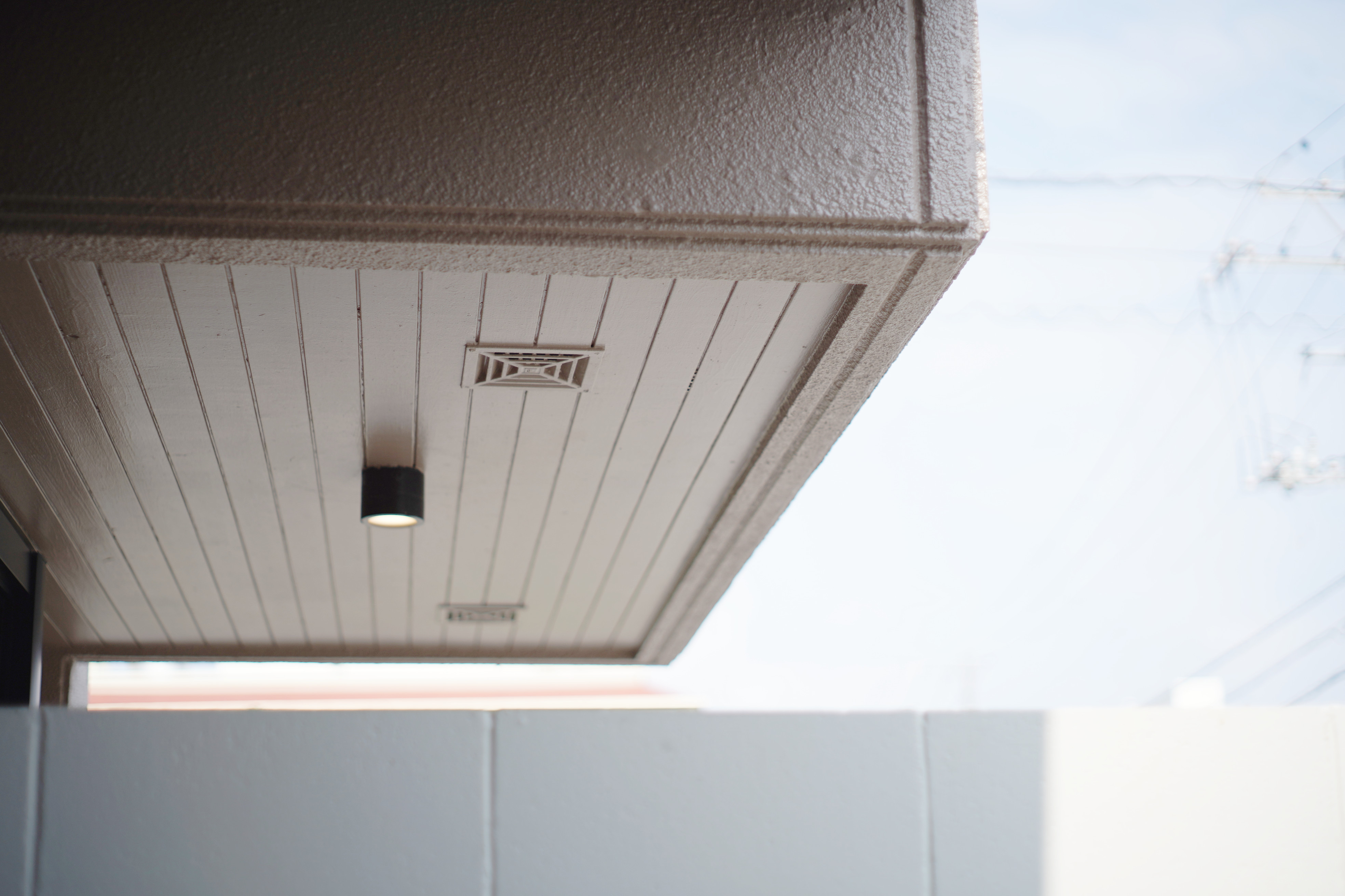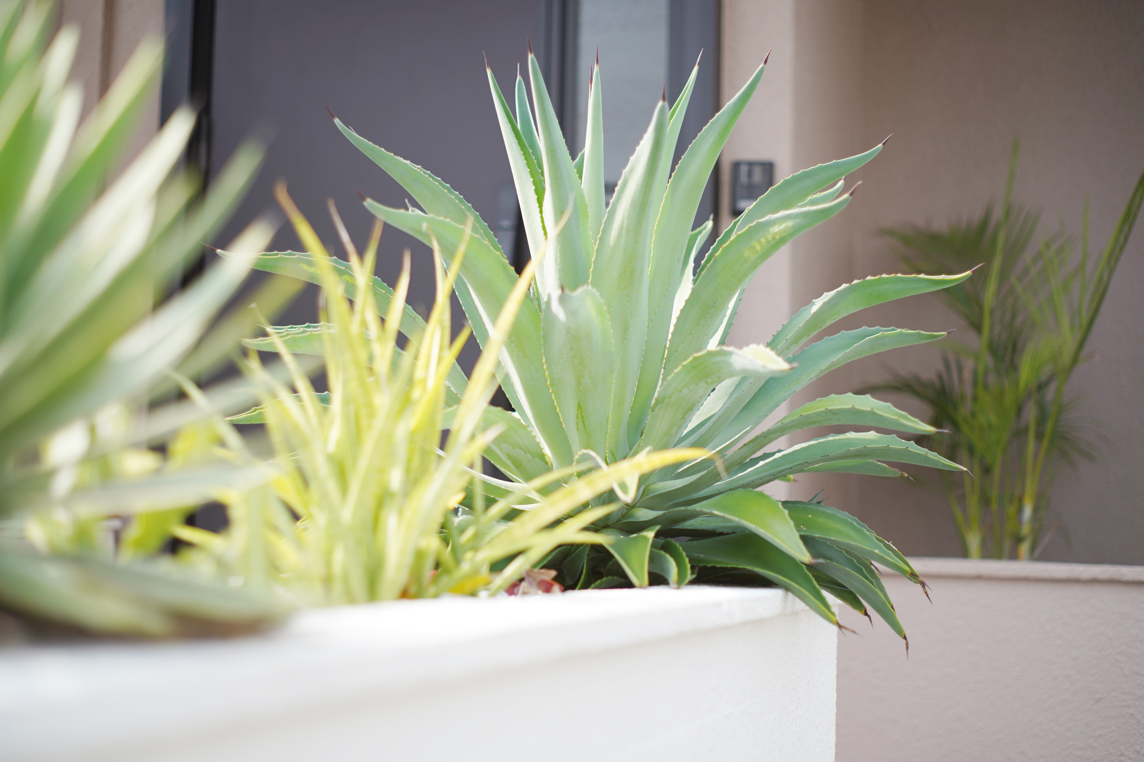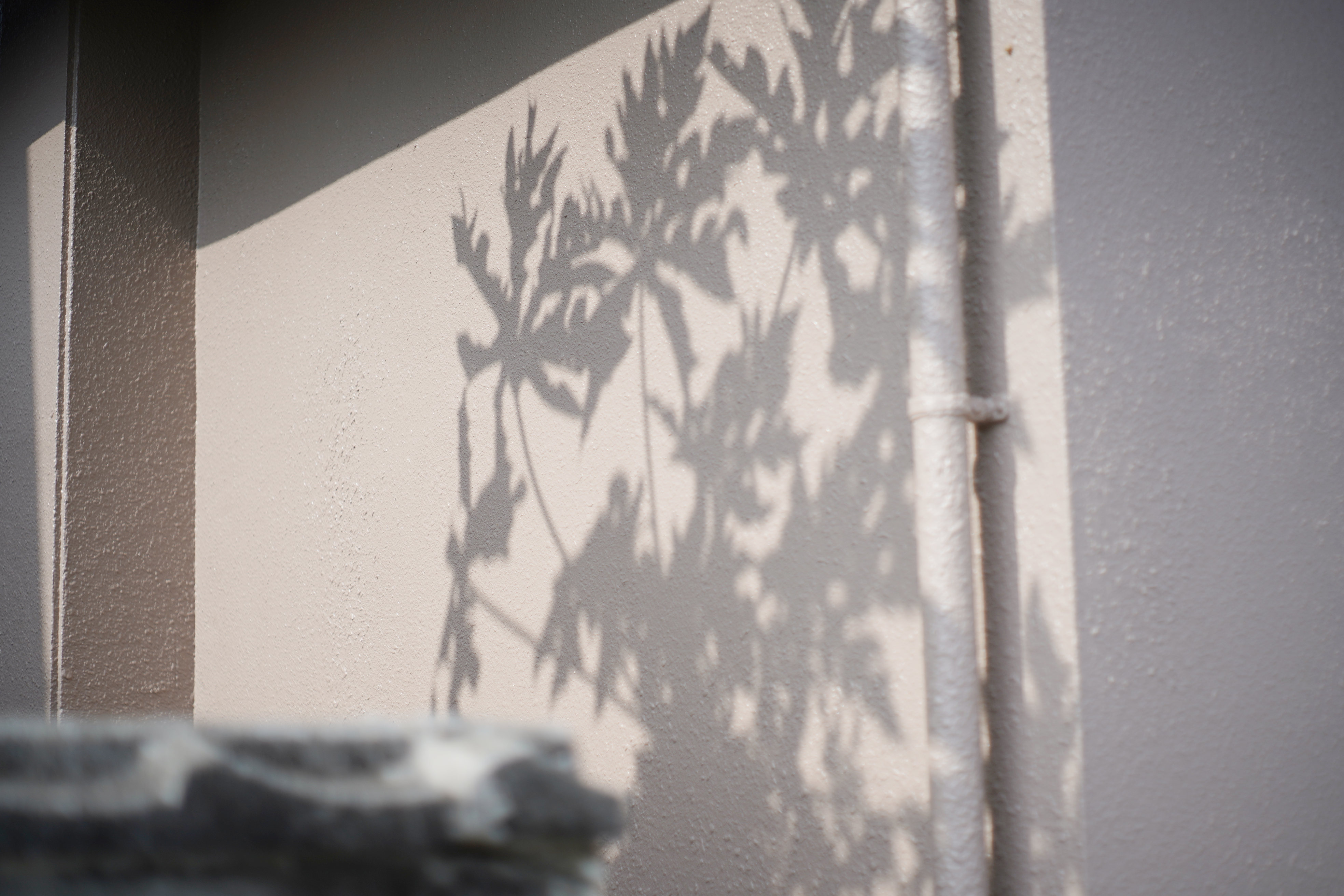 建物の外観はベージュの塗装が施され、白いブロック塀が背景となり植栽たちも生き生きと…。