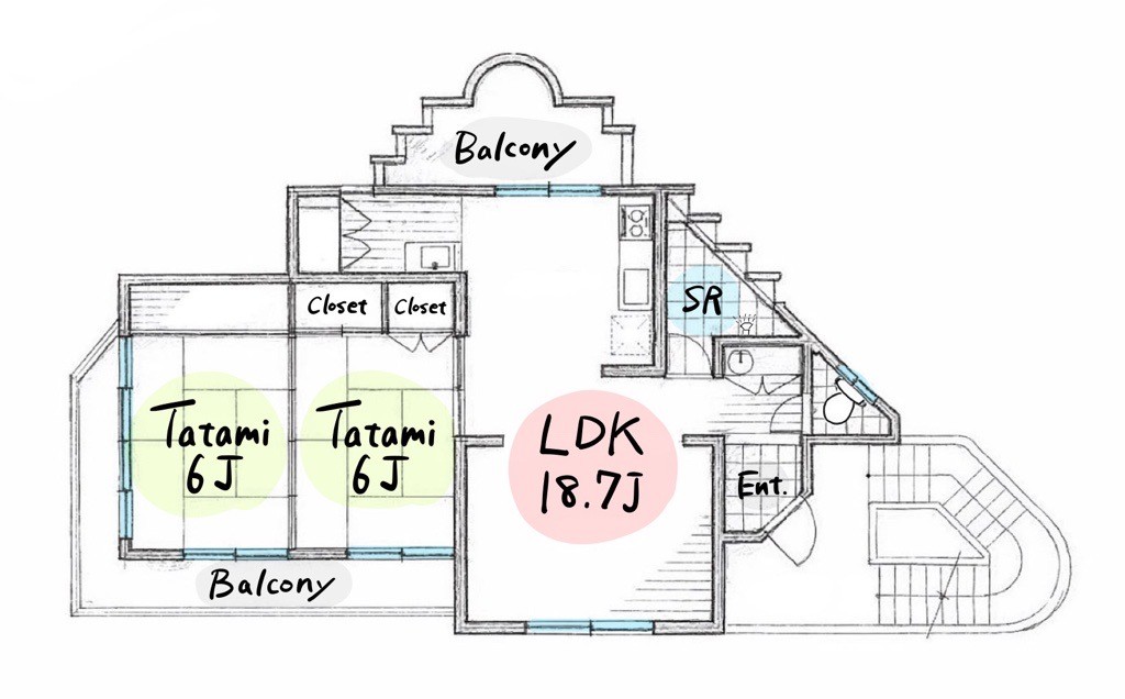 - 間取り:2LDK ( 和6J × 2 / LDK18.7J )