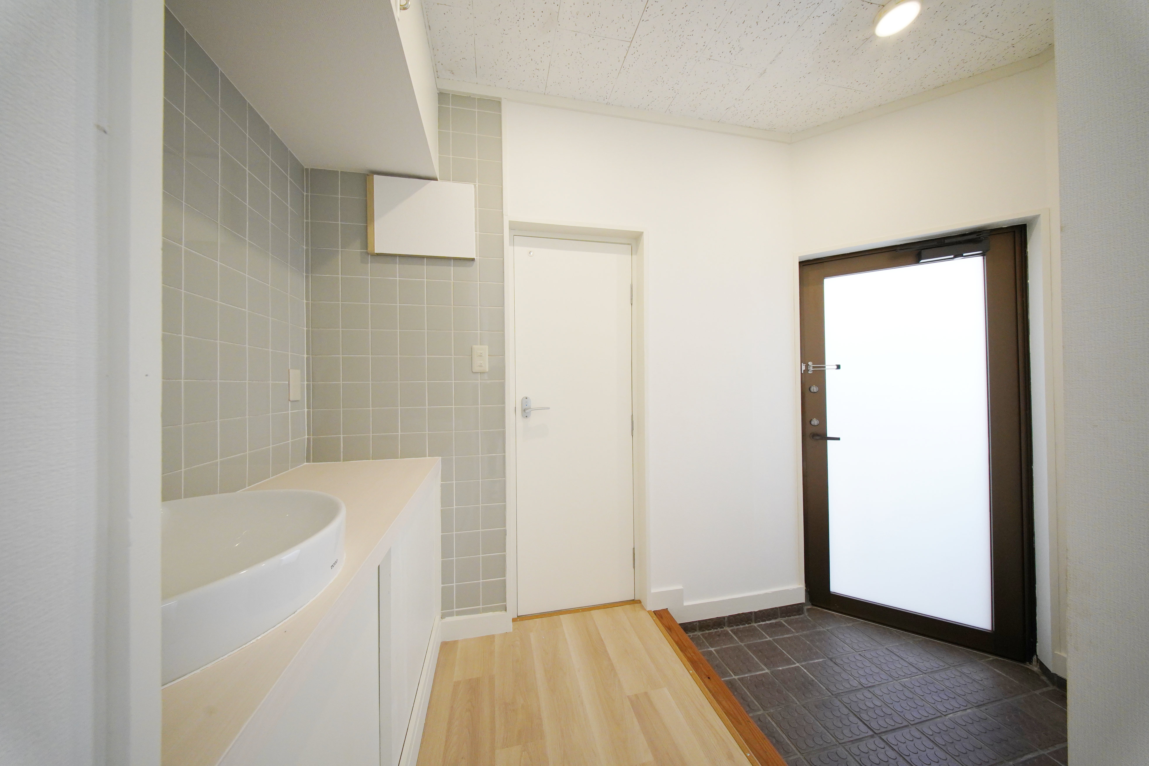 玄関を開けますと、まず迎えてくれるのはグレーのタイルと玄関収納上に作られた洗面ボウル。