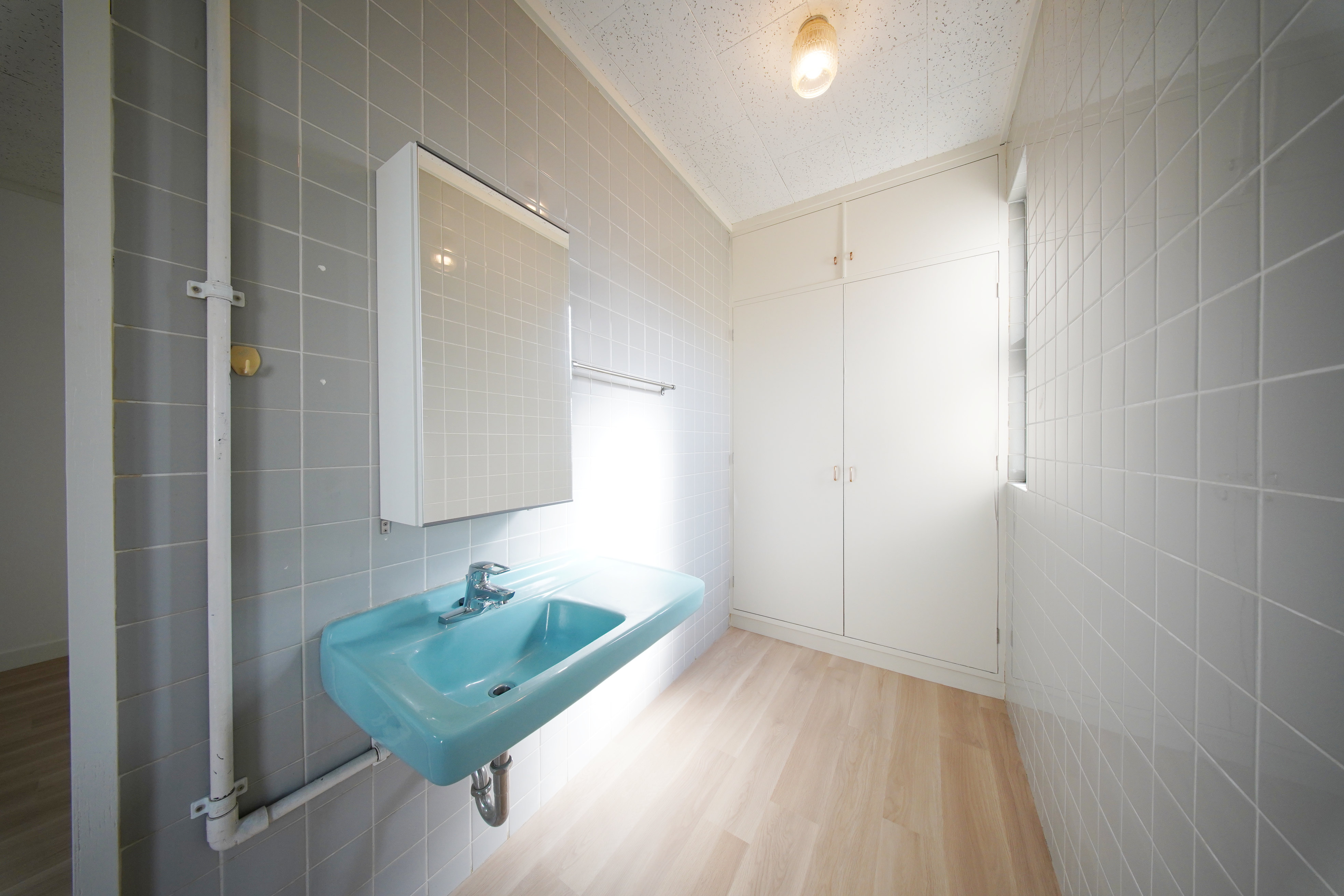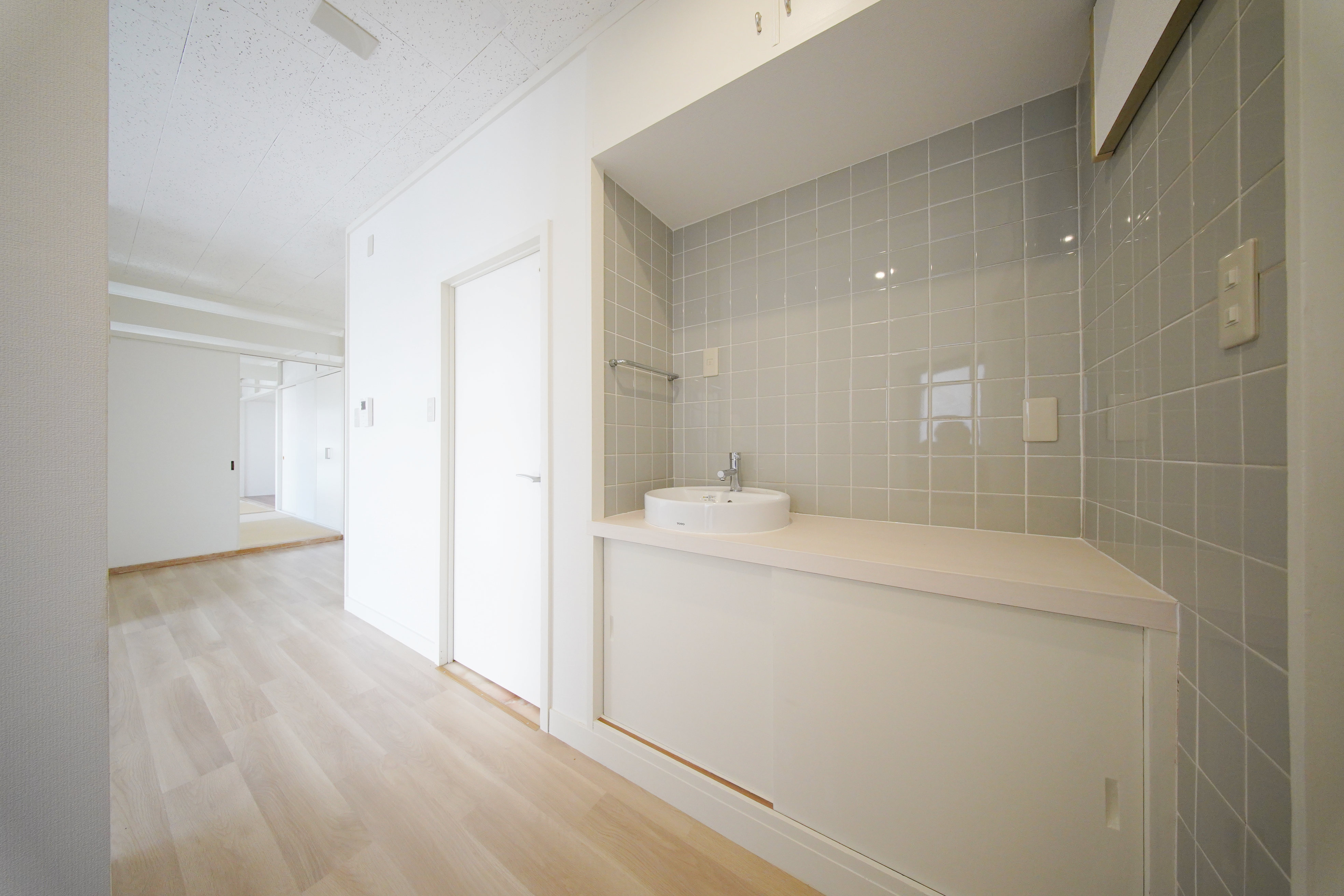 キッチンにも玄関で出迎えてくれたグレーのタイルがあしらわれ、奥には洗面と収納スペースがございます。