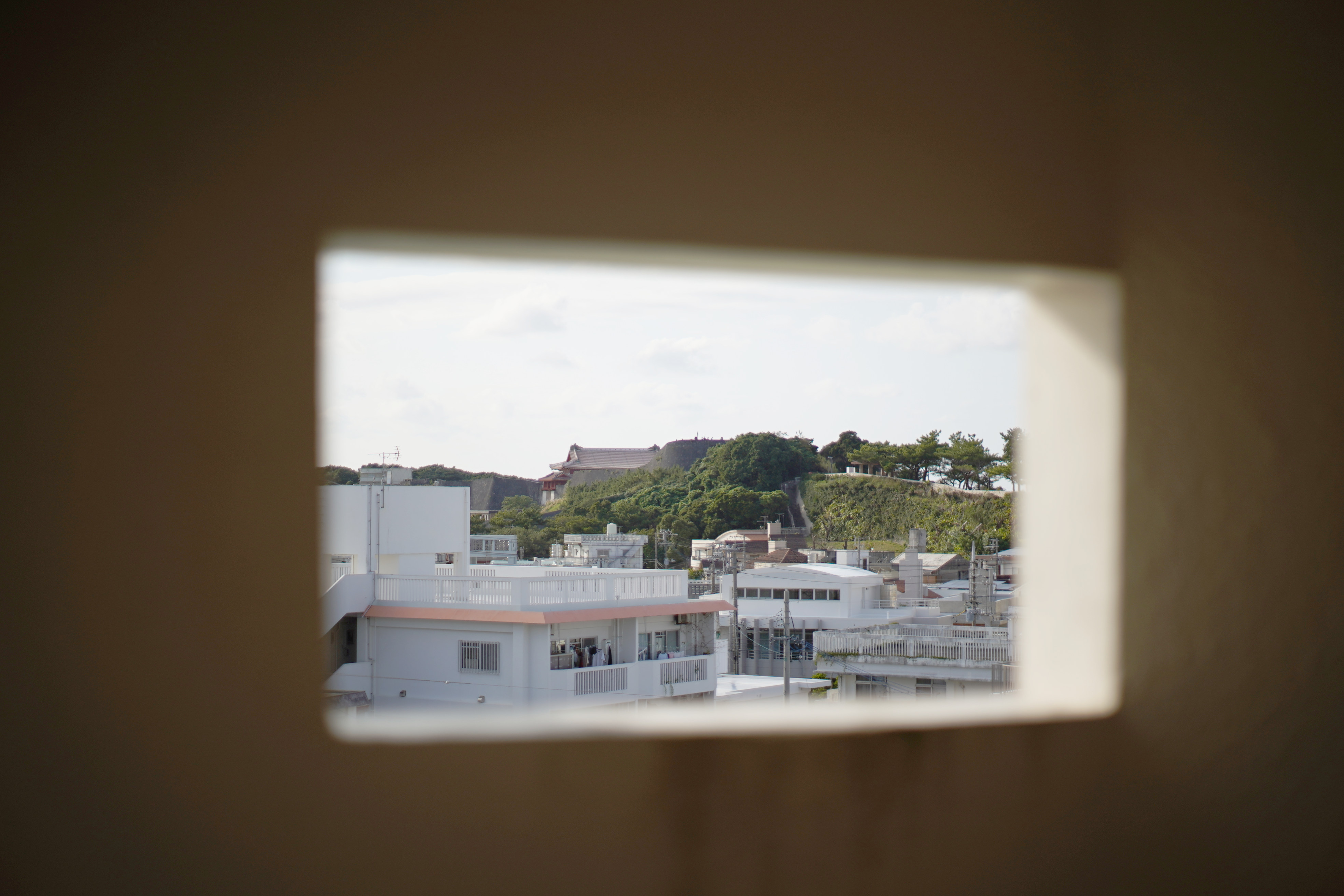上階のお部屋の階段の踊り場からは、額縁のように切り取った首里城の姿が確認できます。