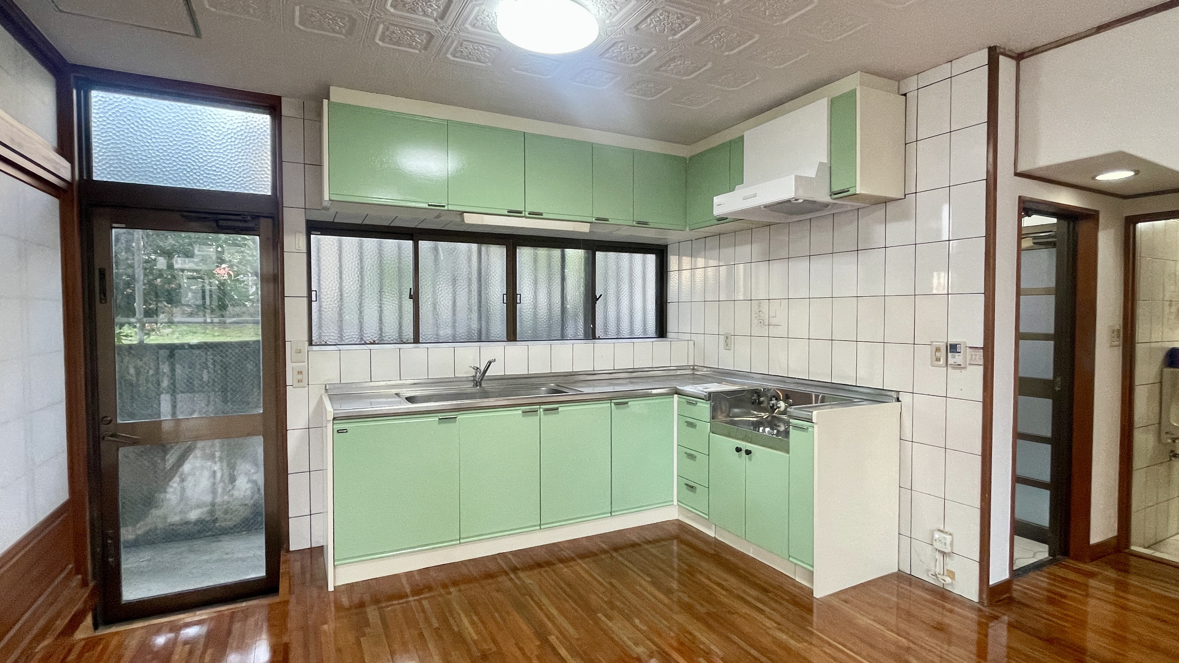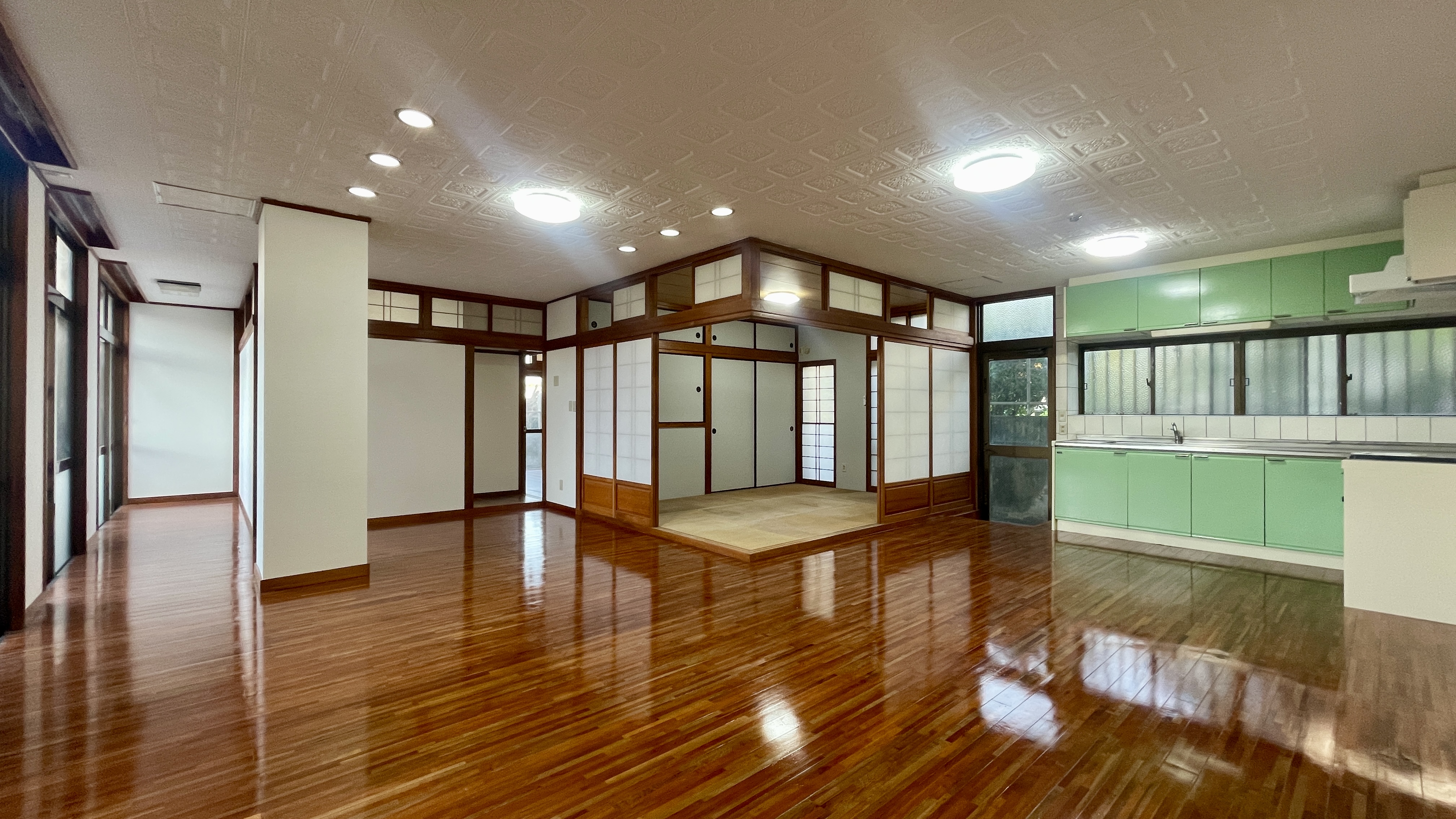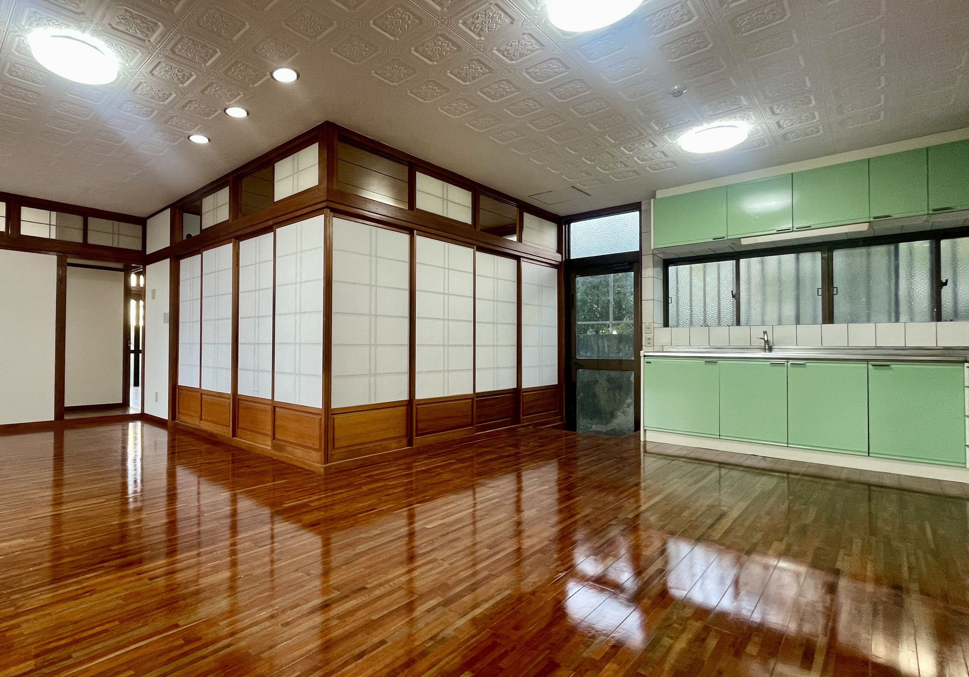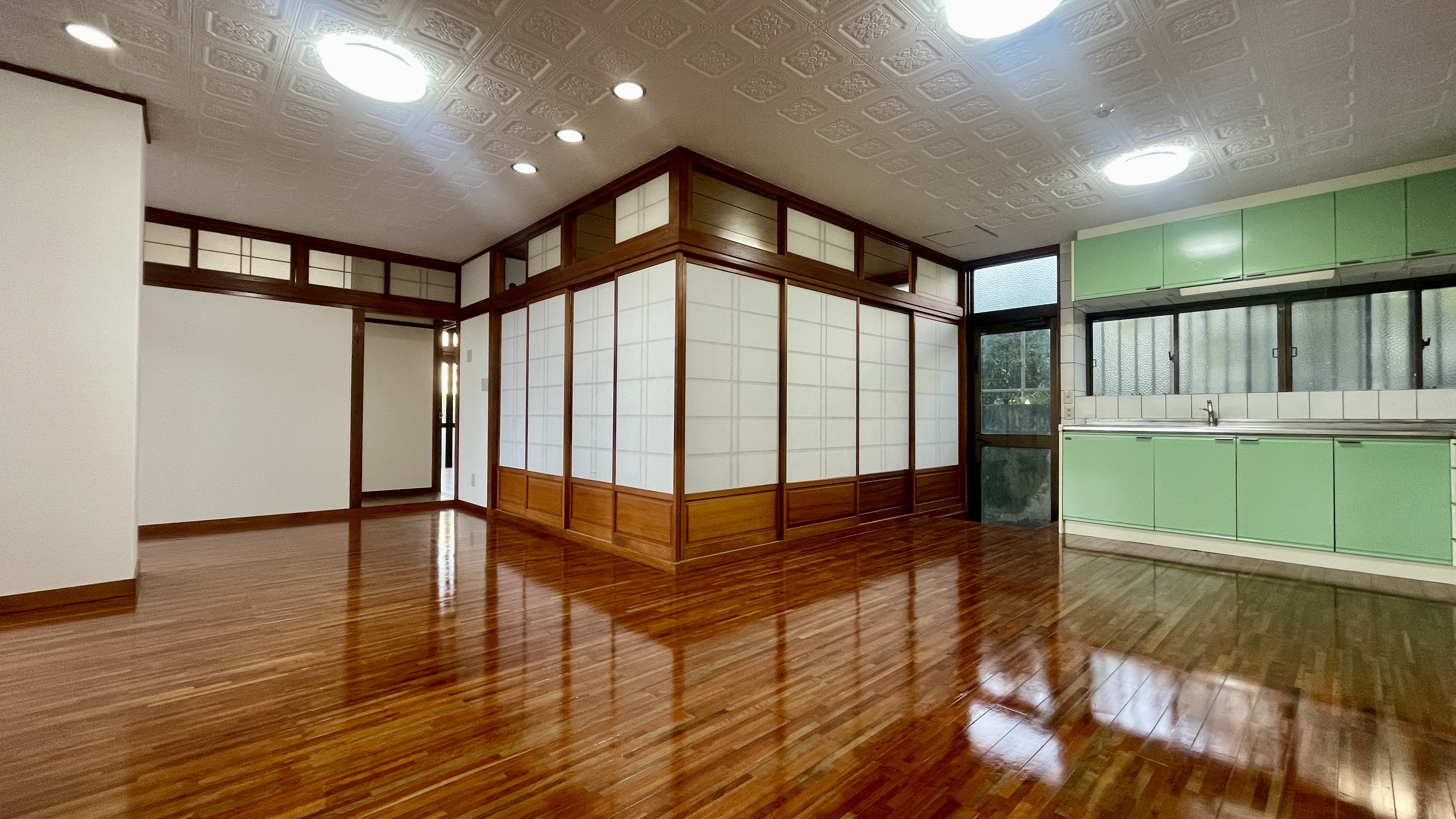 不思議な感情を抱いたまま玄関を開けると広大なリビングと、グリーンのキッチンが待ち構えていました。