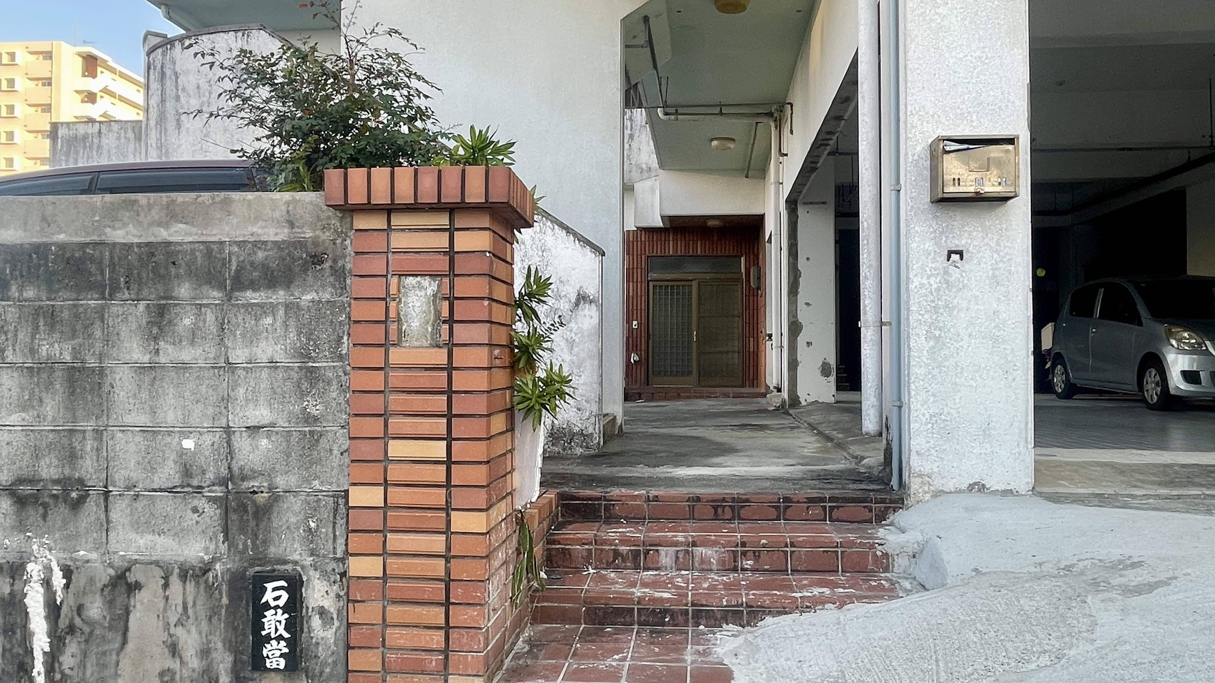 下駄履きの駐車場とタイルの門柱がお出迎え。