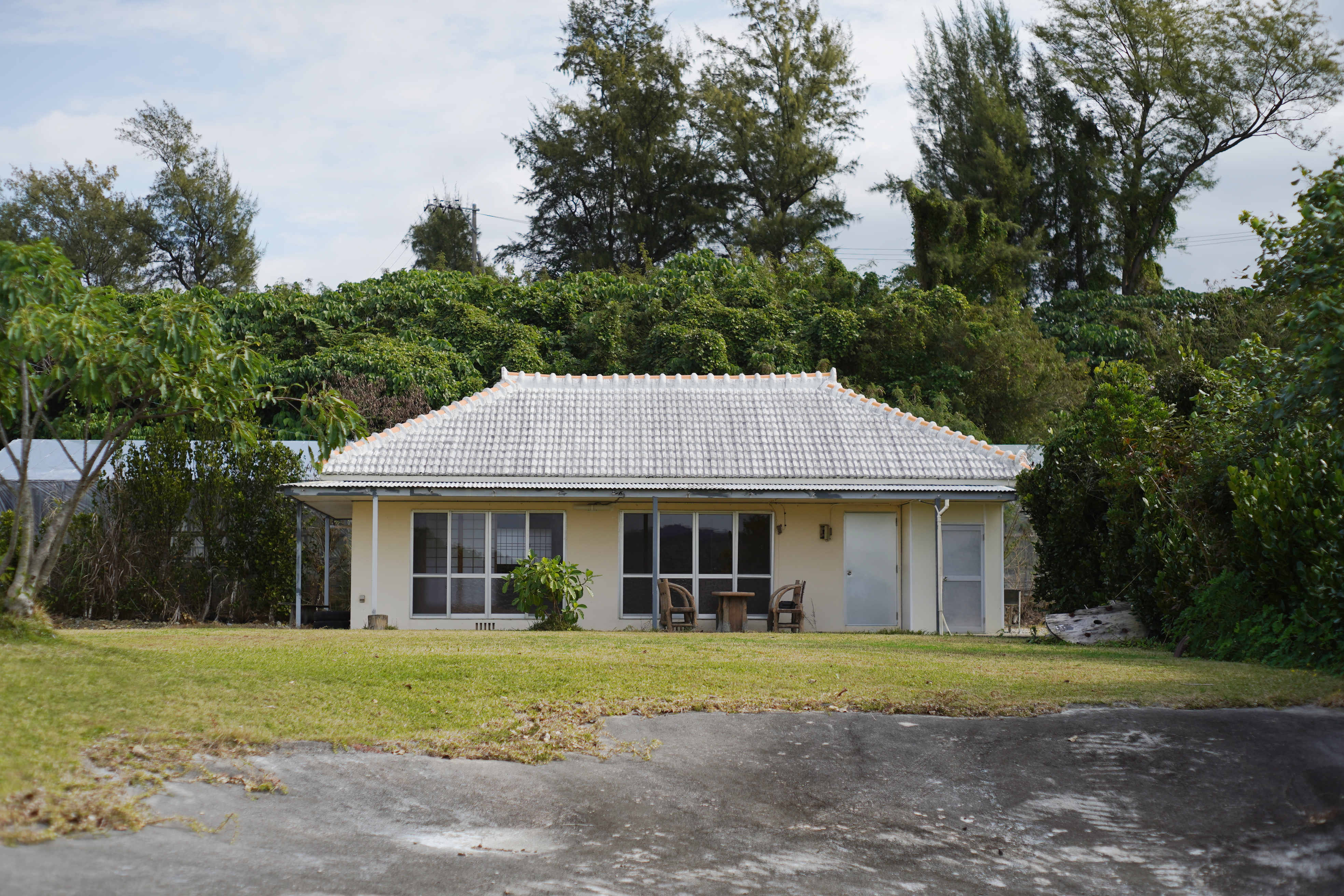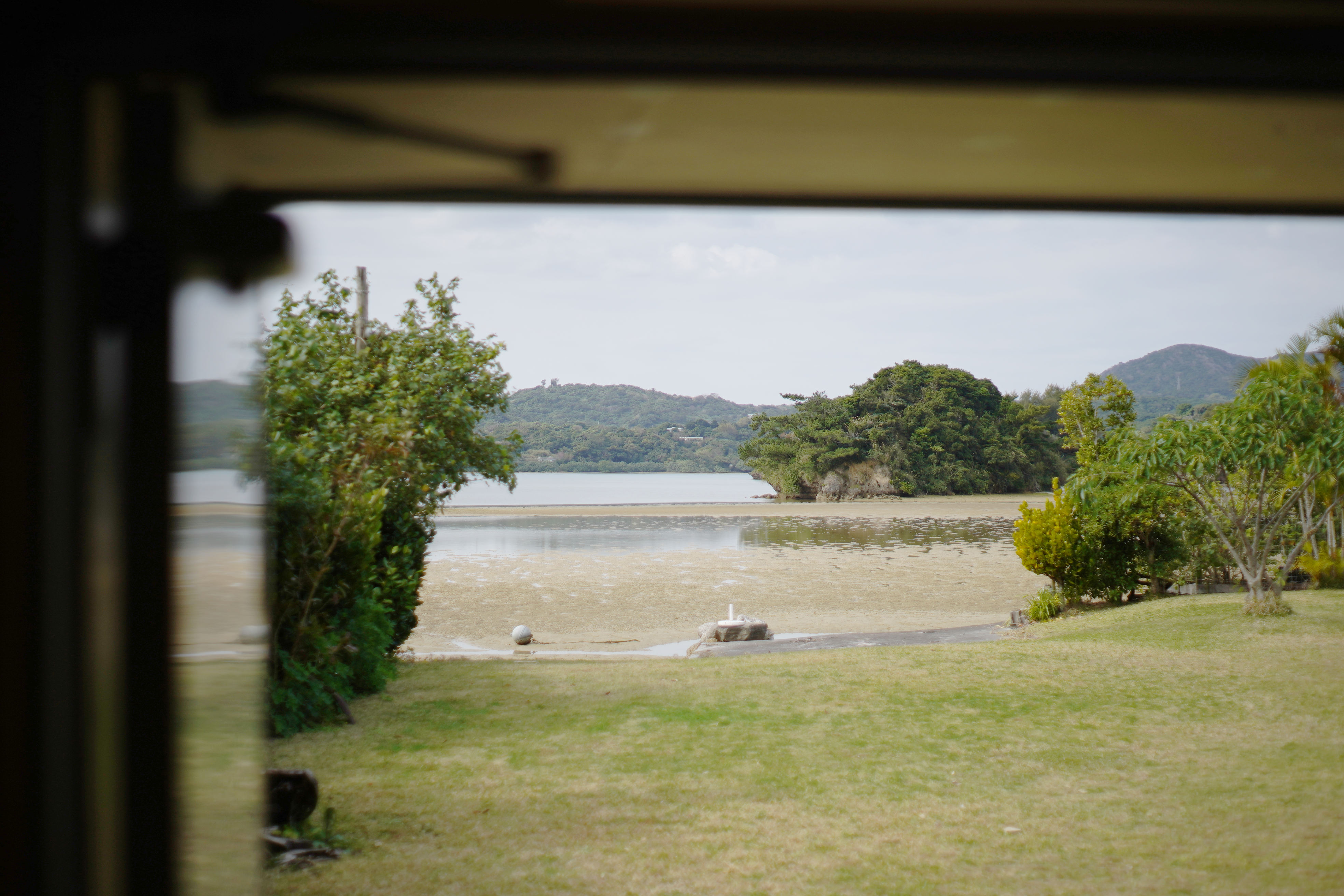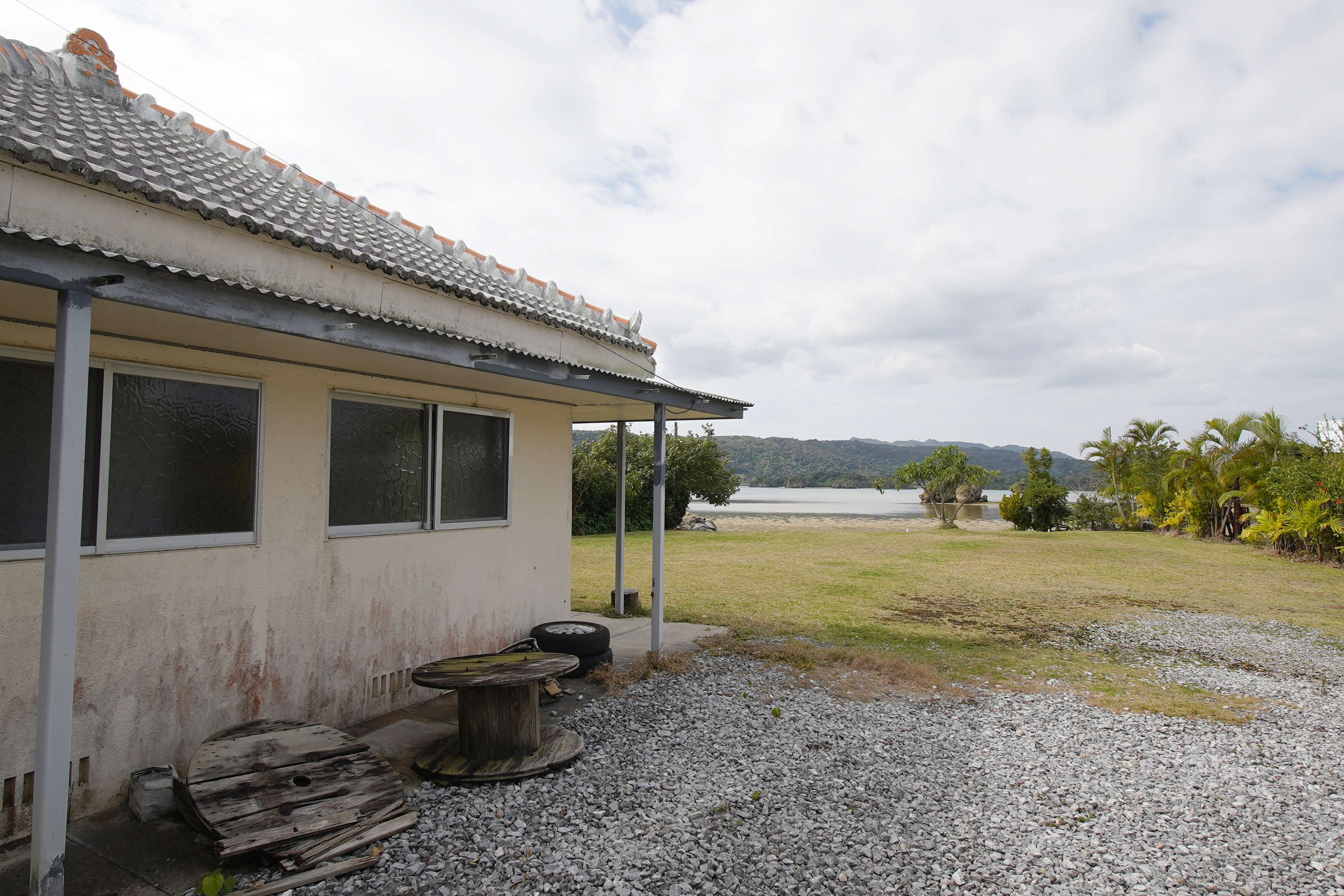 ポツンと佇む古民家。その先に広がる落ち着いた雰囲気の羽地内海。