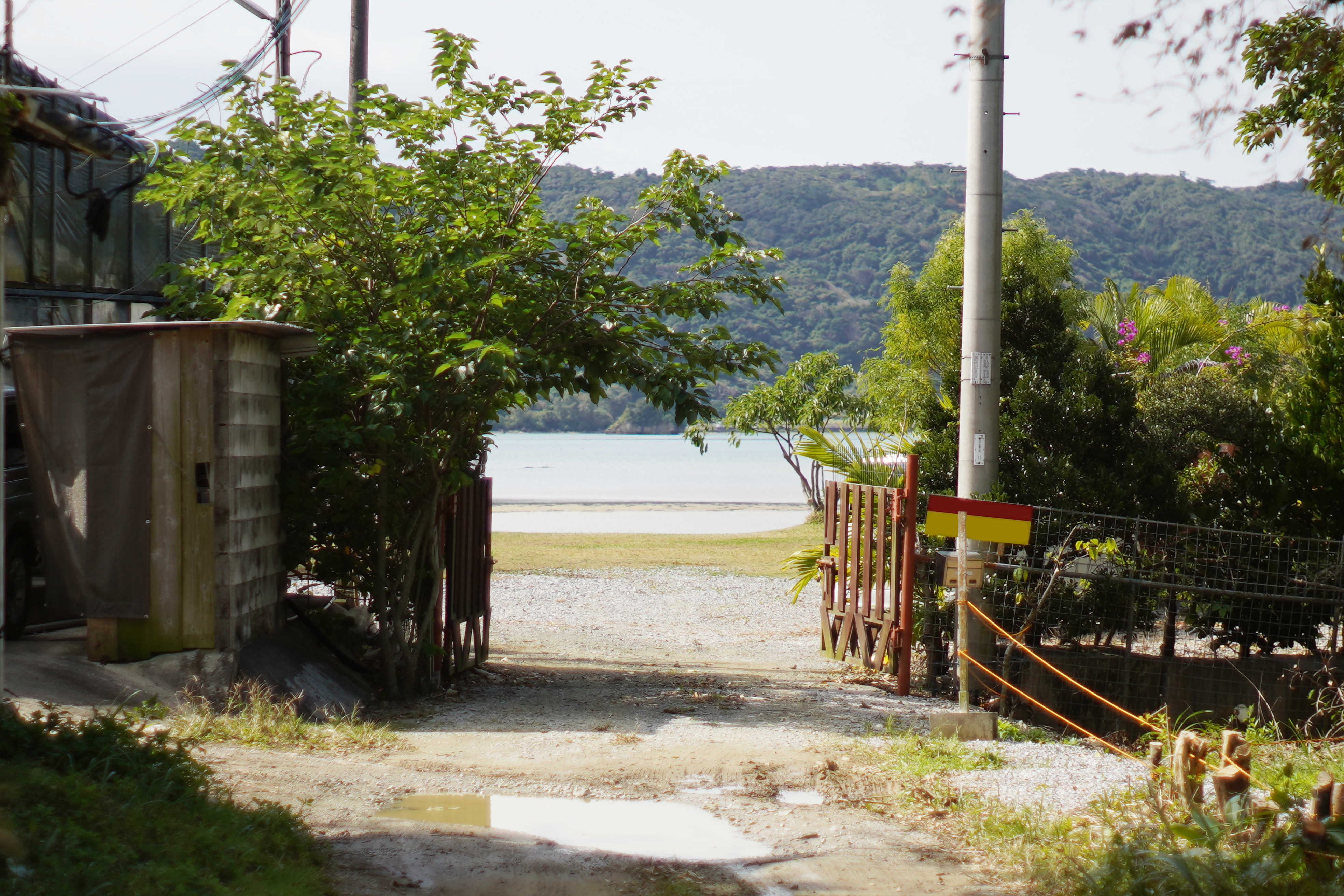 島の中のわき道に入ると砂利道に。その先をさらに進んでいくと、芝生の向こうに海が見えてきます。