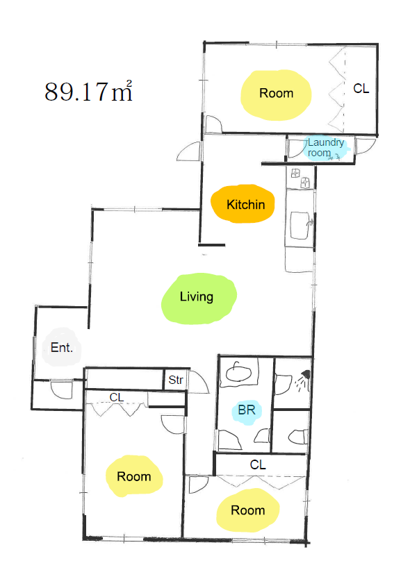 ざっくりと説明をすると、開放的なリビングが中央にあり、右へ行けば居室とバスルーム、左へ行けばキッチンと居室といった感じです。