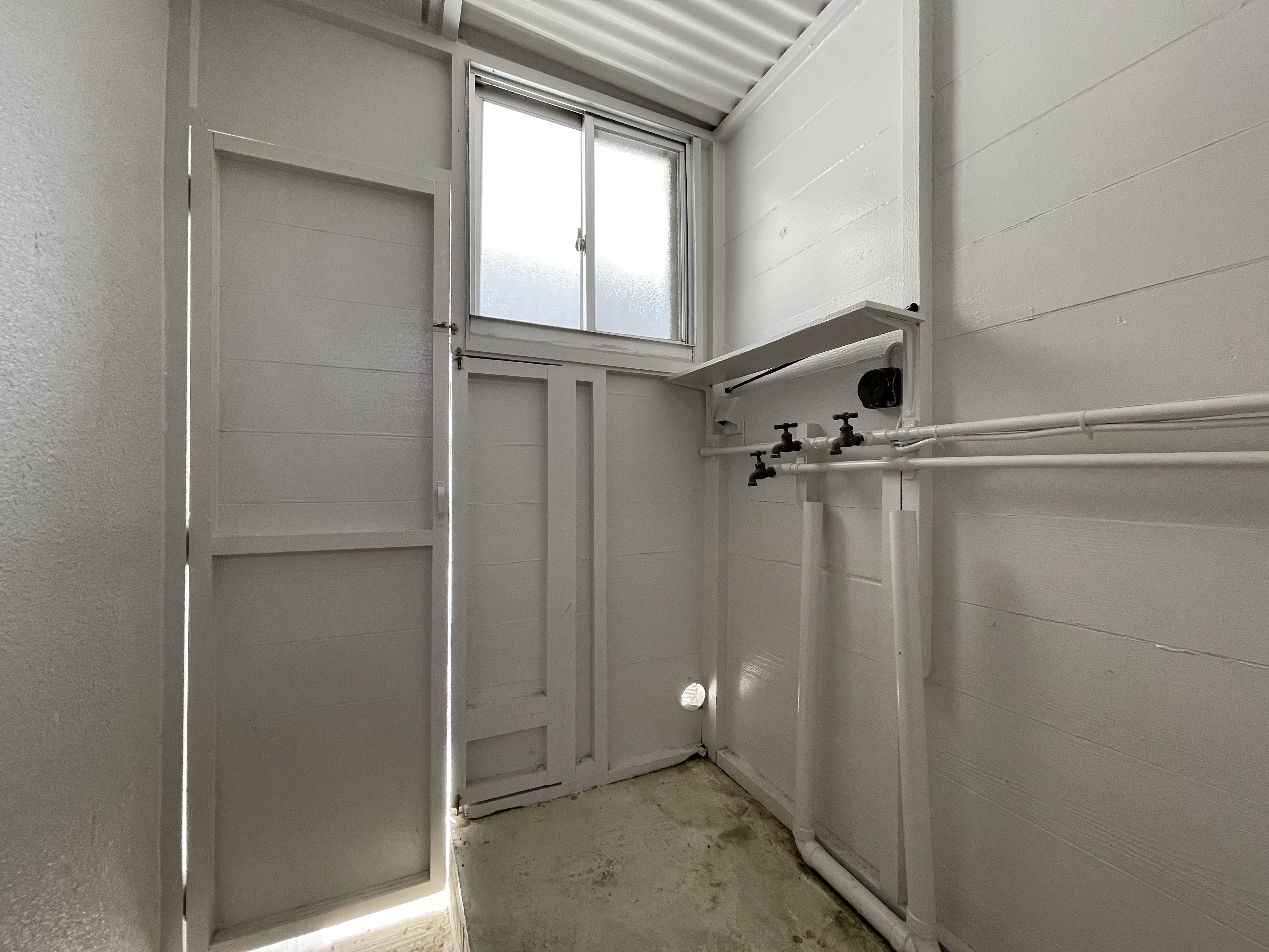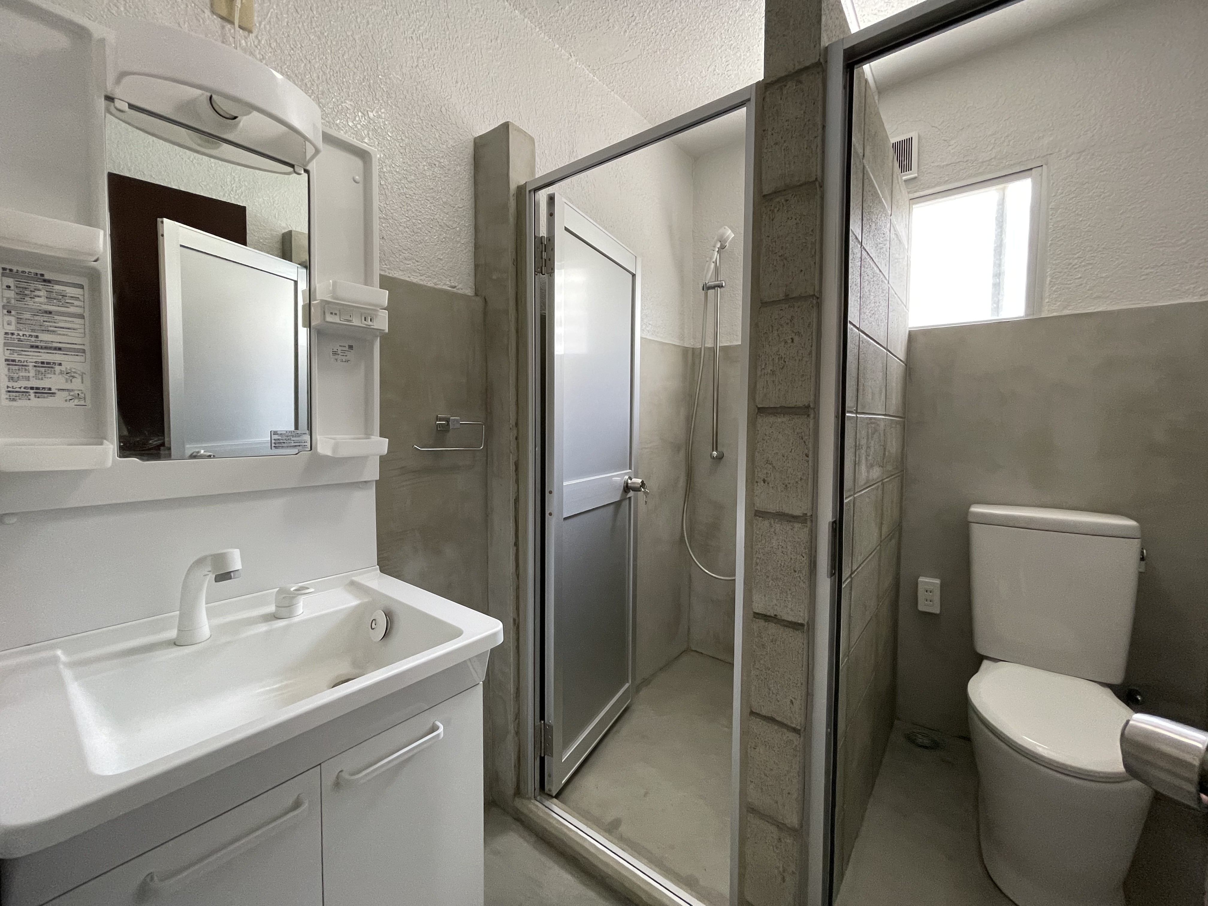 水回りは便利な三面鏡の独立洗面台に、シャワー、トイレの3点セットがコンパクトにまとめられいます。