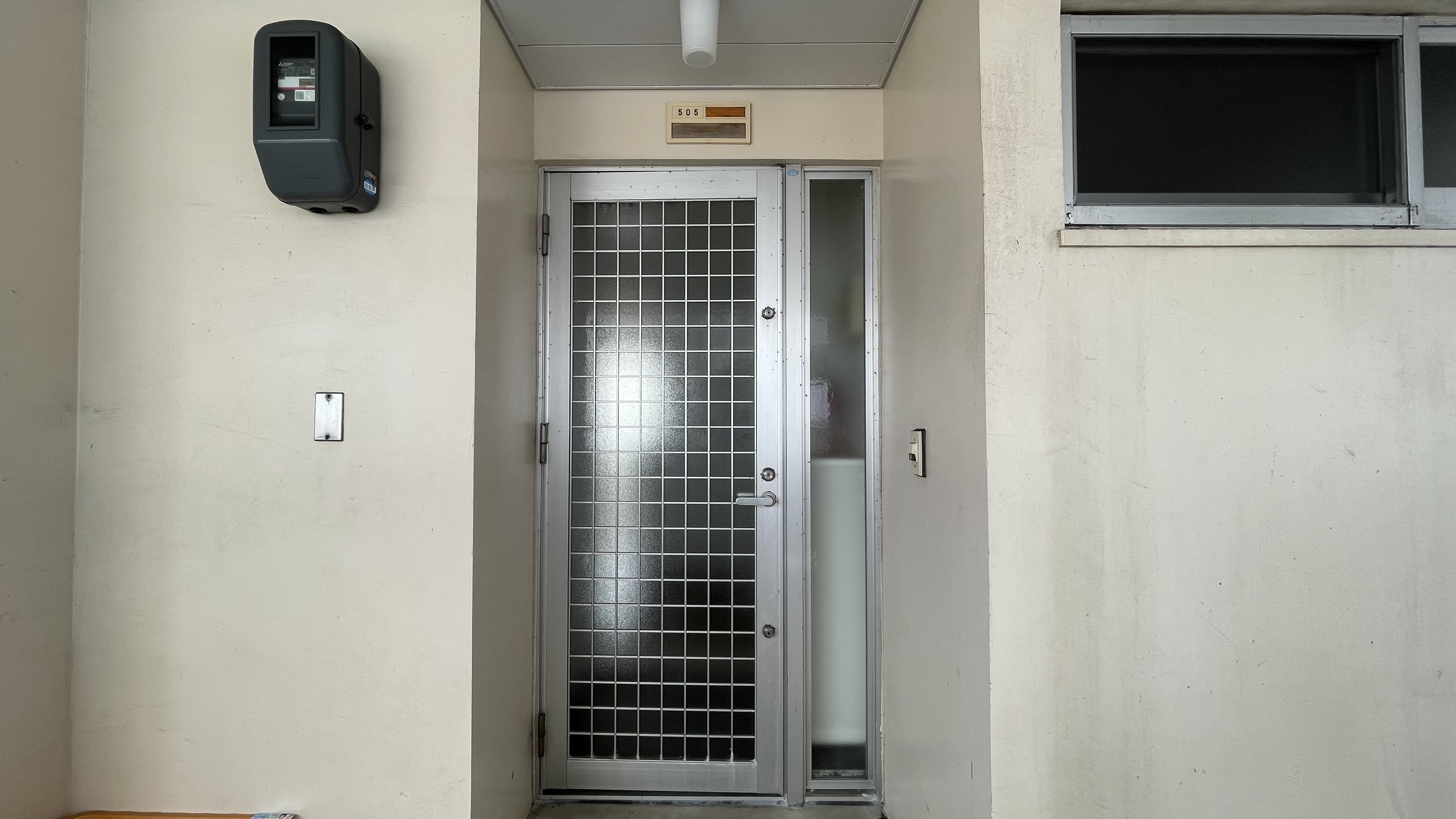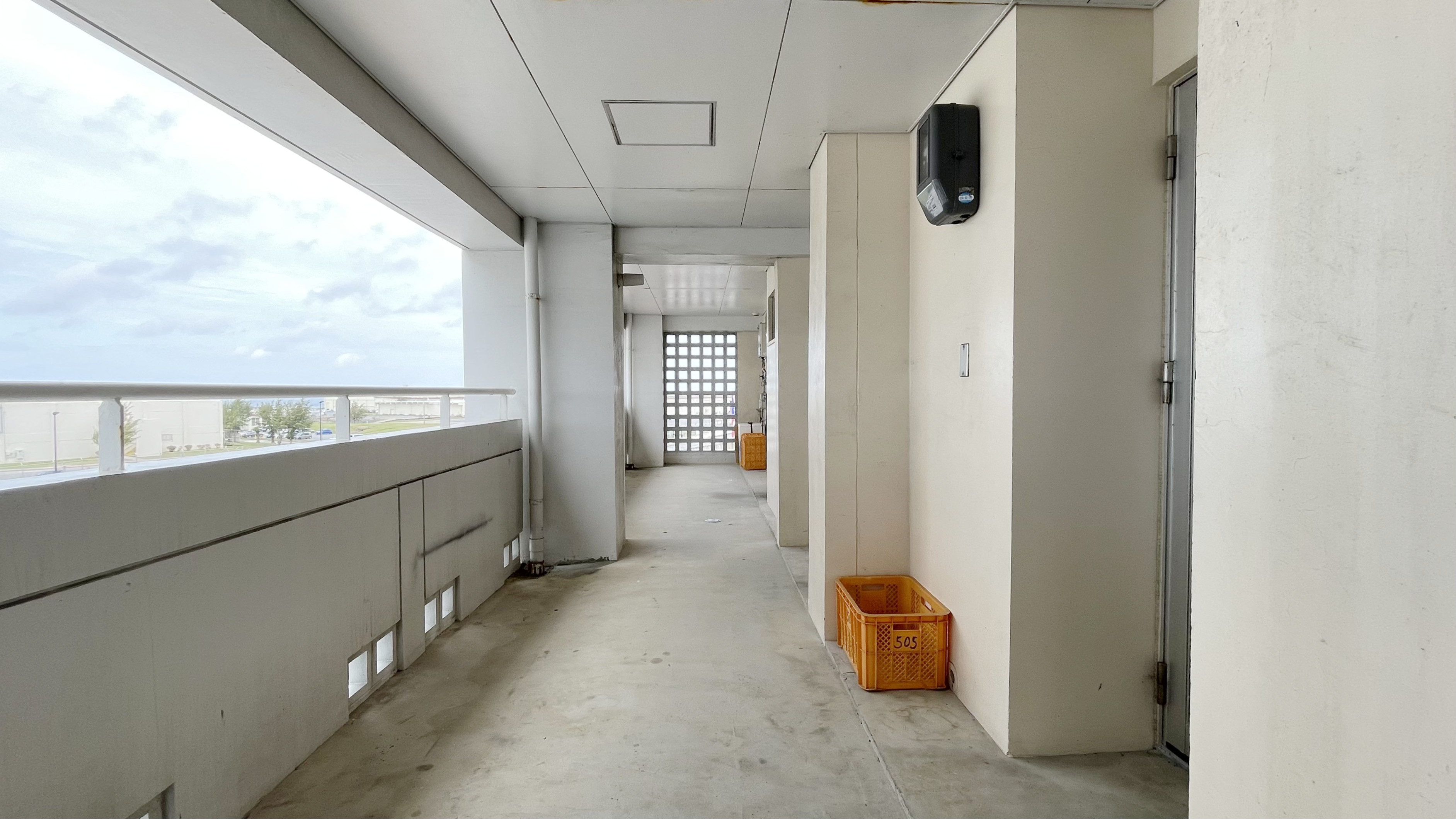玄関前には各住戸ごとに置かれたオレンジ色の籠は恐らくゴミ箱でしょうか。