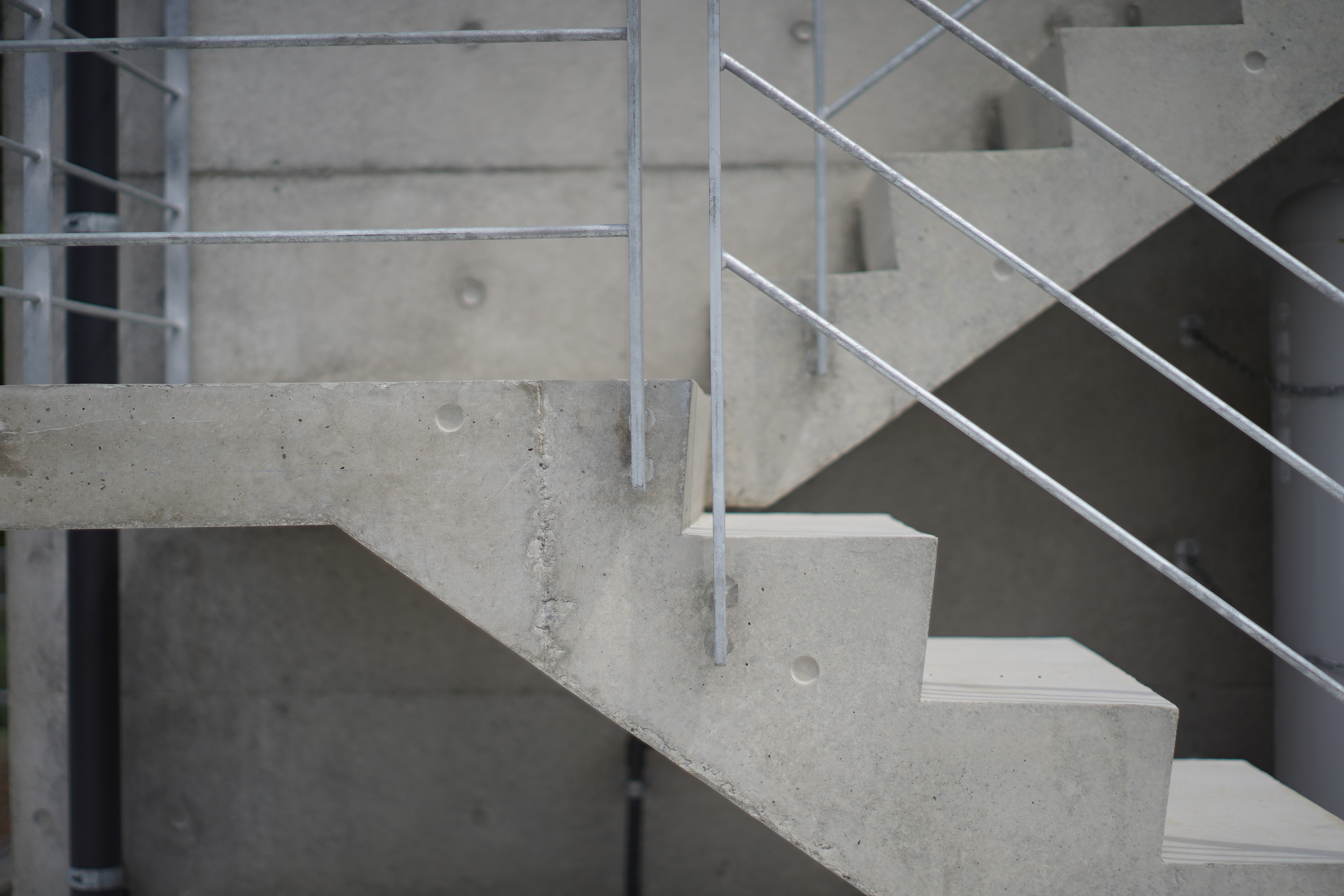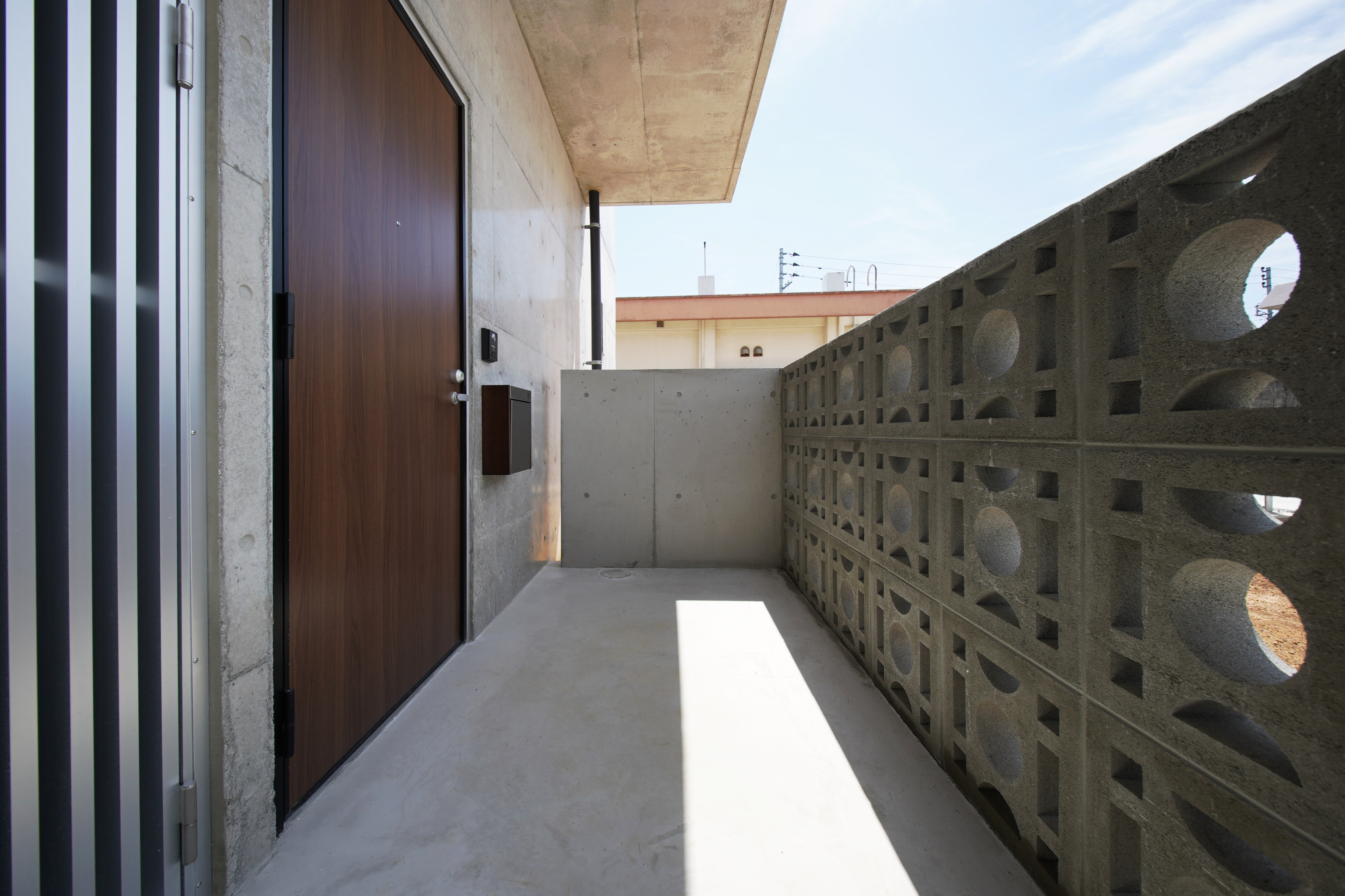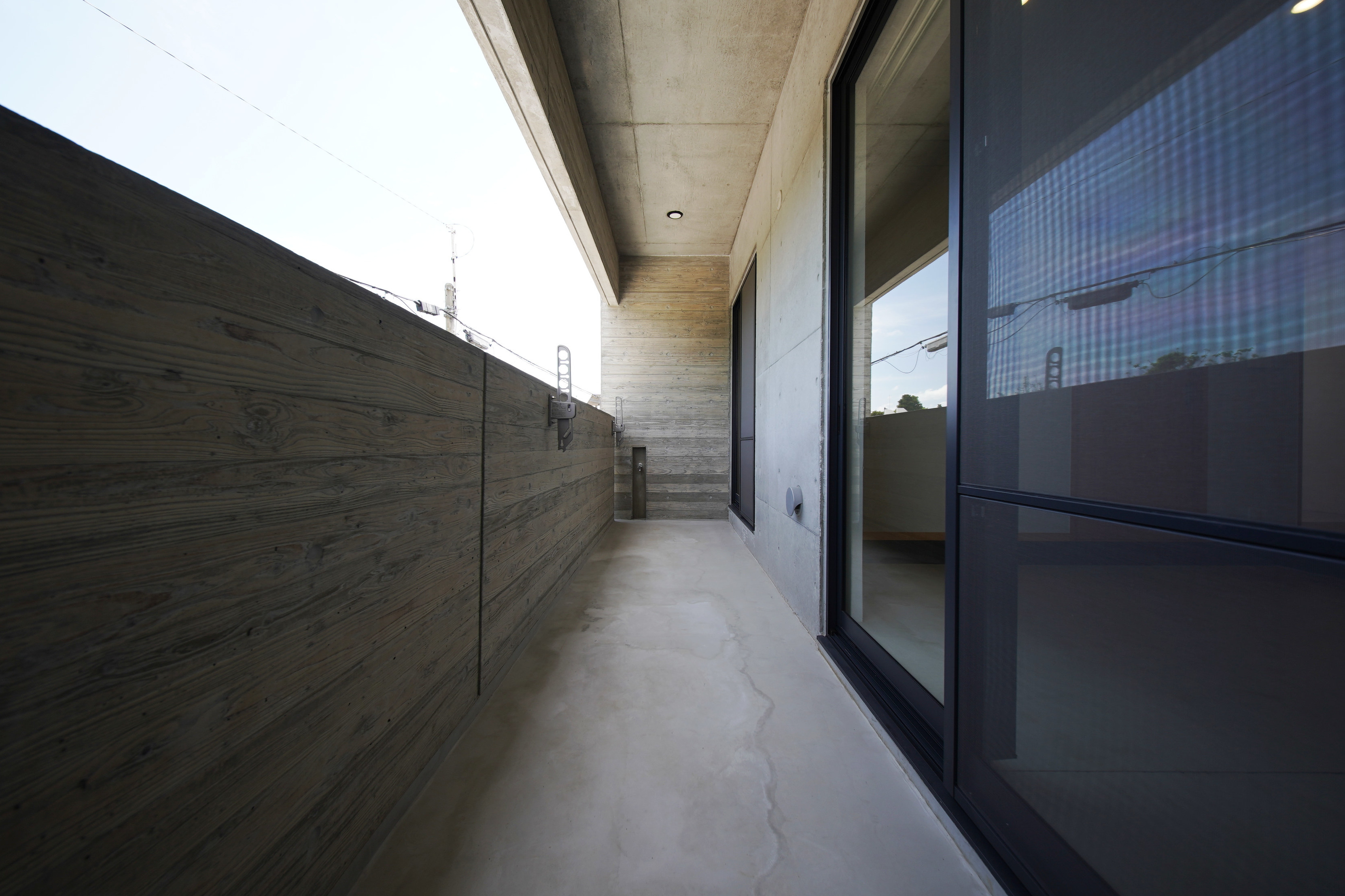 広ーいベランダには、壁面のコンクリートに木目が残る工法。
