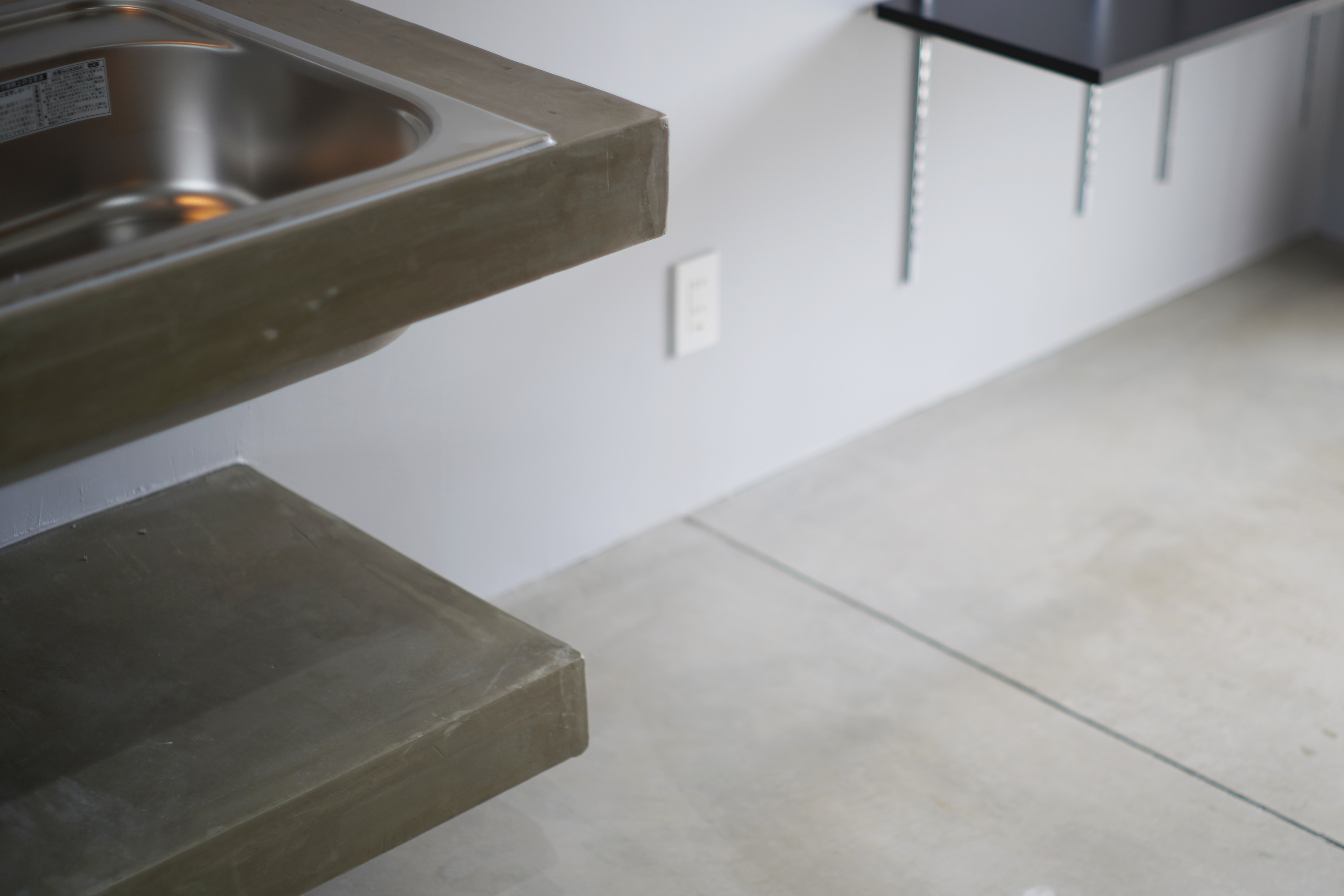 造作されたフローティングなキッチンは、至極シンプルながら圧倒的な存在感を放ちます。